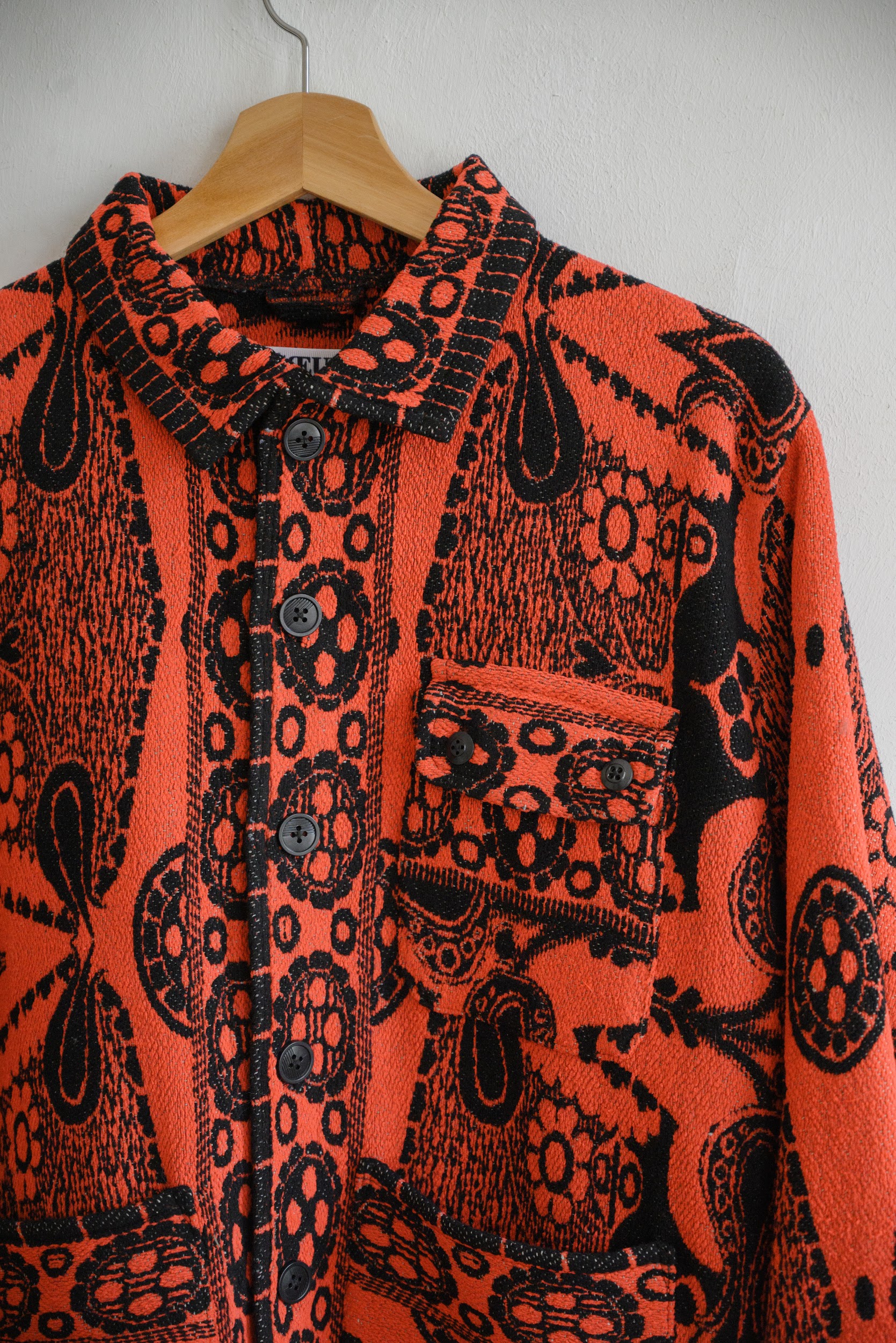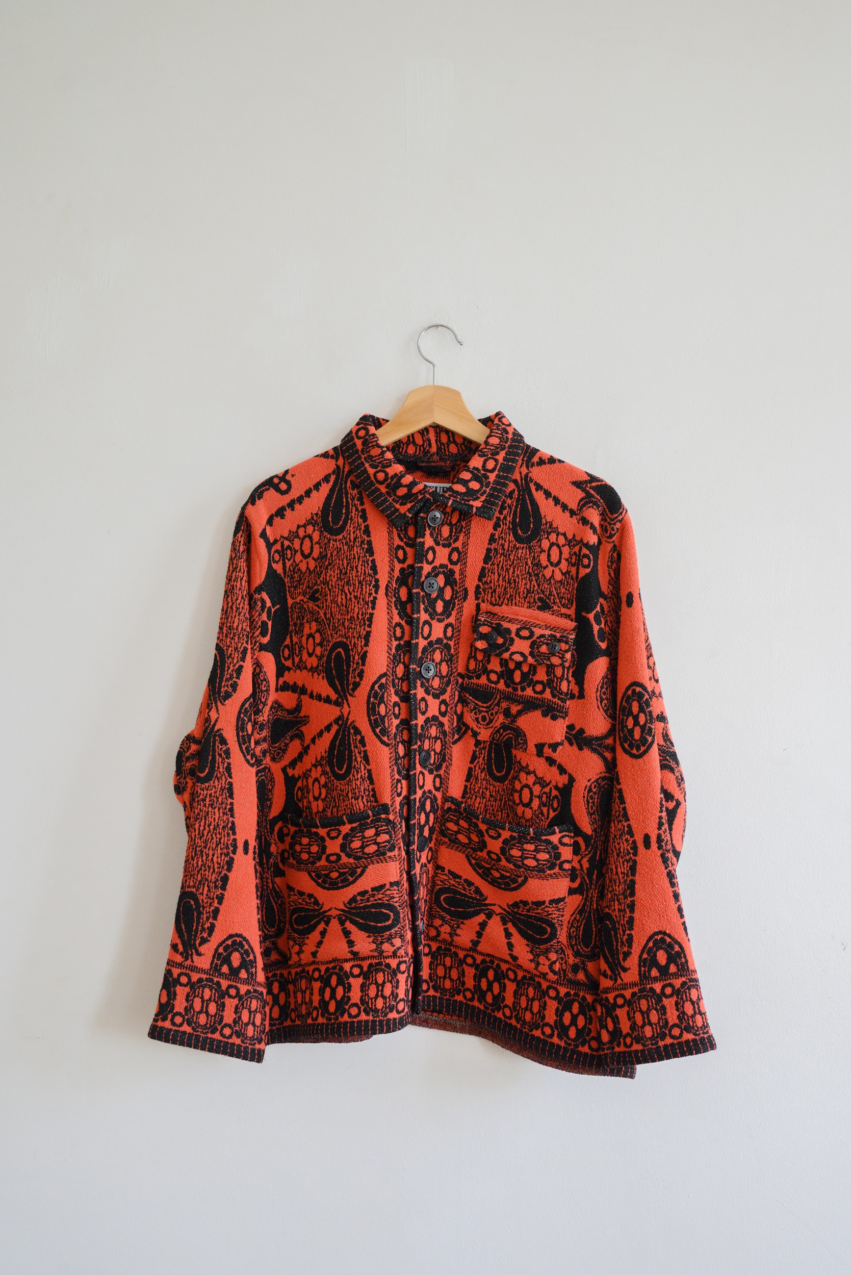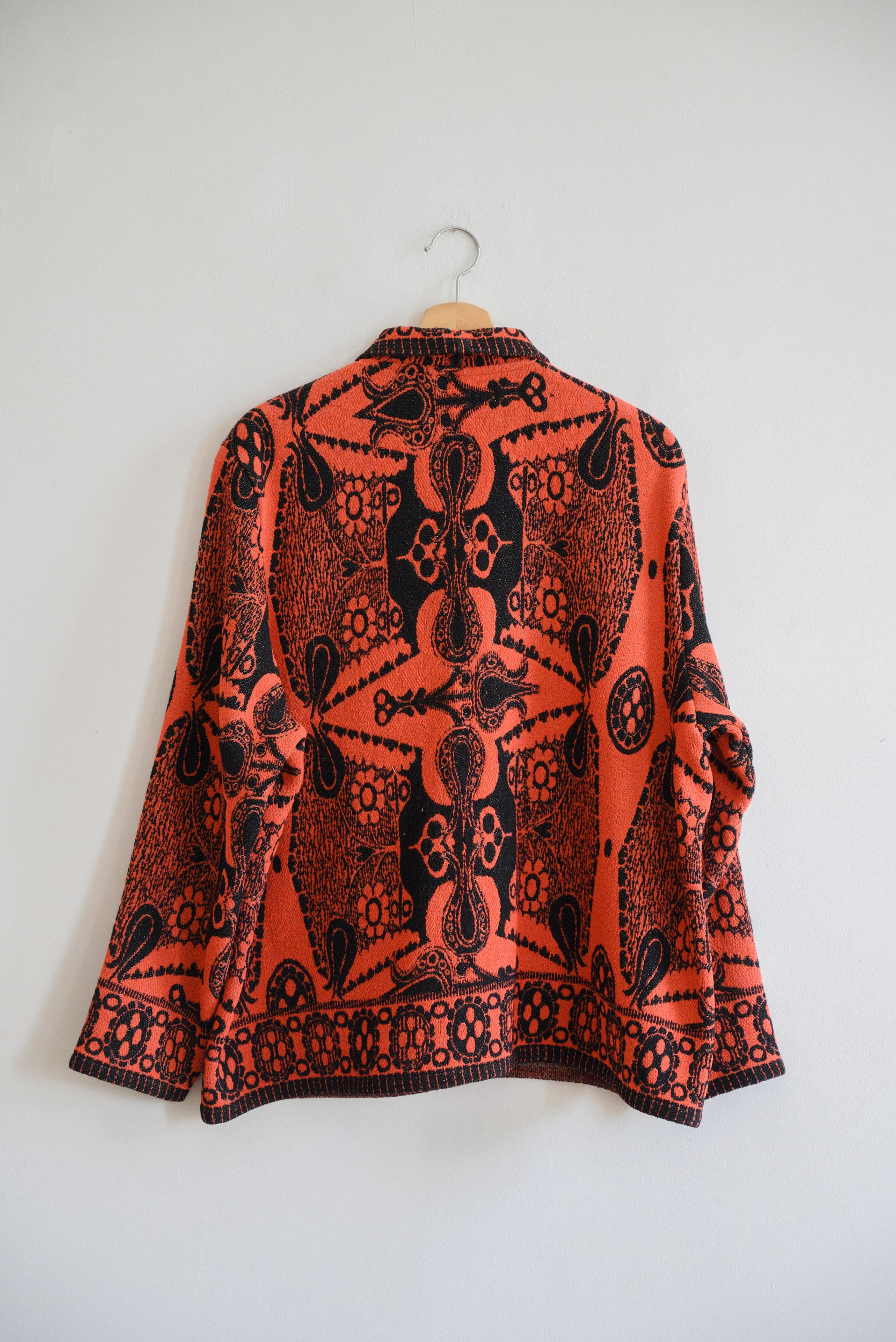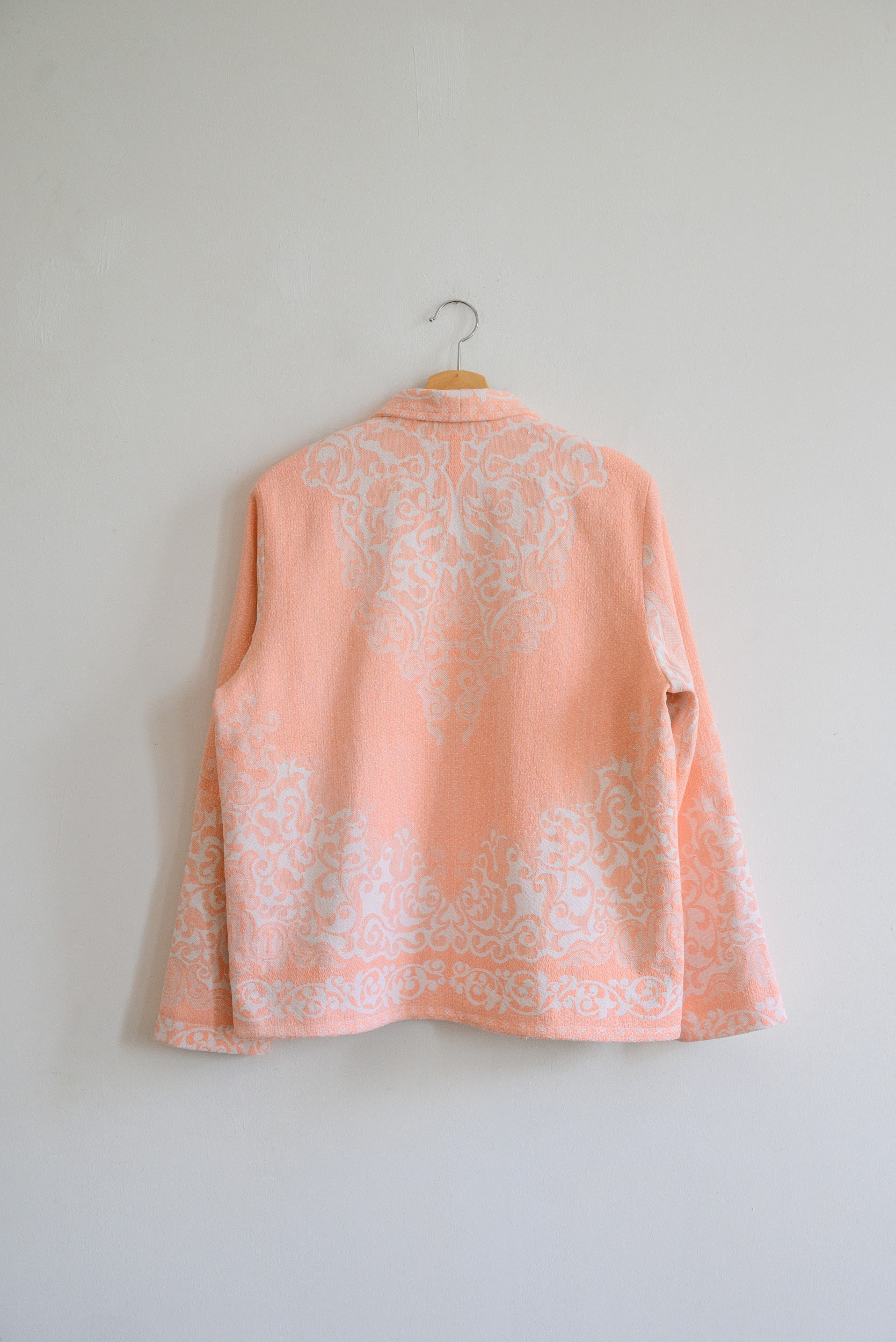 Пиджак сшит из хлопкового жаккардового покрывала с абстрактным принтом, периода 1980х годов.
