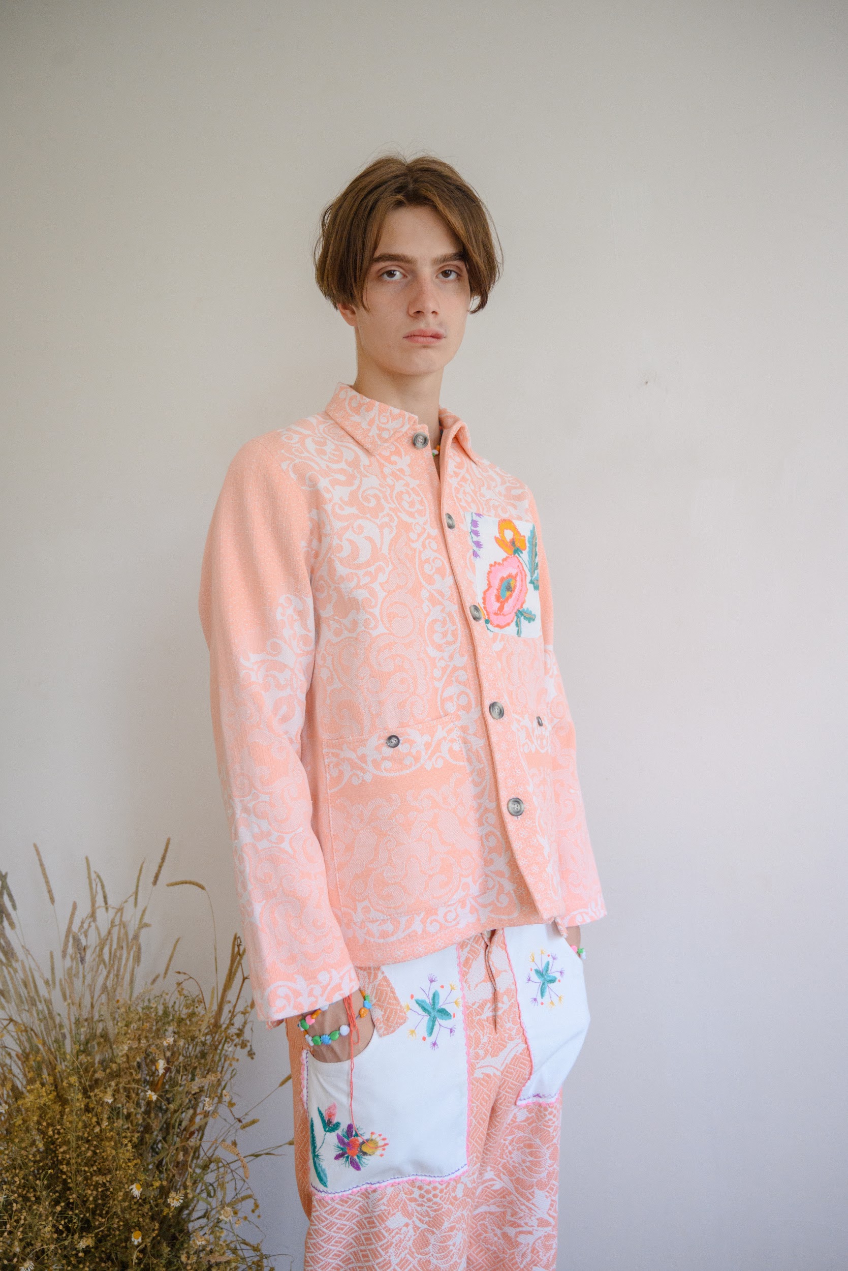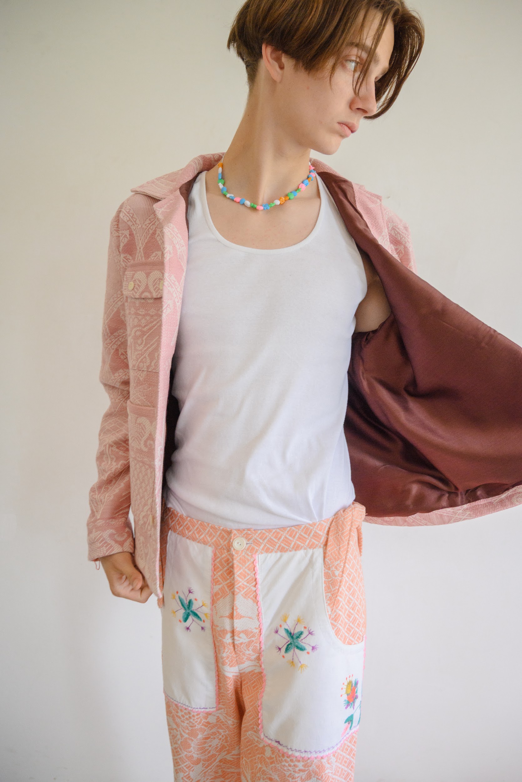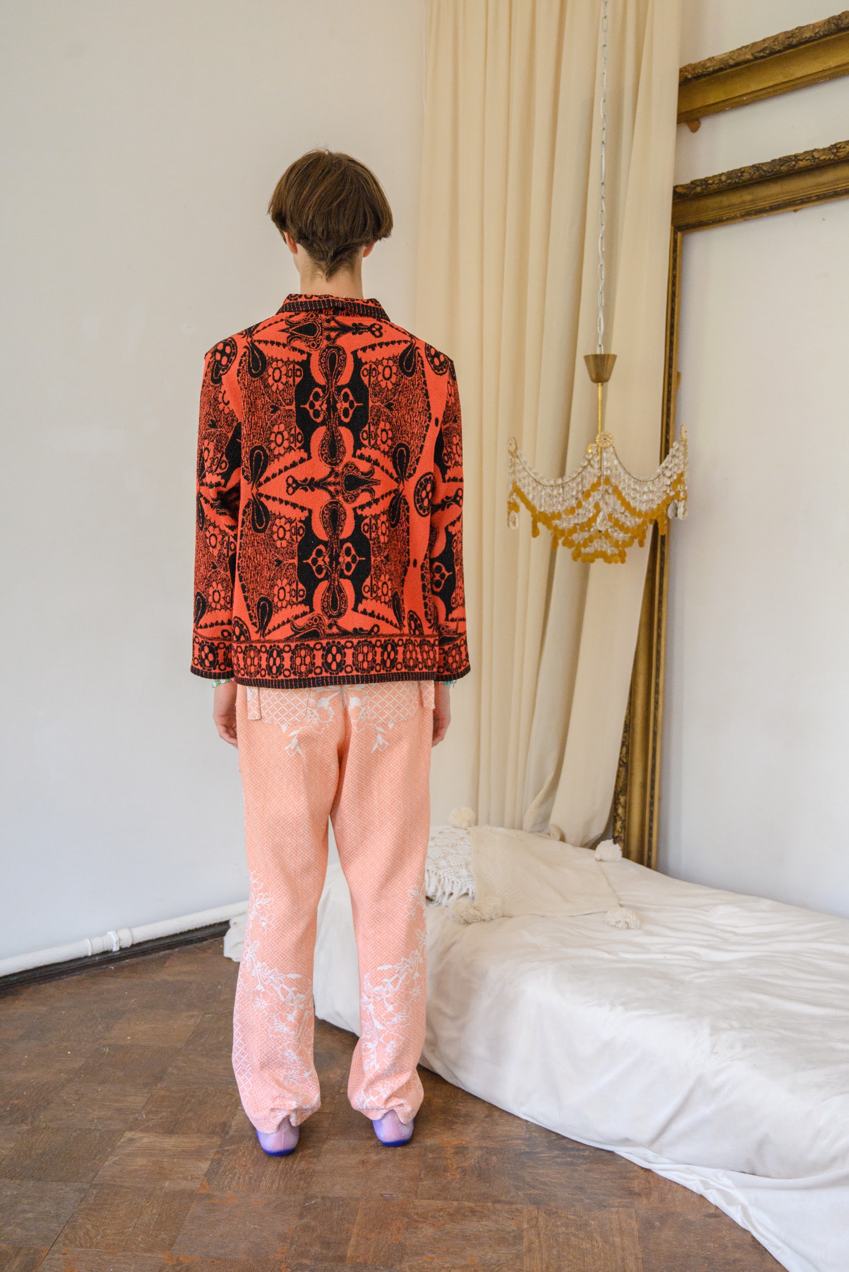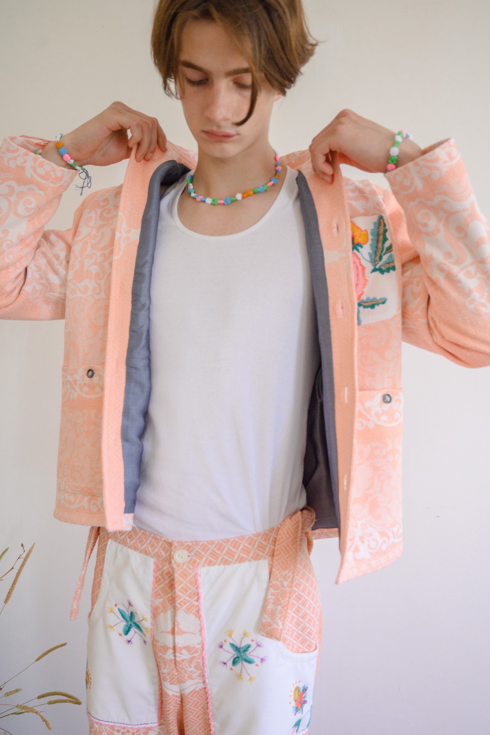 Пиджак сшит из хлопкового покрывала с абстрактным принтом, периода 1970х годов. Маленький карман выполнен из антикварной скатерти, расшитой вручную.