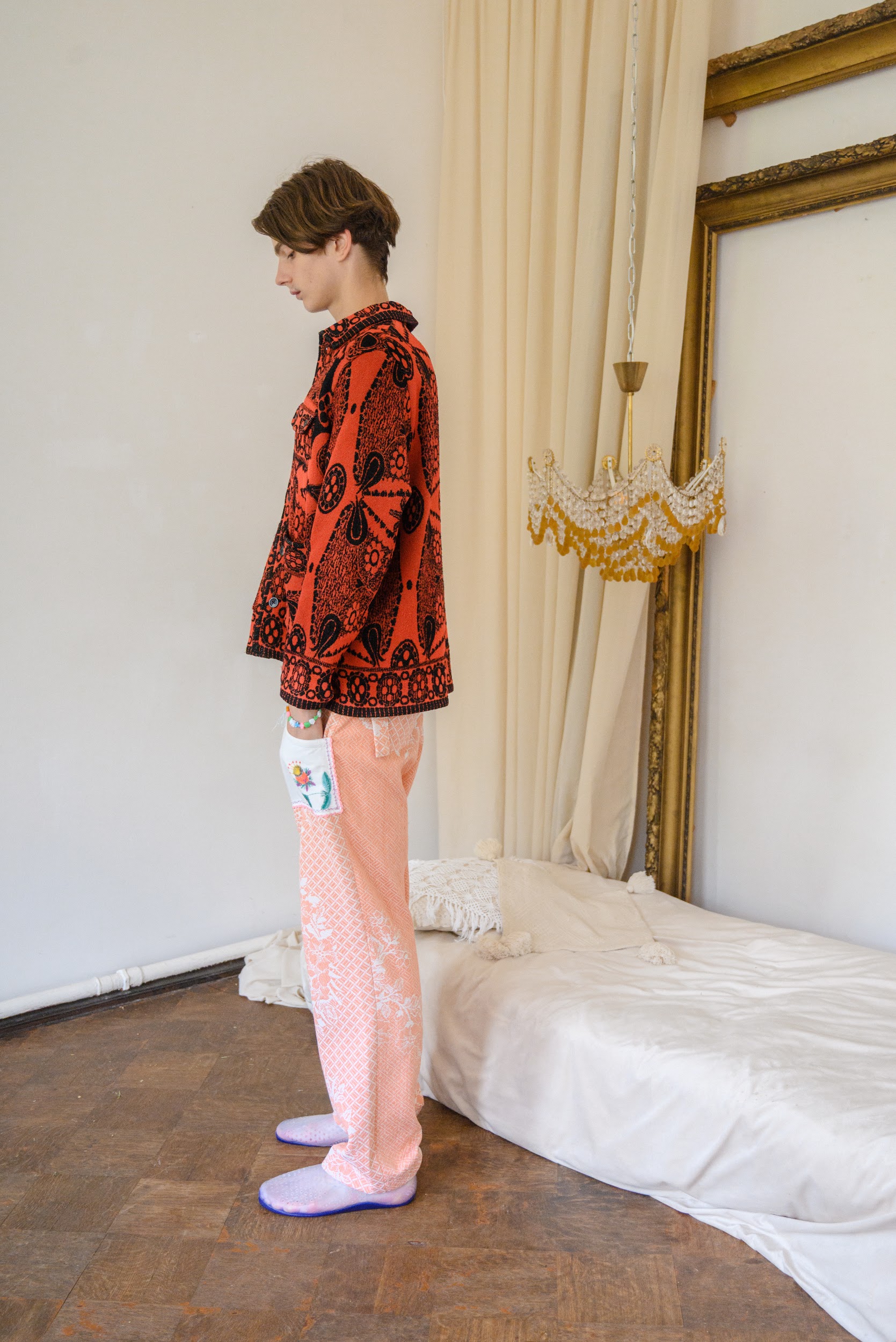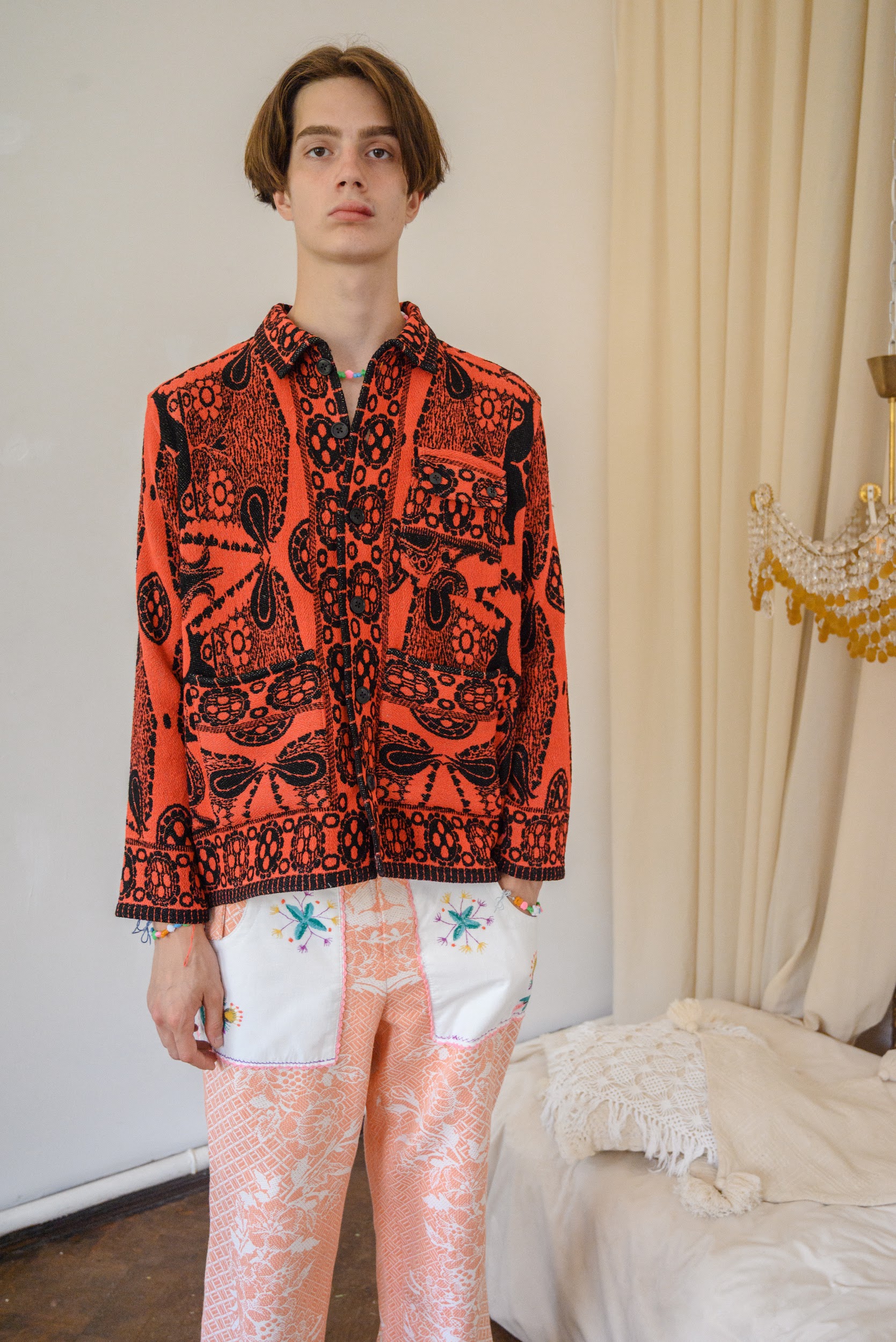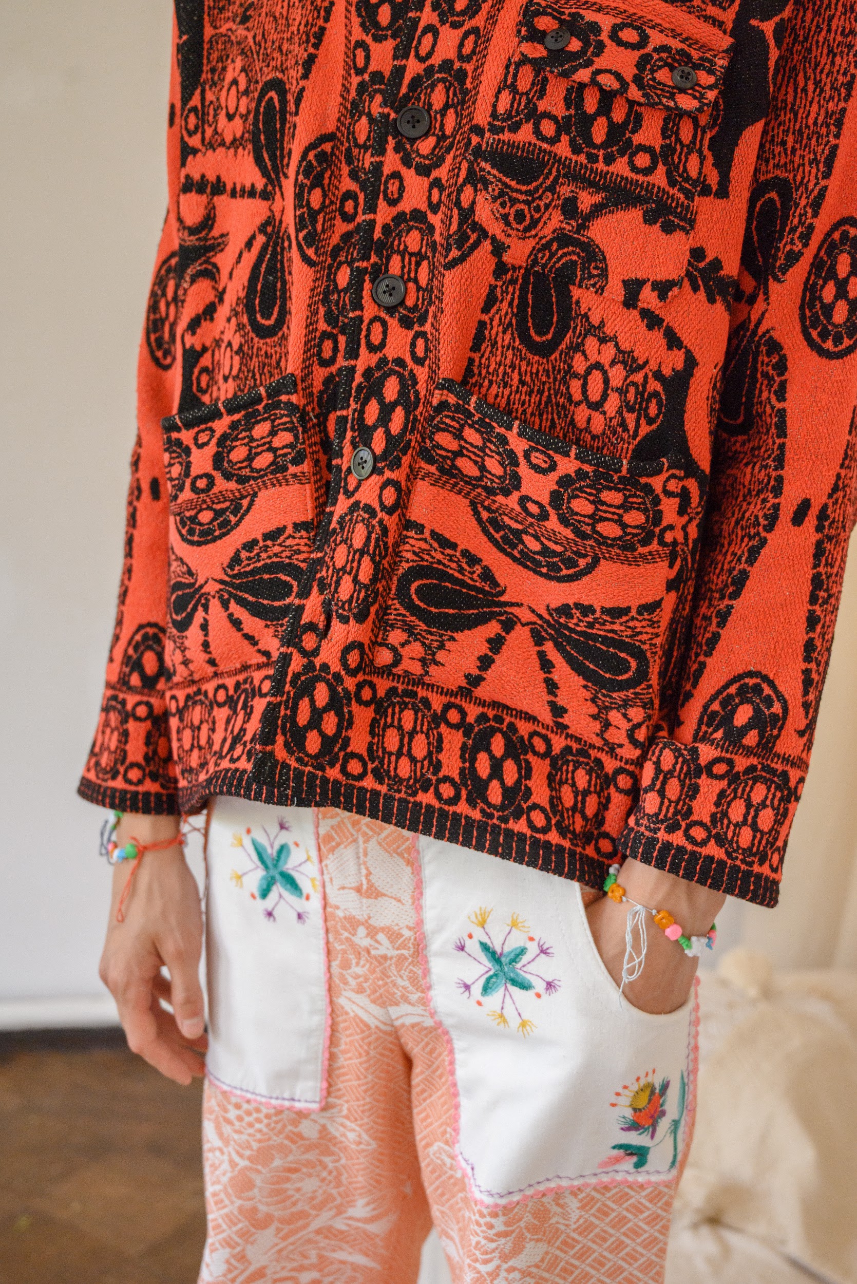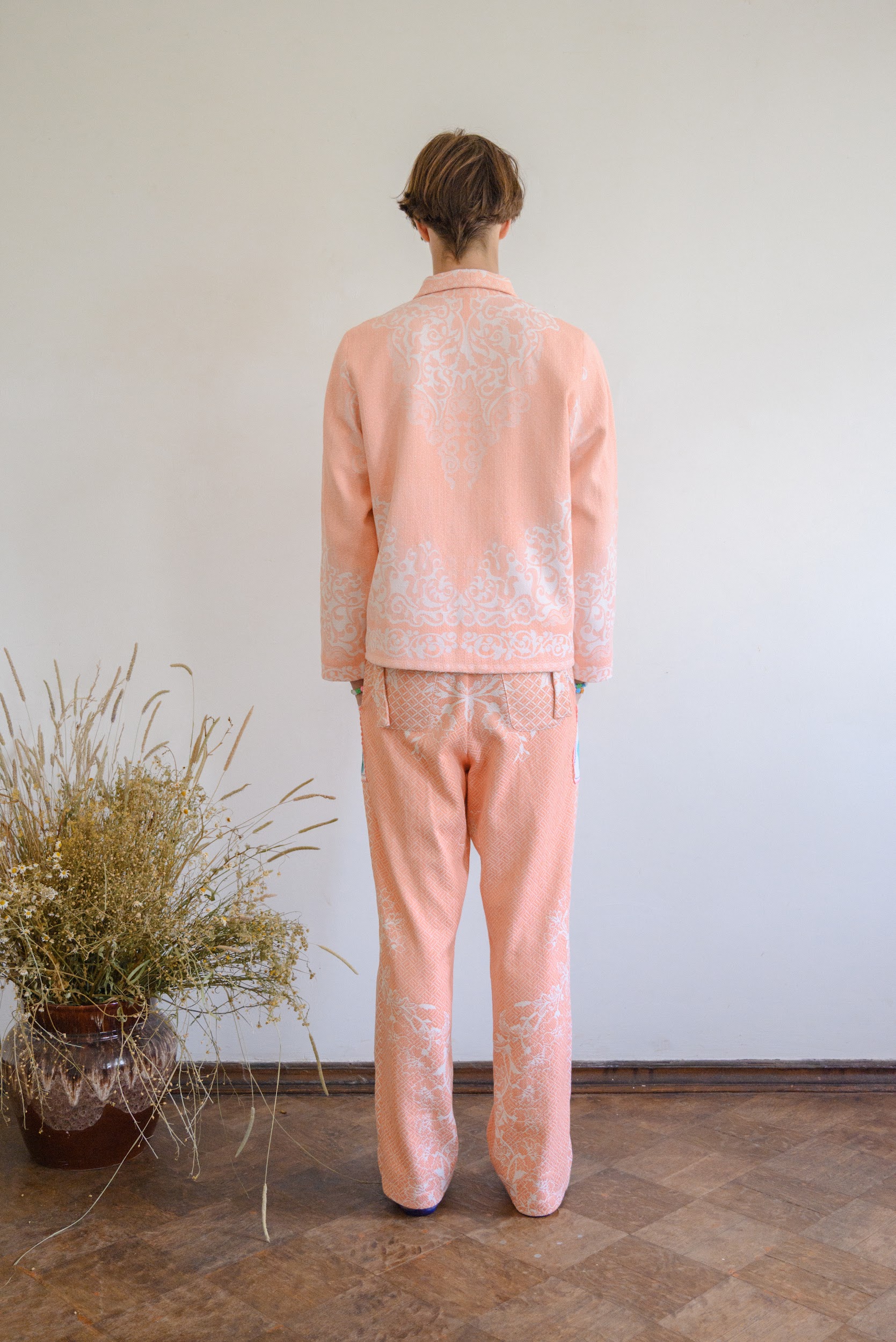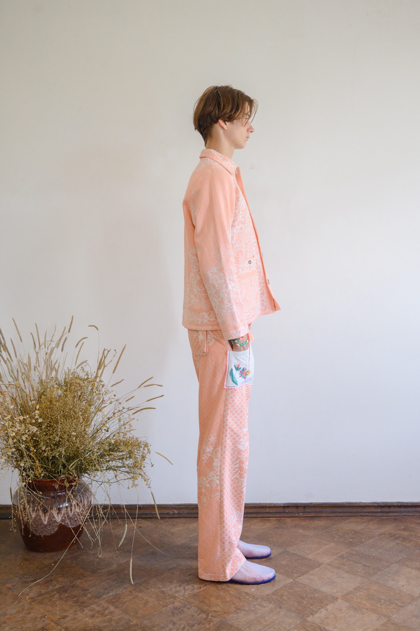 Пиджак сшит из хлопкового покрывала с абстрактным принтом, периода 1970х годов. Маленький карман выполнен из антикварной скатерти, расшитой вручную.