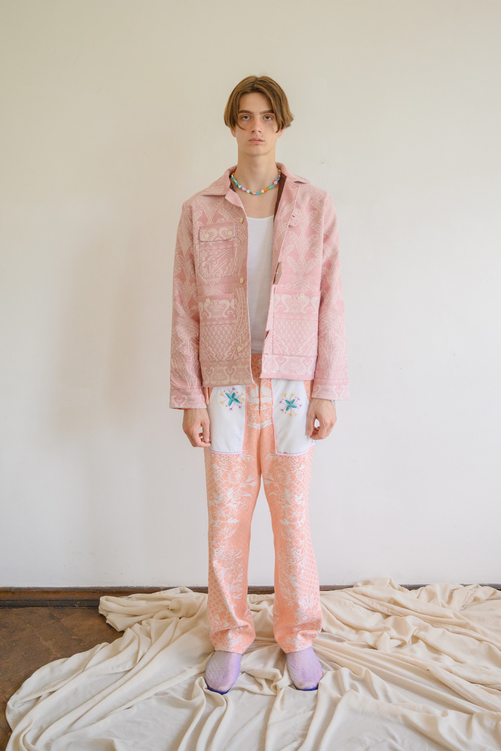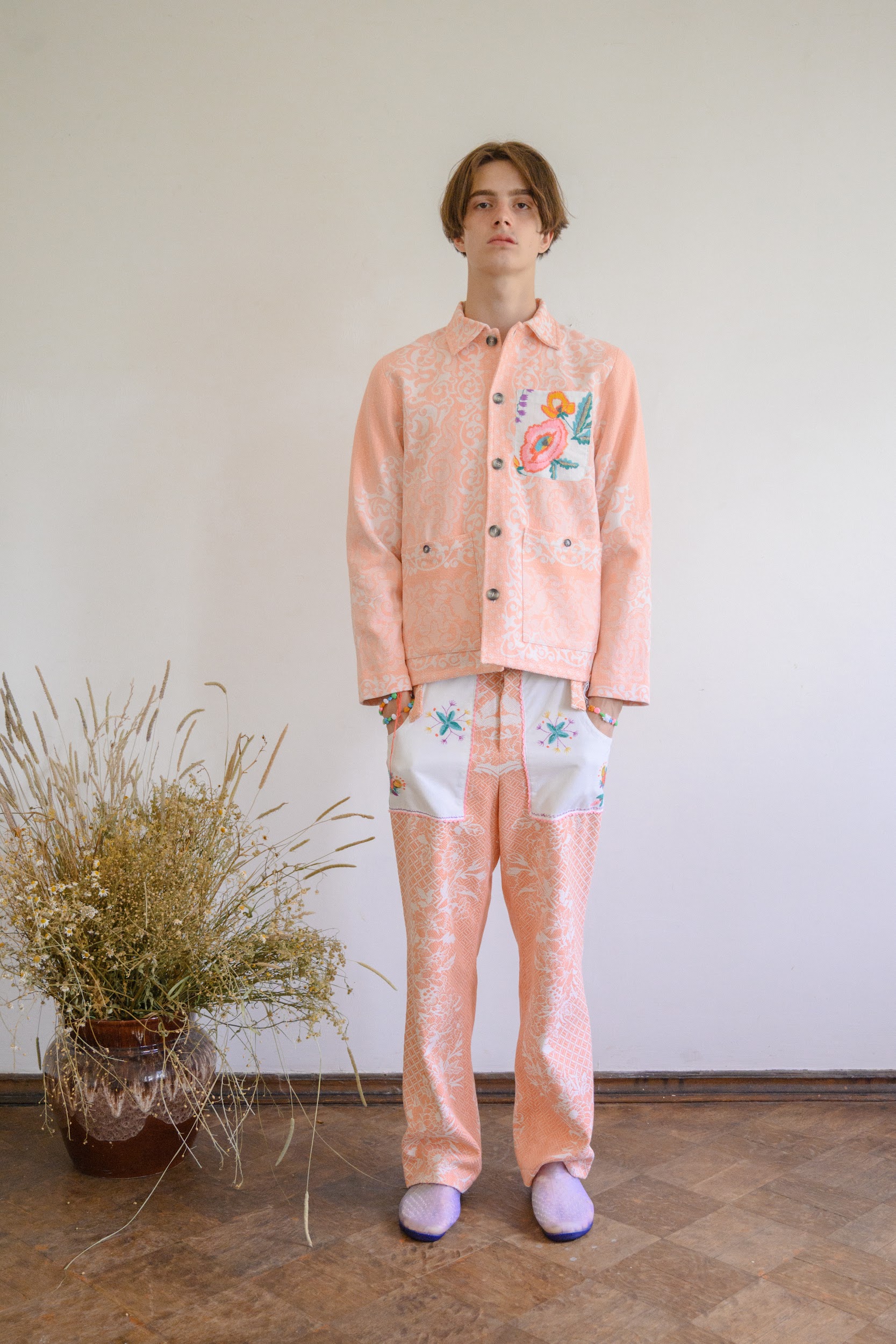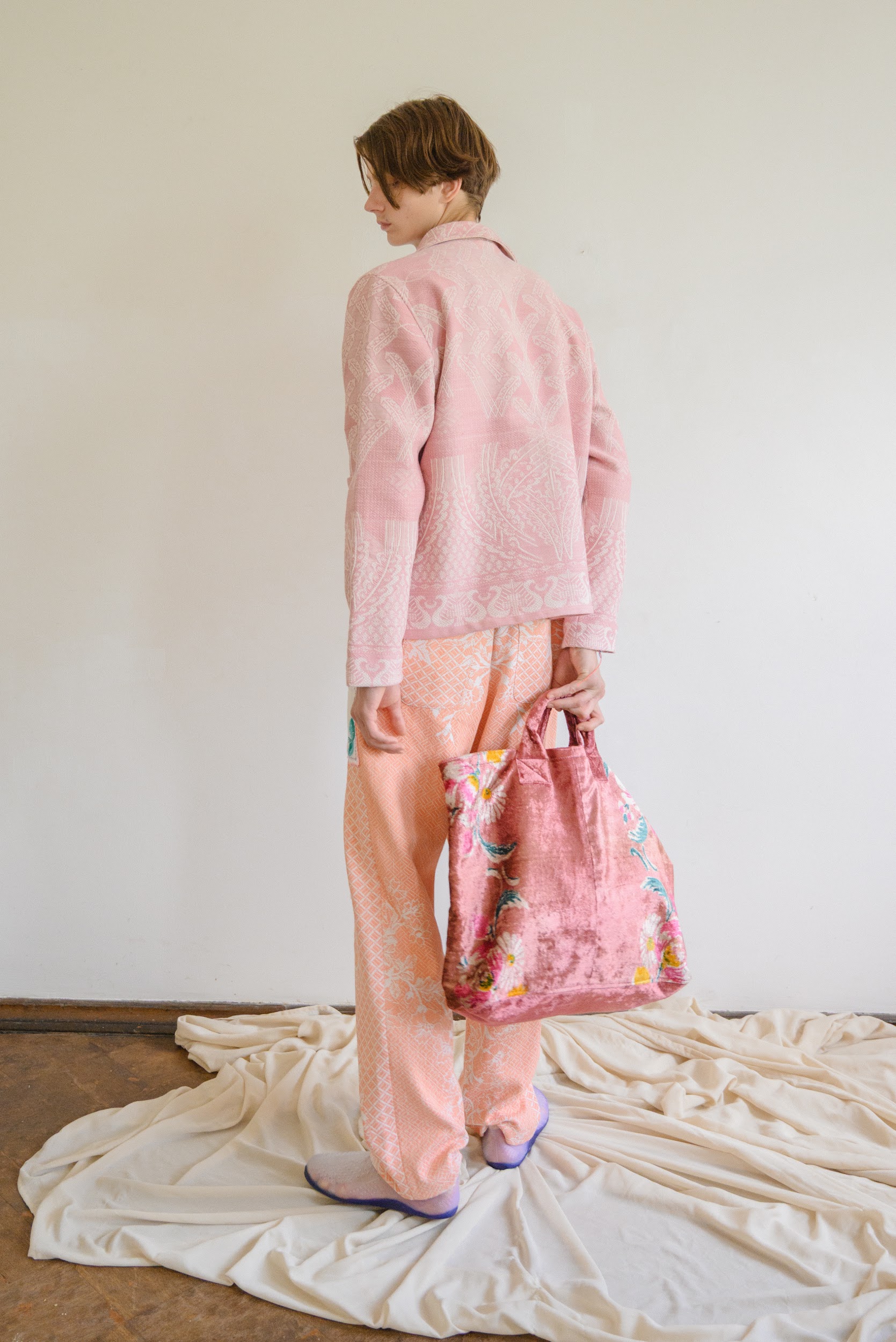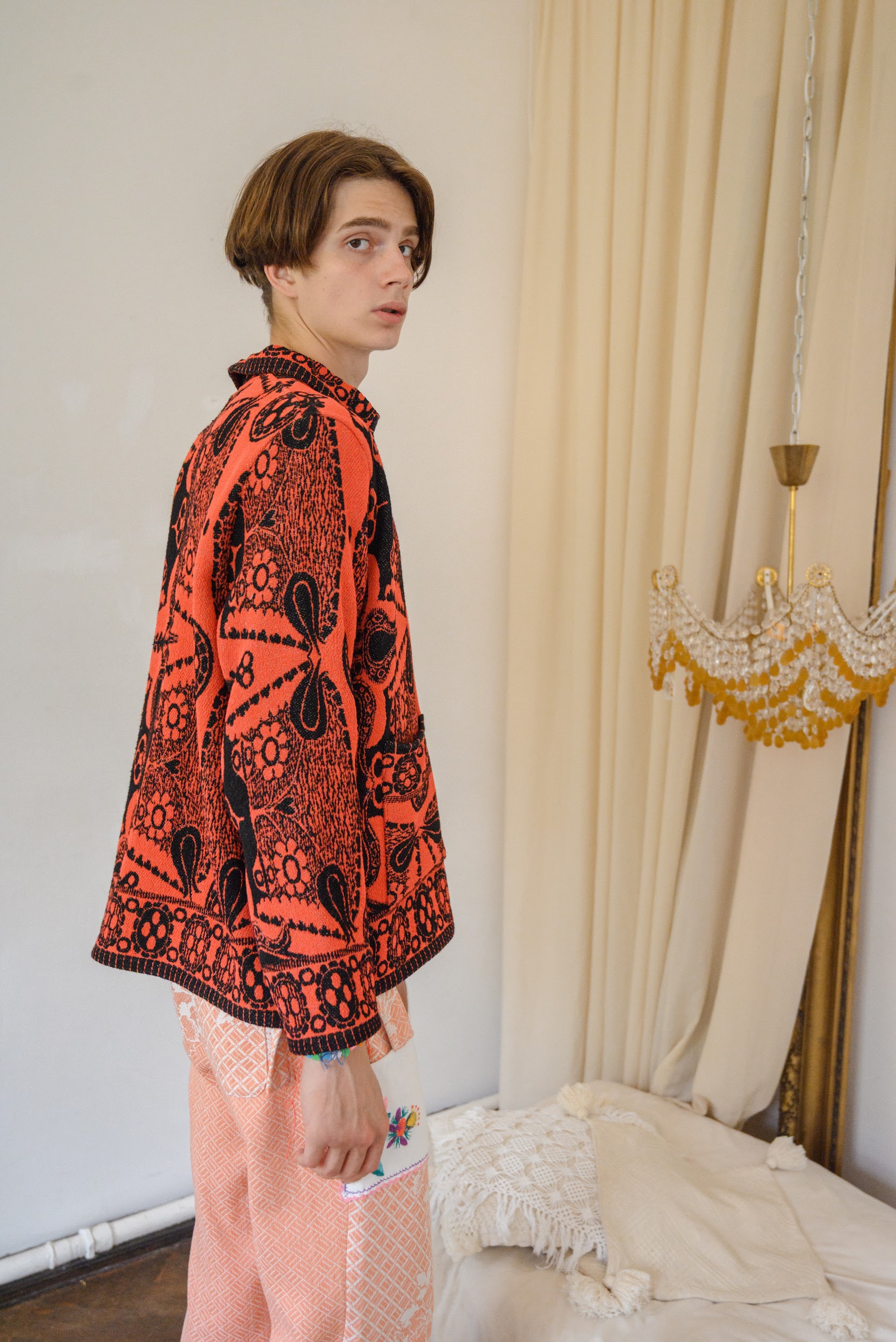 Пиджак сшит из хлопкового покрывала с абстрактным принтом, периода 1970х годов. Маленький карман выполнен из антикварной скатерти, расшитой вручную.