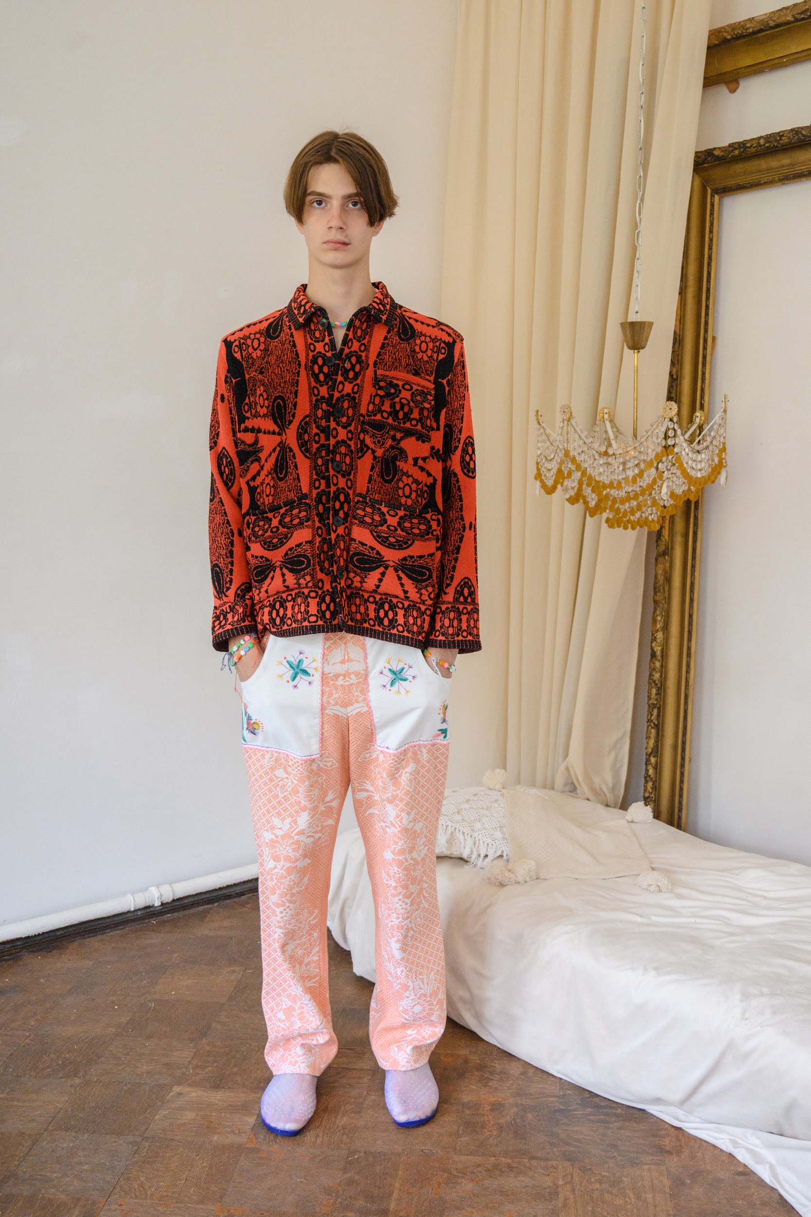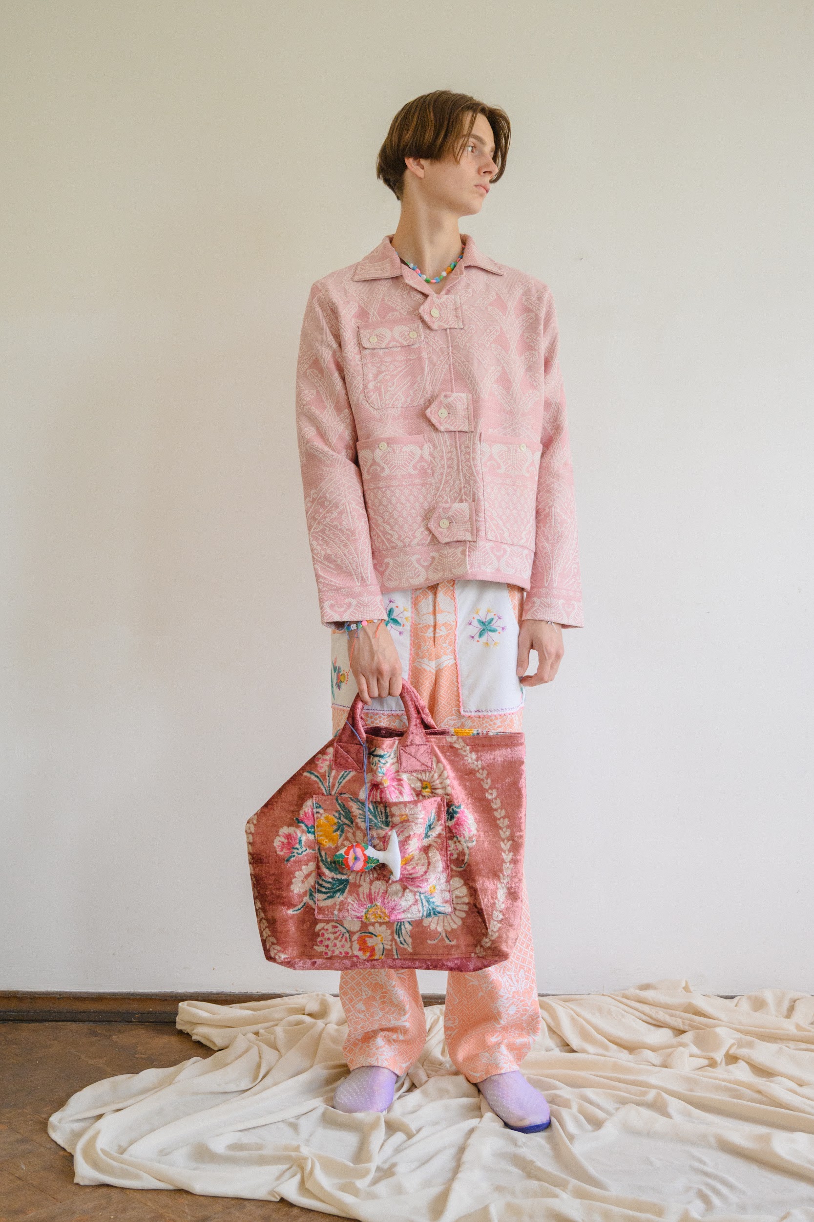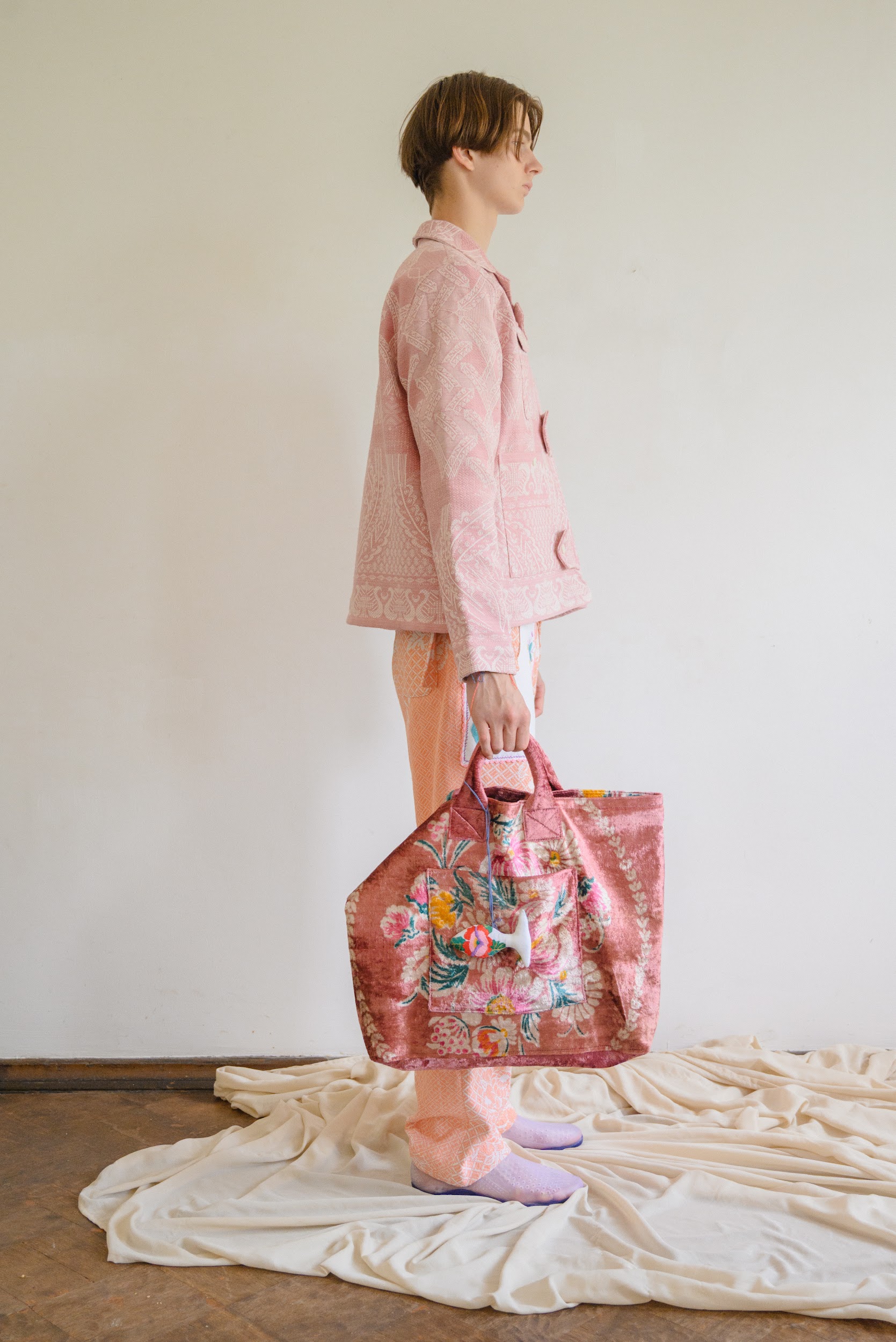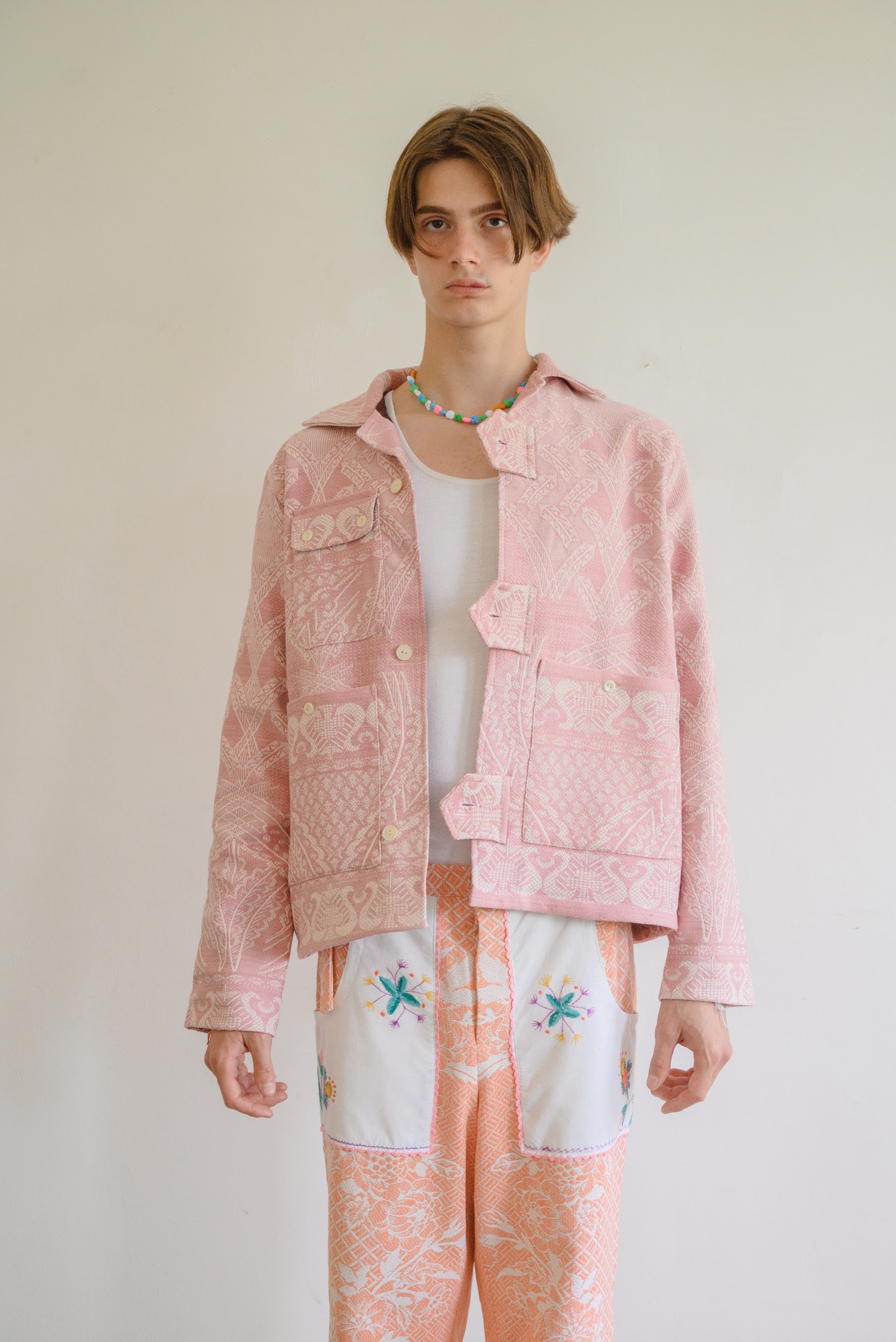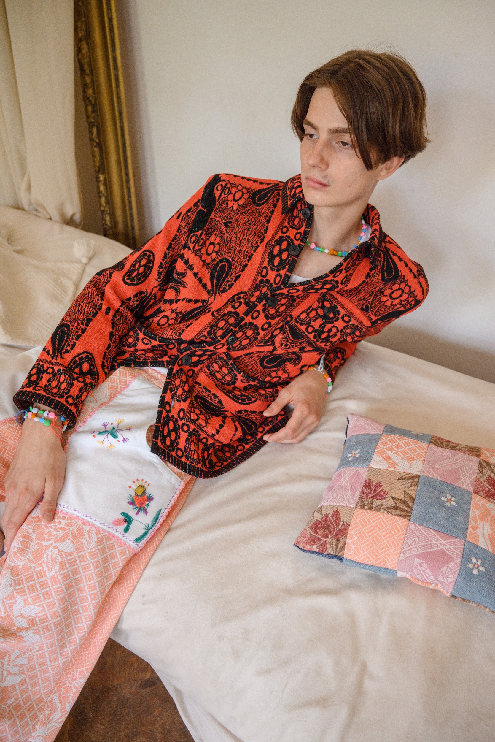 Пиджак сшит из хлопкового покрывала с абстрактным принтом, периода 1970х годов. Маленький карман выполнен из антикварной скатерти, расшитой вручную.