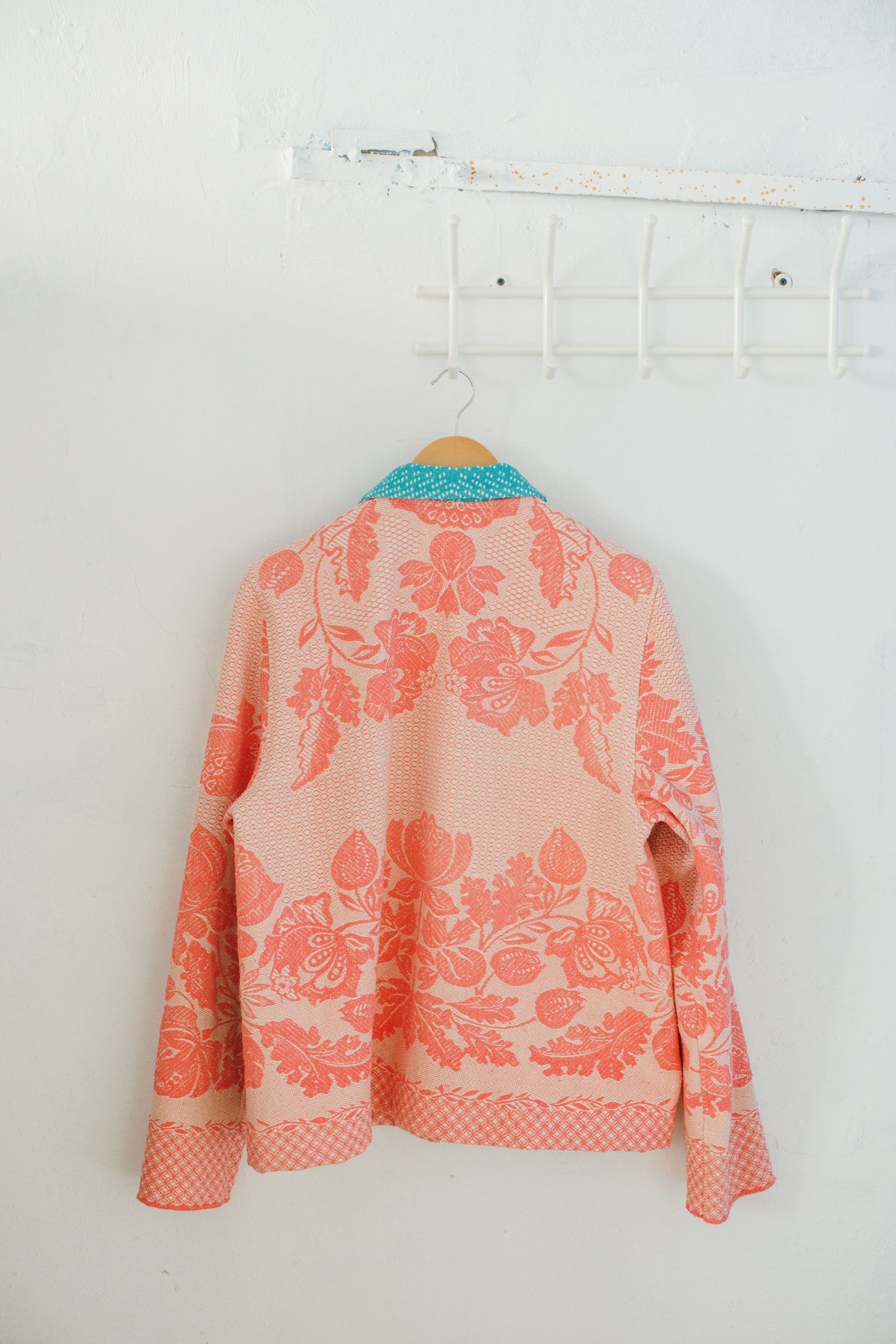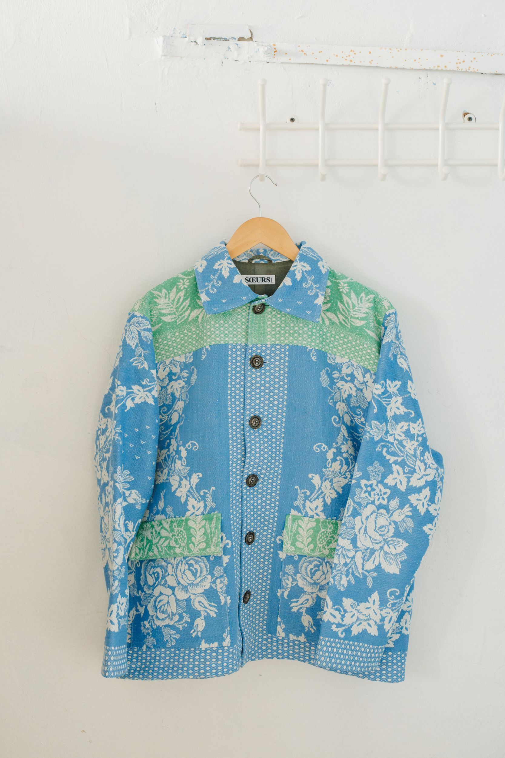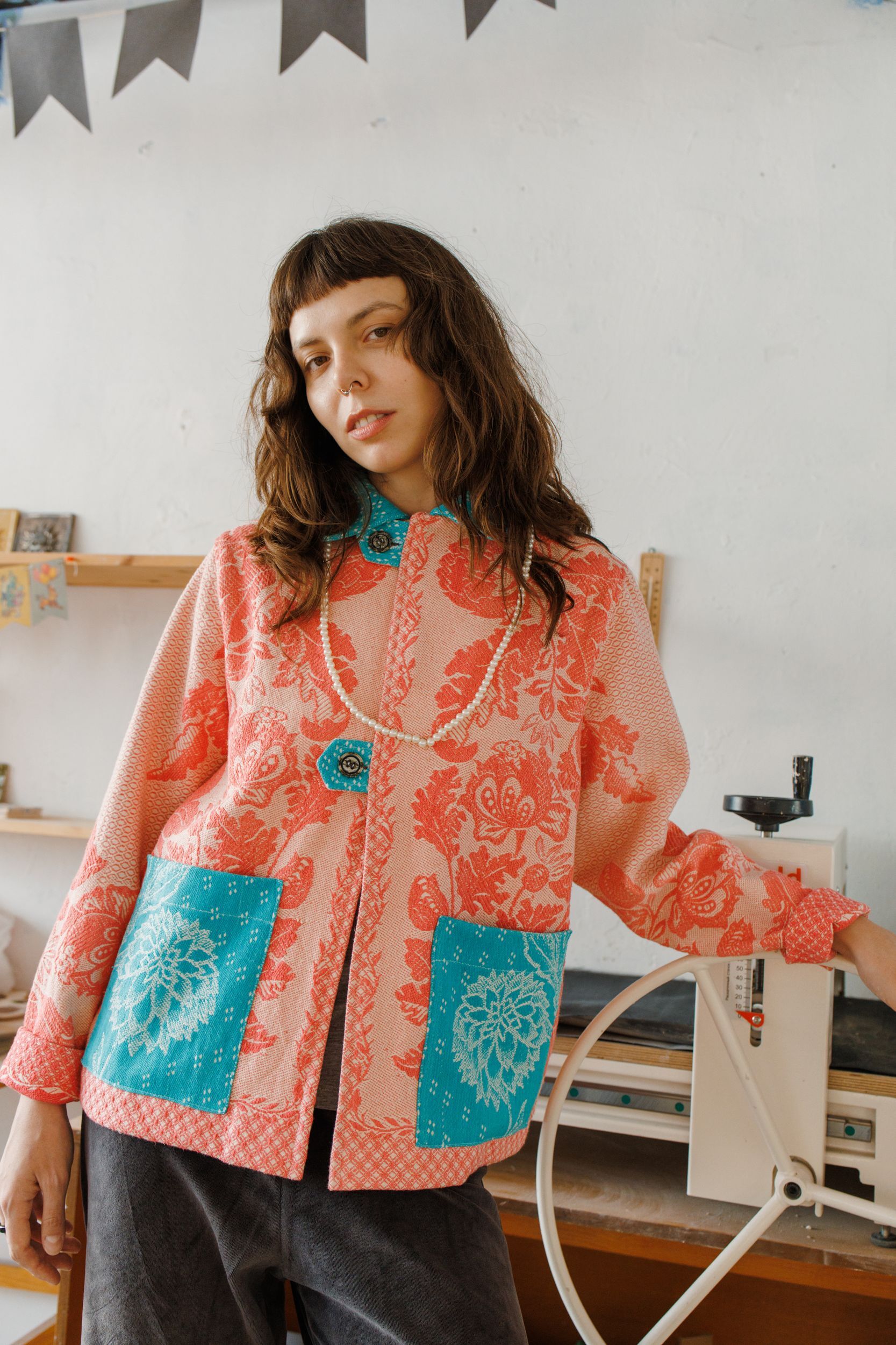 This one-of-a-kind Jacket is made from two cotton coverlets, circa 1960-70s. Coverlets woven with floral pattern.