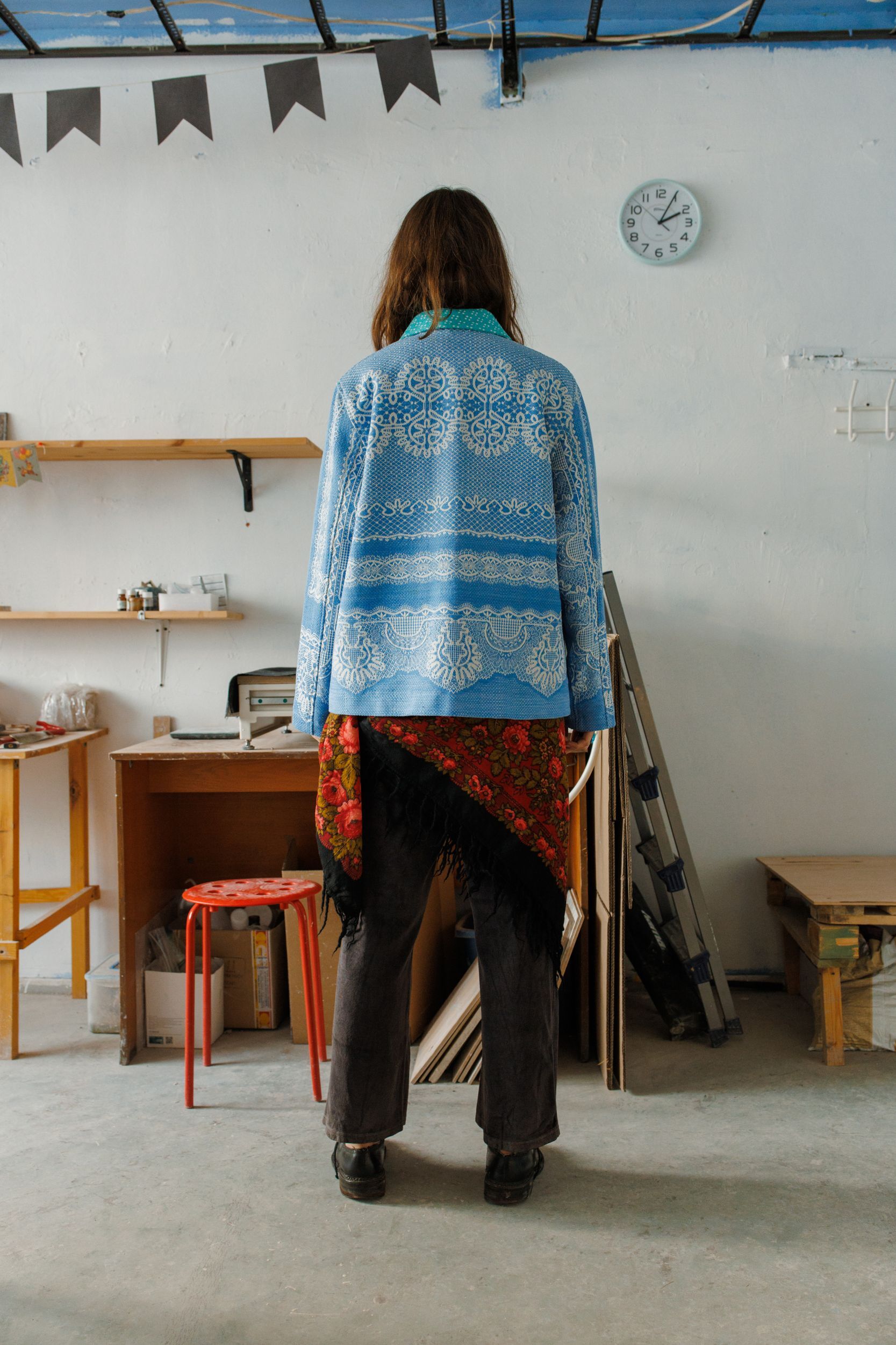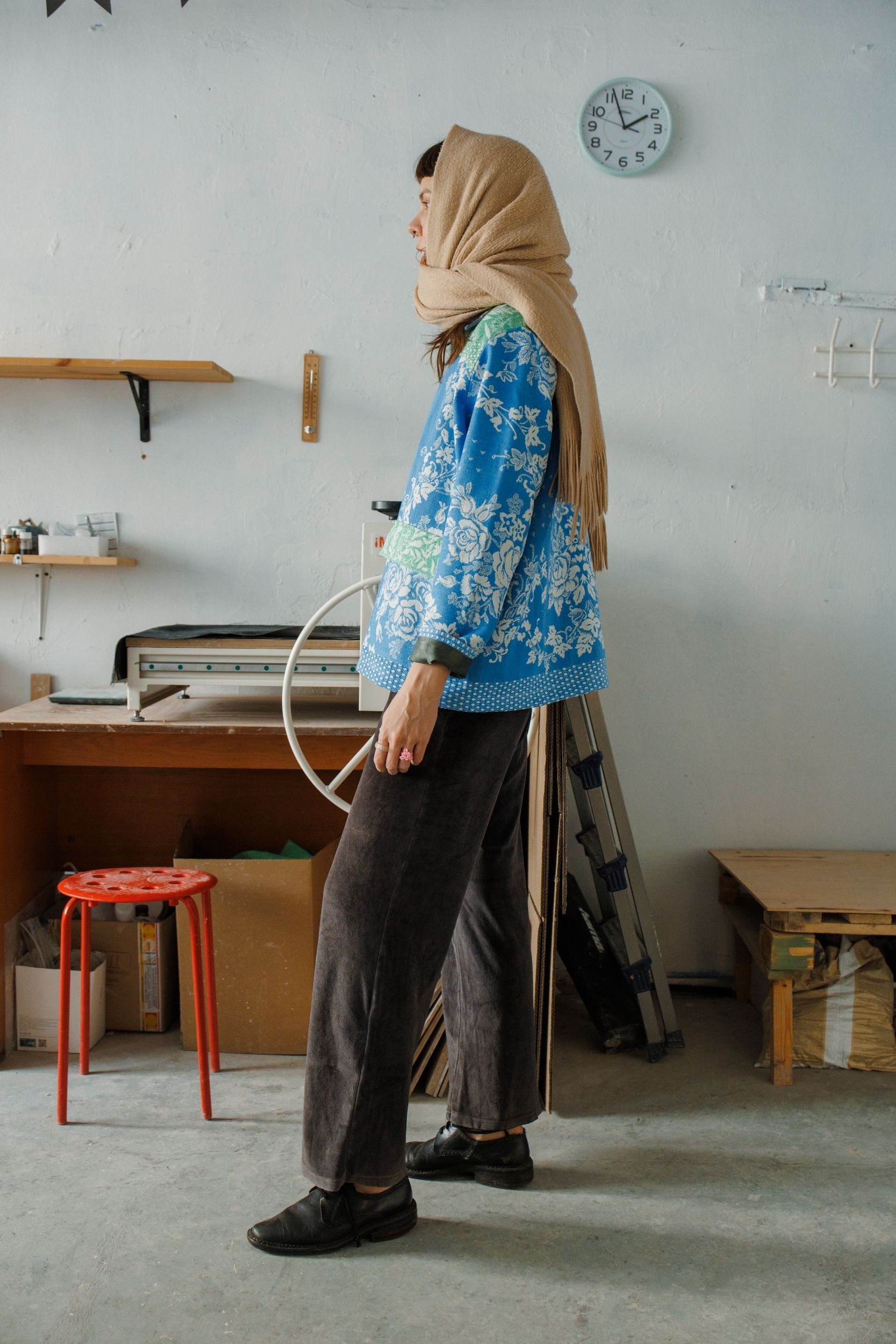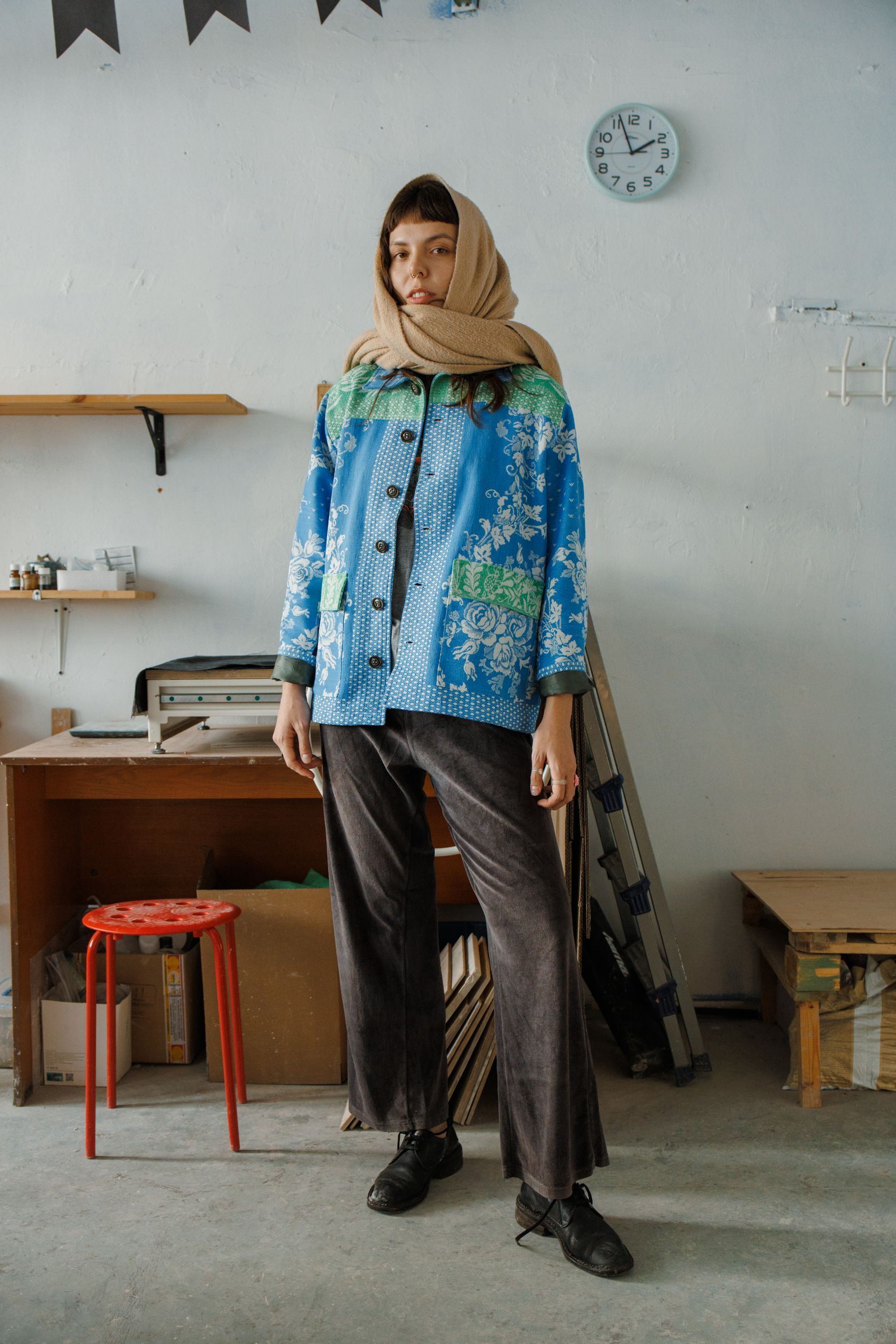Пиджак сшит в одном экземпляре из двух антикварных покрывал с цветочным узором, периода 1960х годов. Карманы и воротник украшены ручной вышивкой.