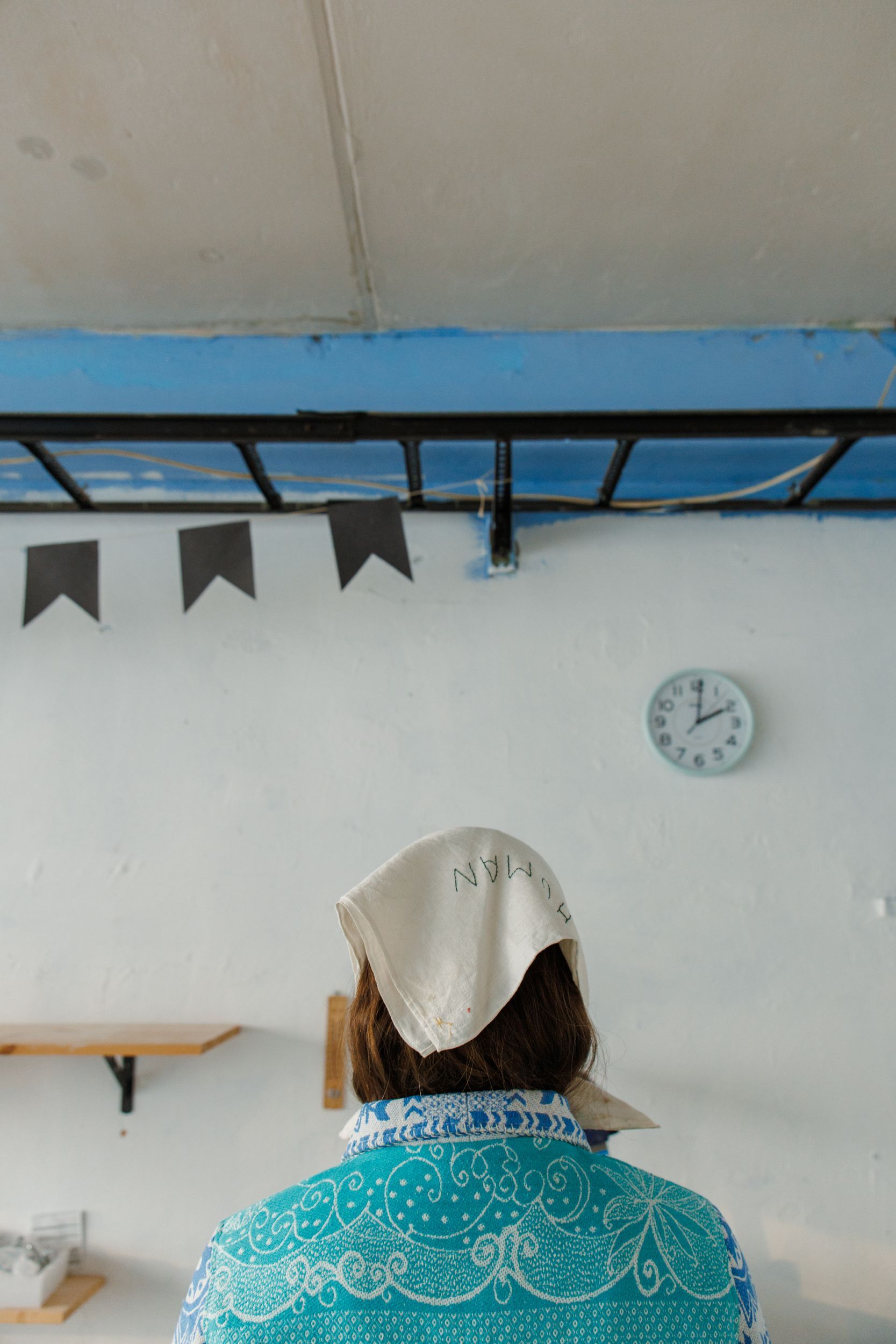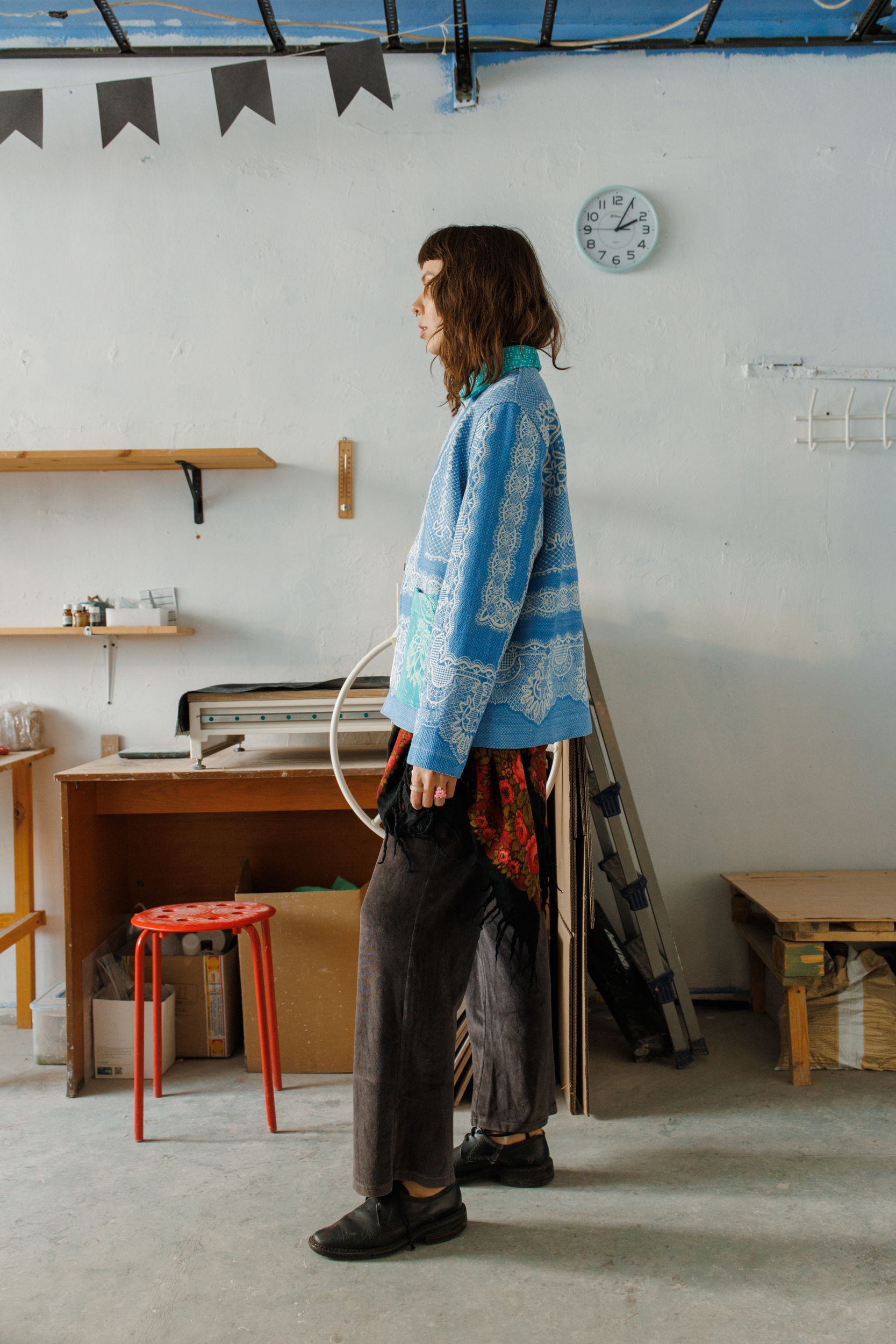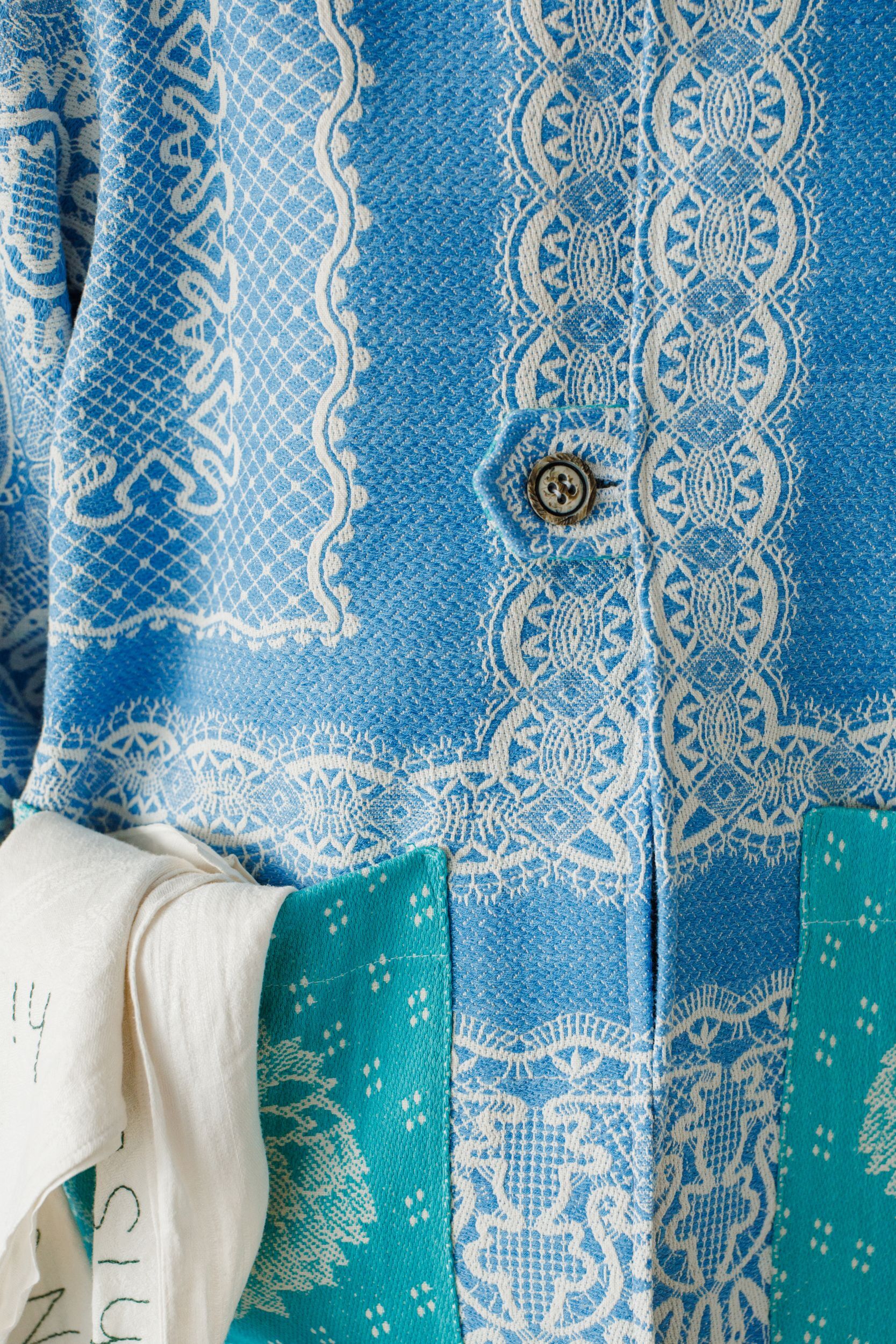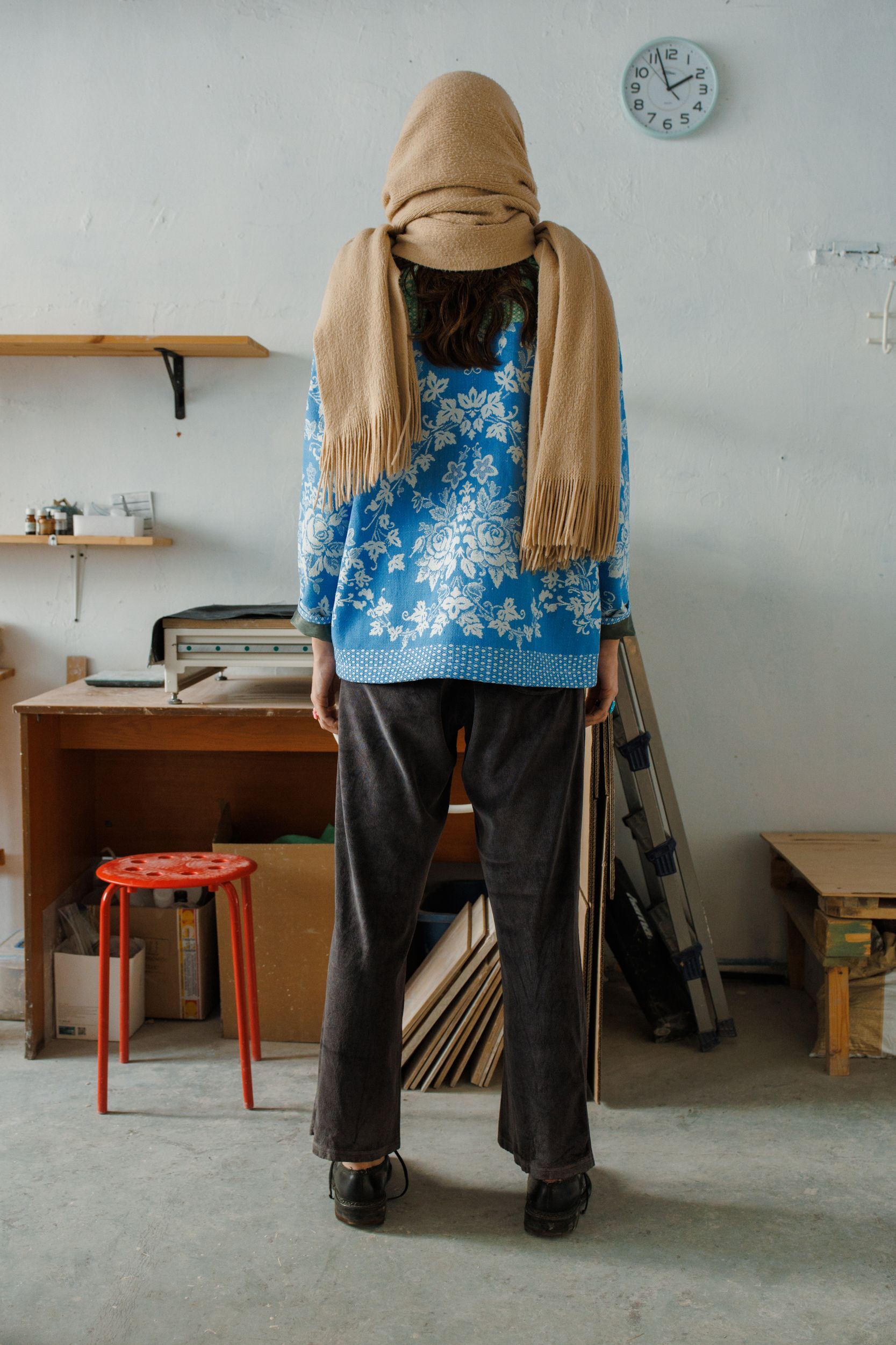 Пиджак сшит в одном экземпляре из двух антикварных покрывал с цветочным узором, периода 1960х годов. Карманы и воротник украшены ручной вышивкой.
