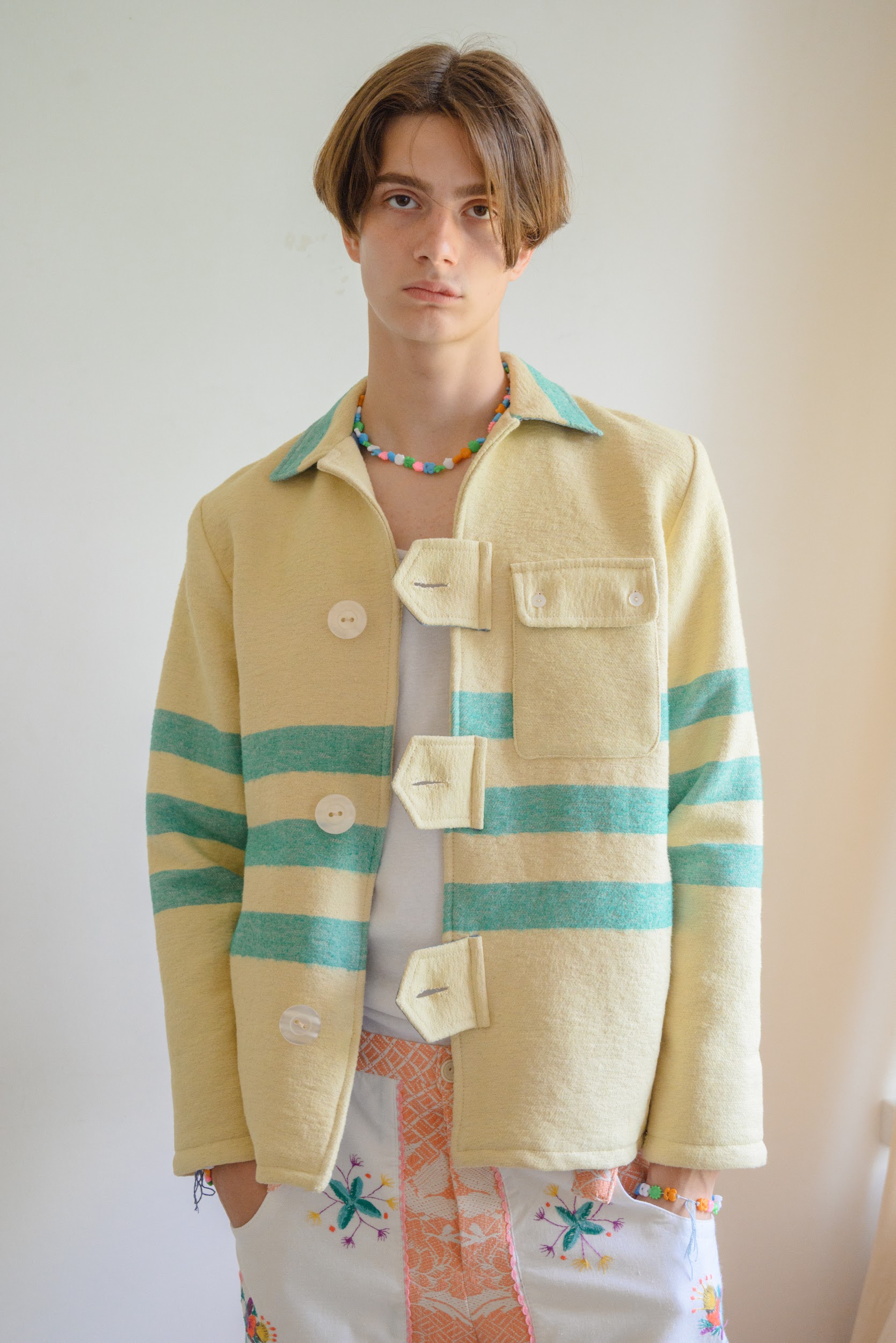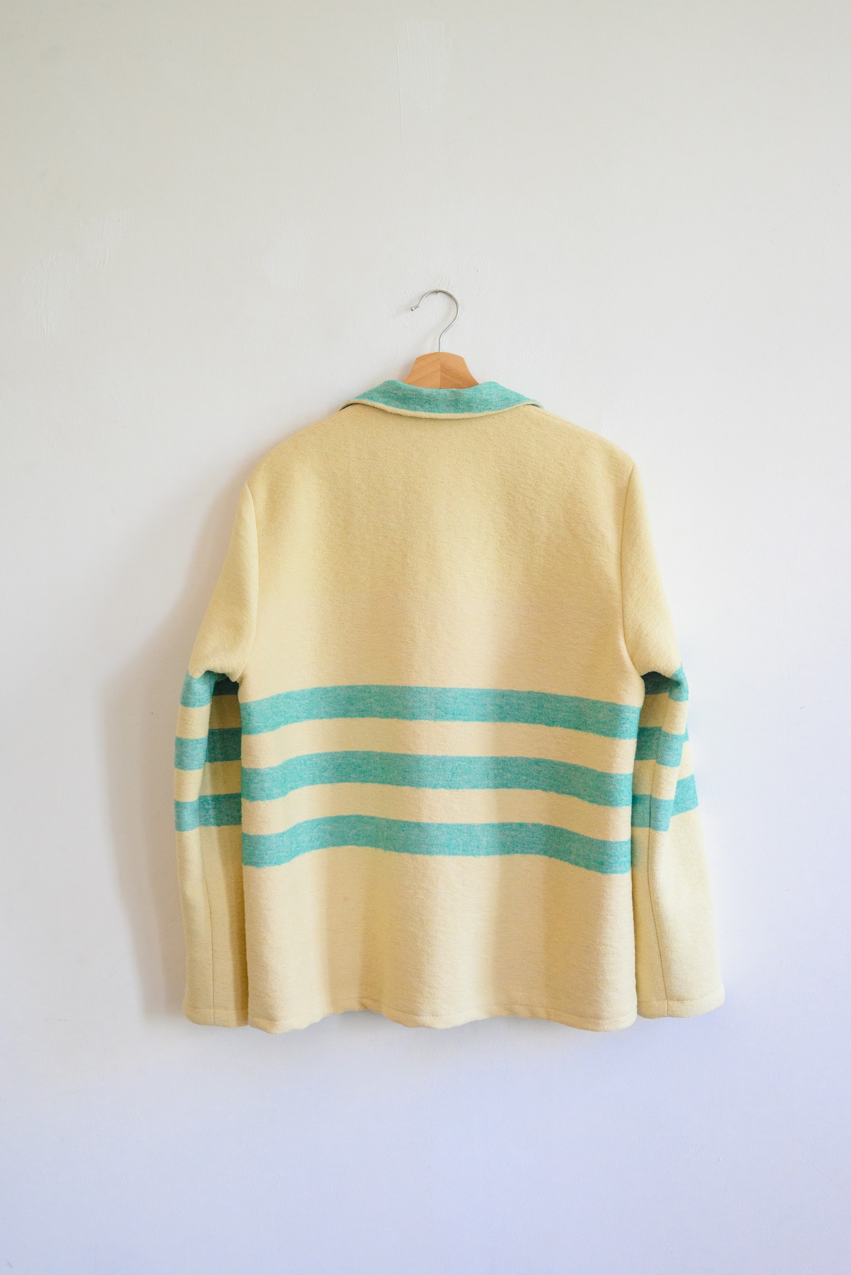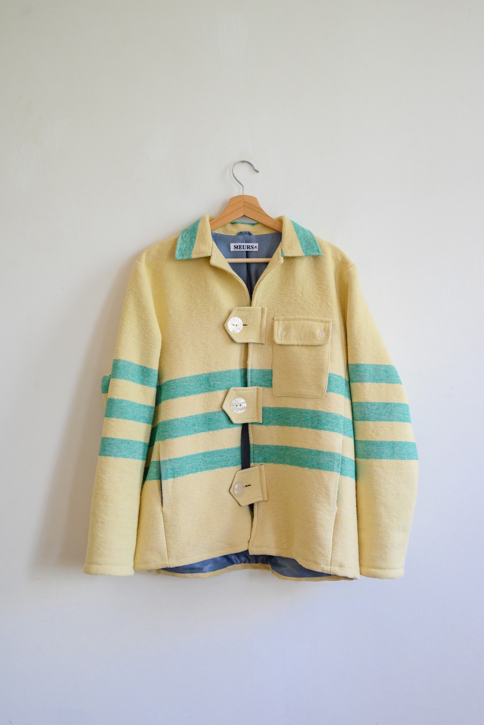 This one-of-a-kind Jacket is made from a cotton blanket, circa 1960s. Blanket woven with three green stripes.