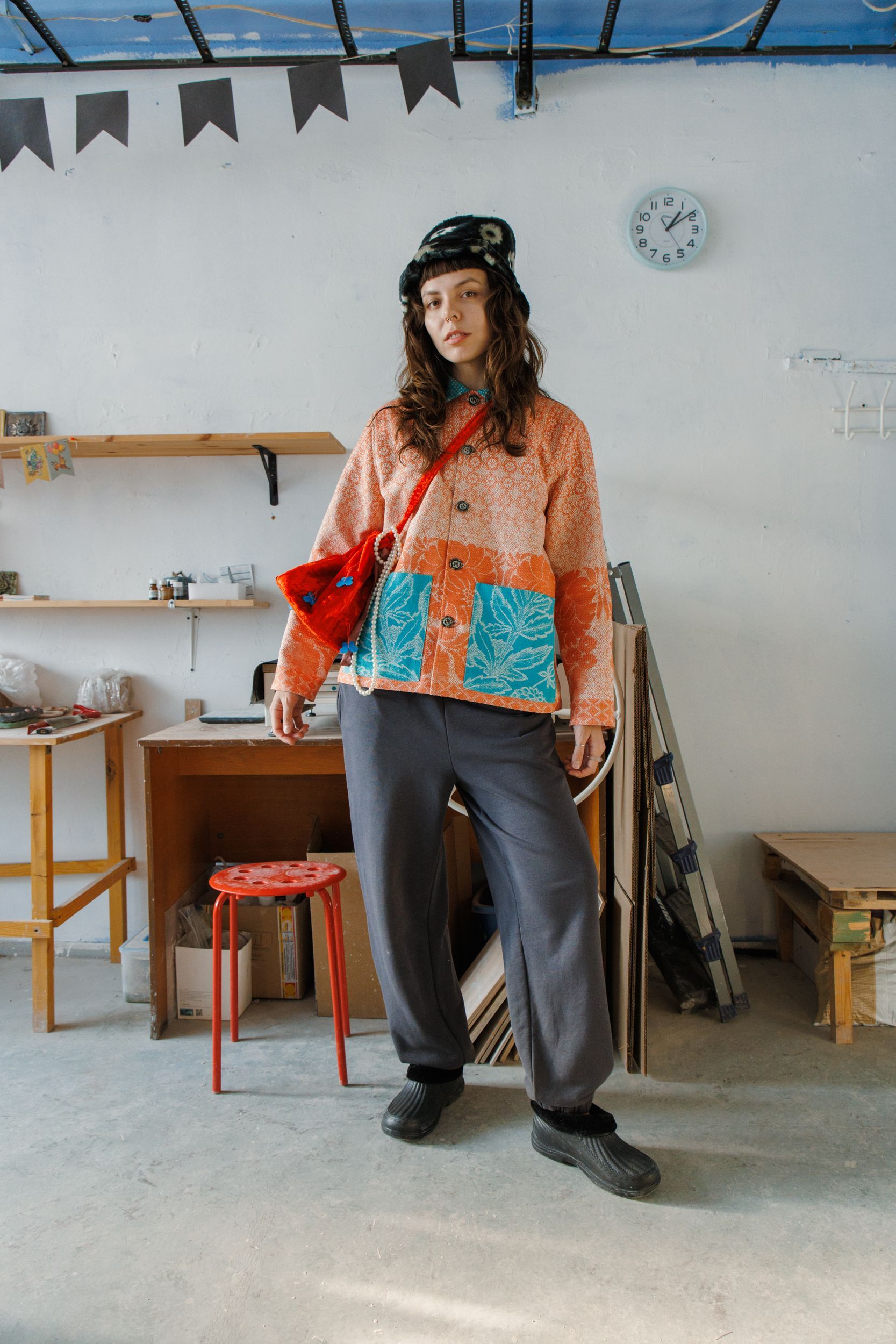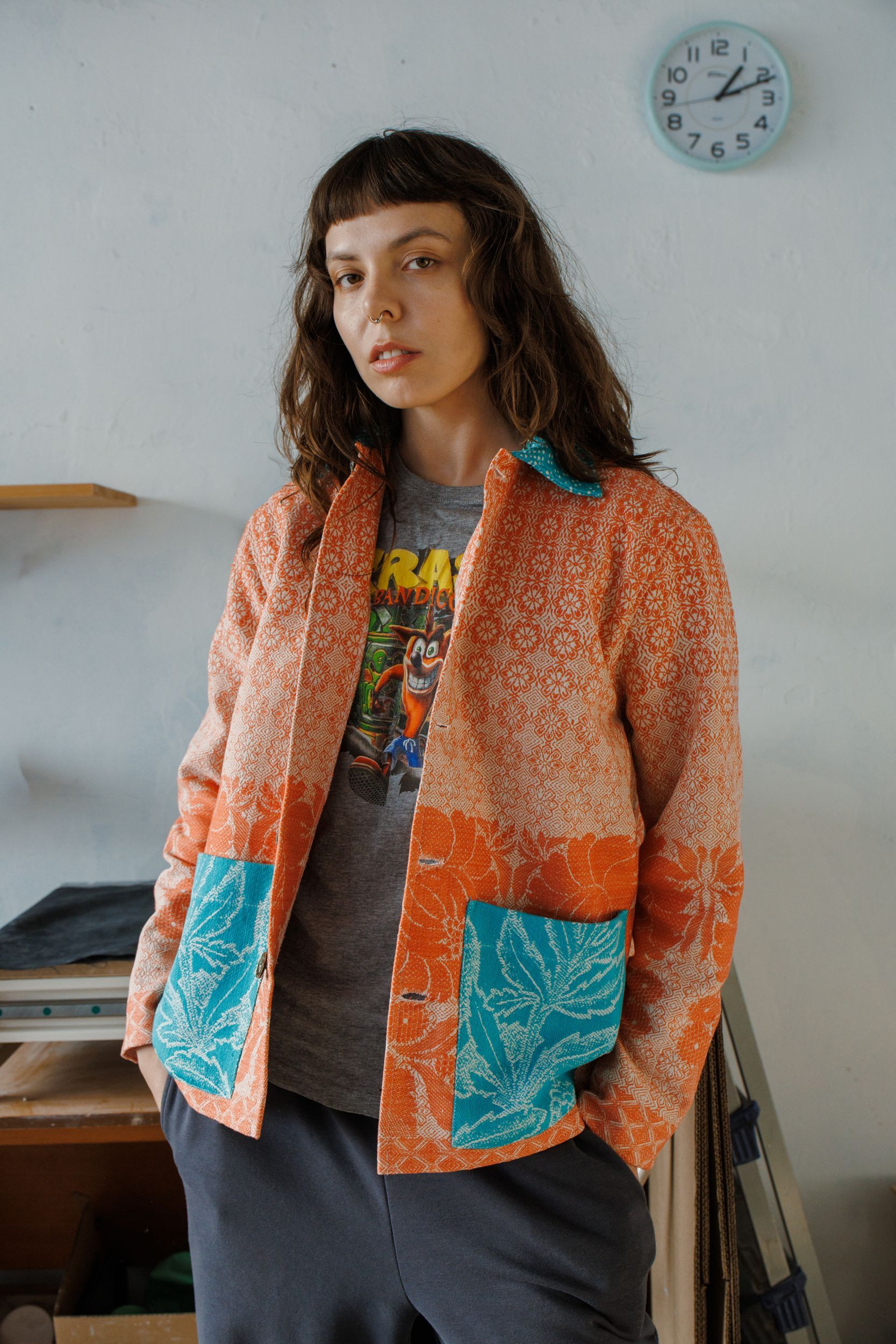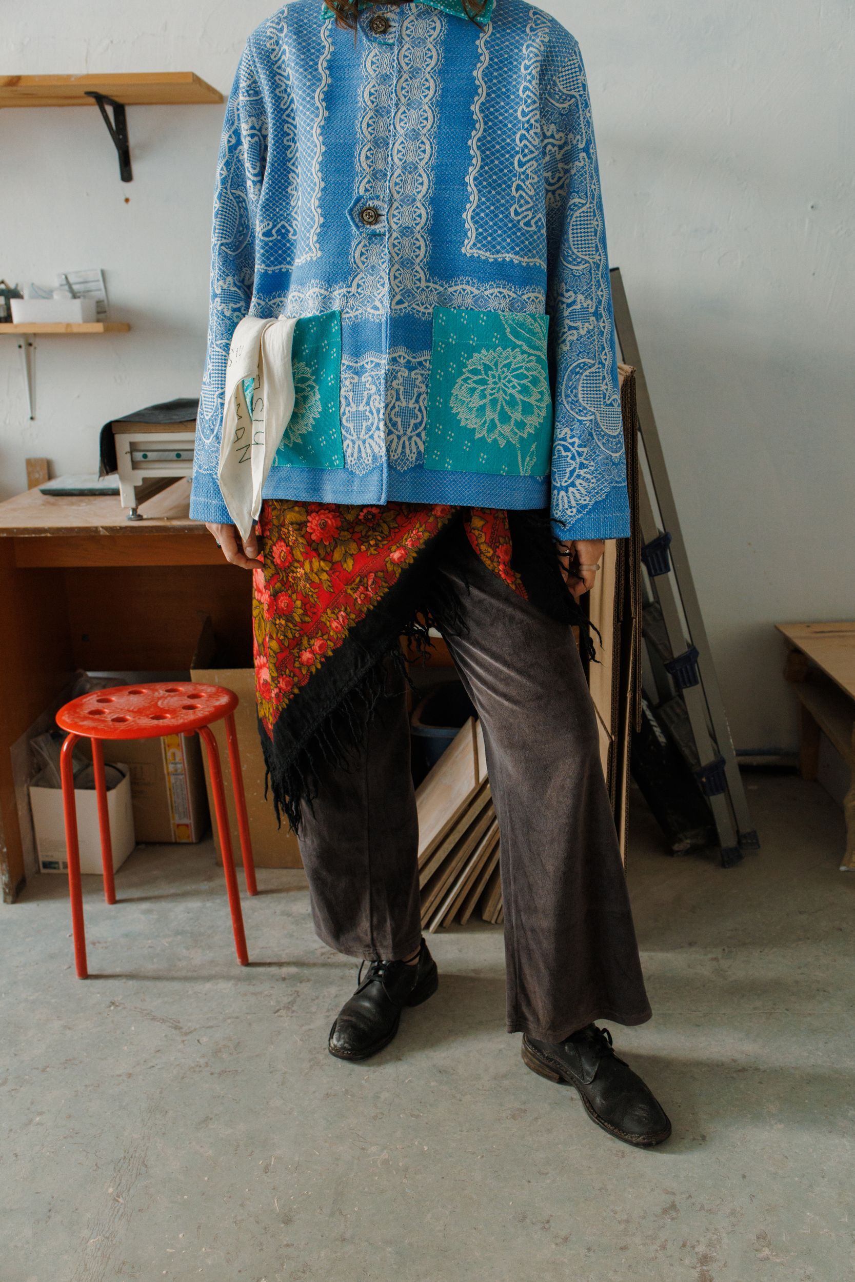Пиджак сшит в одном экземпляре в технике пэчворк из антикварных покрывал с растительным узором, периода 1960-80х годов.