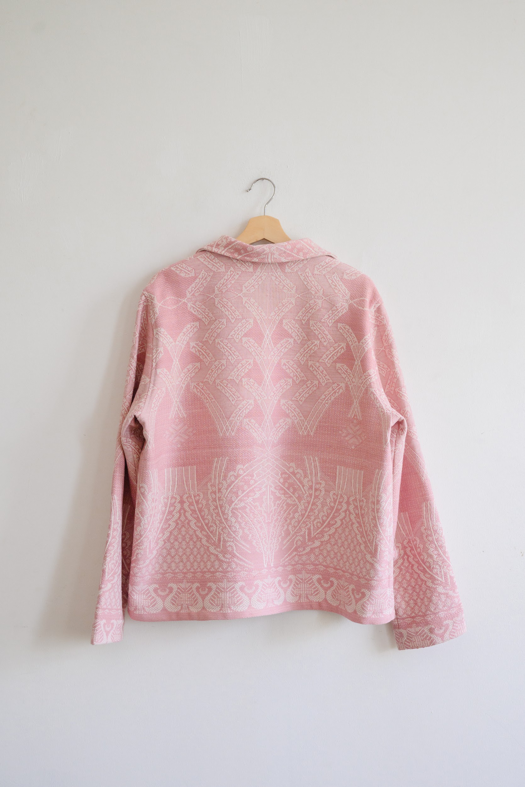 This one-of-a-kind Jacket is made from a cotton jacquard coverlet, circa 1980s. Coverlet woven with an abstract pattern.