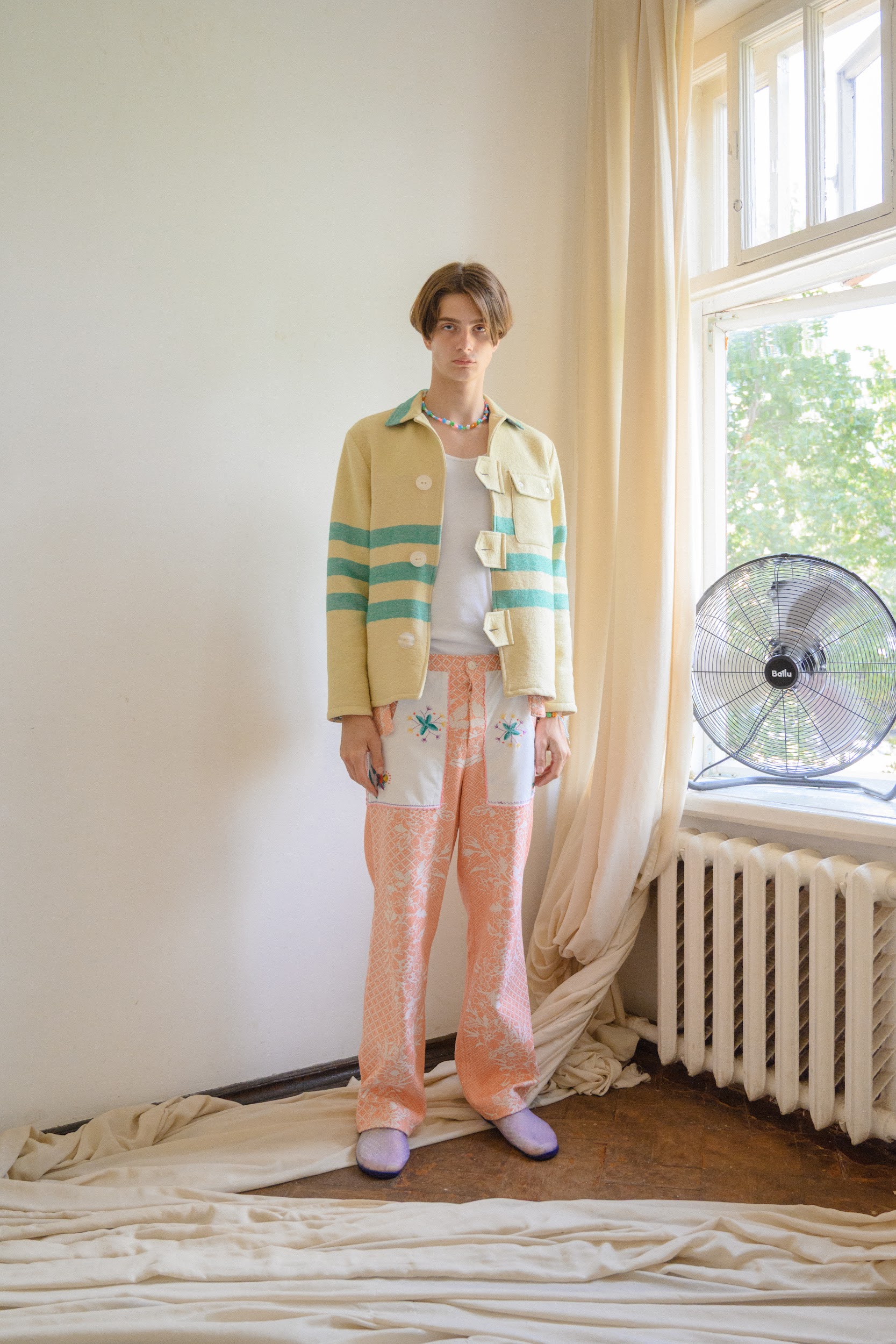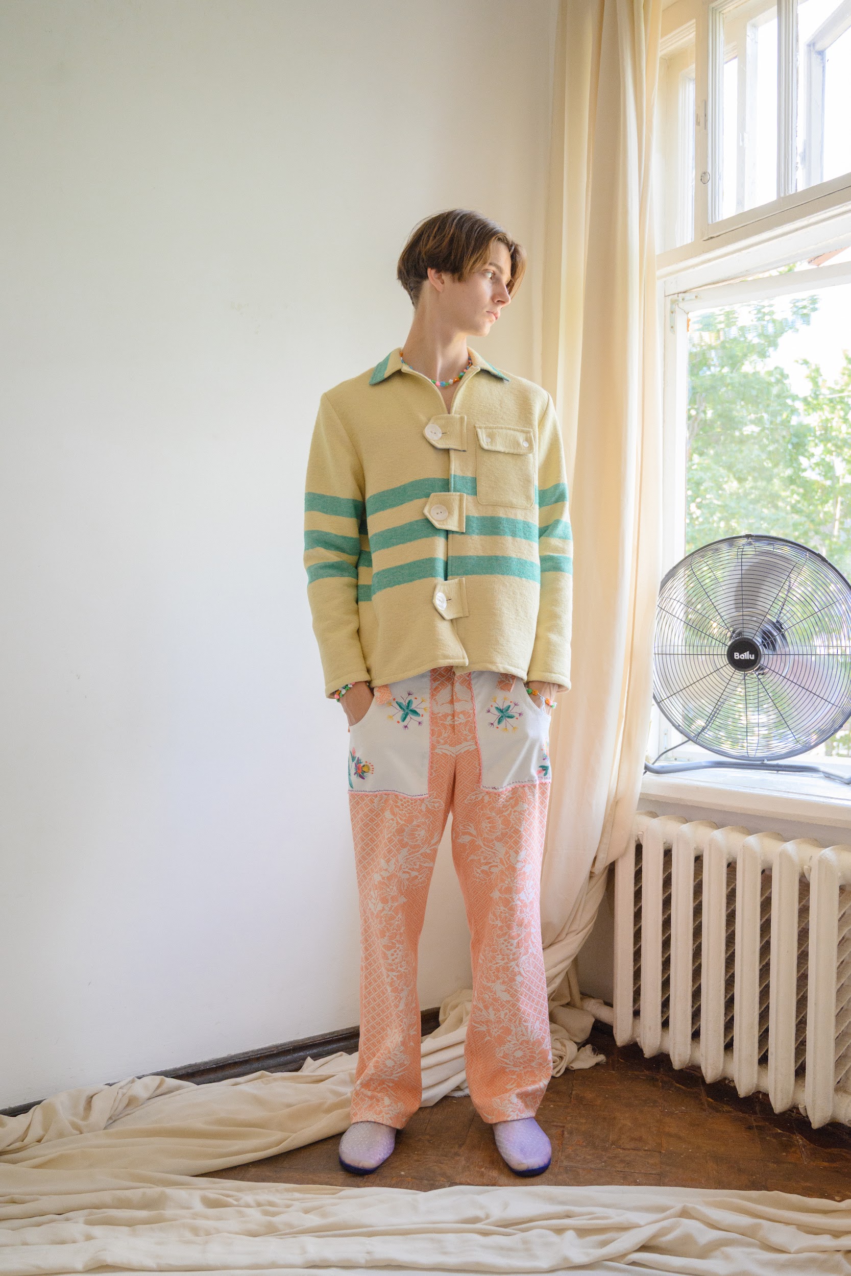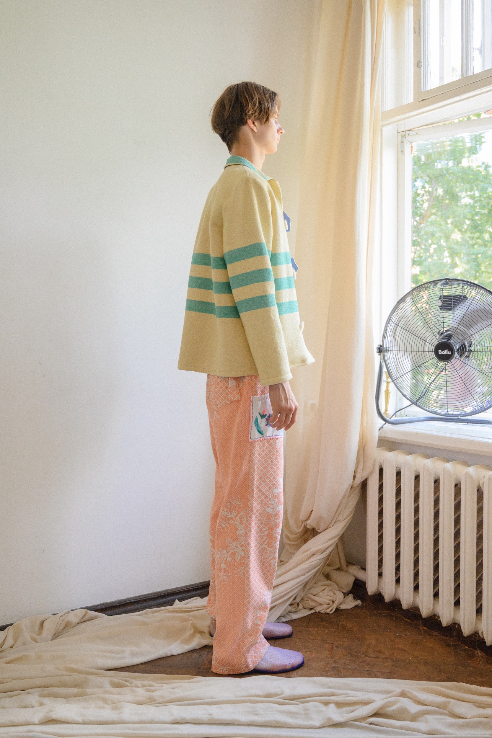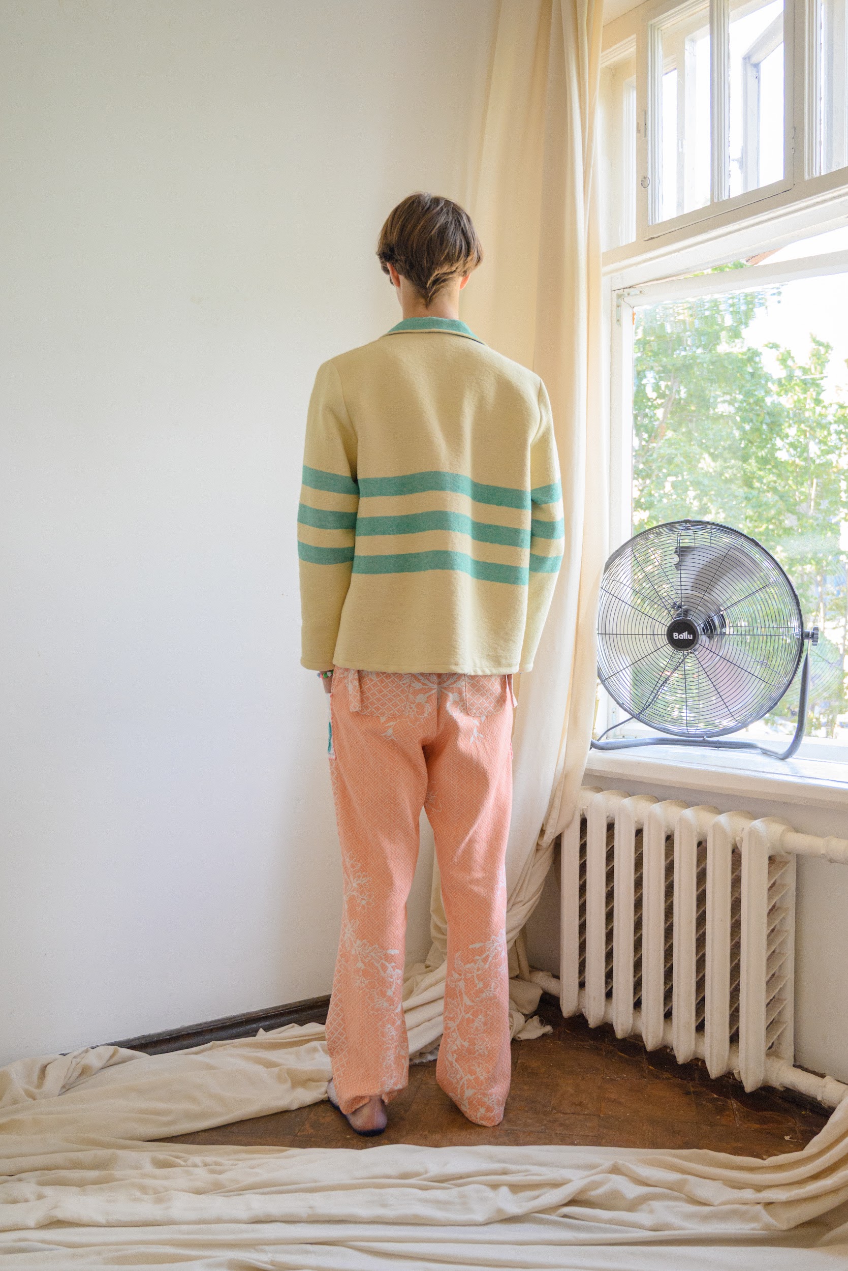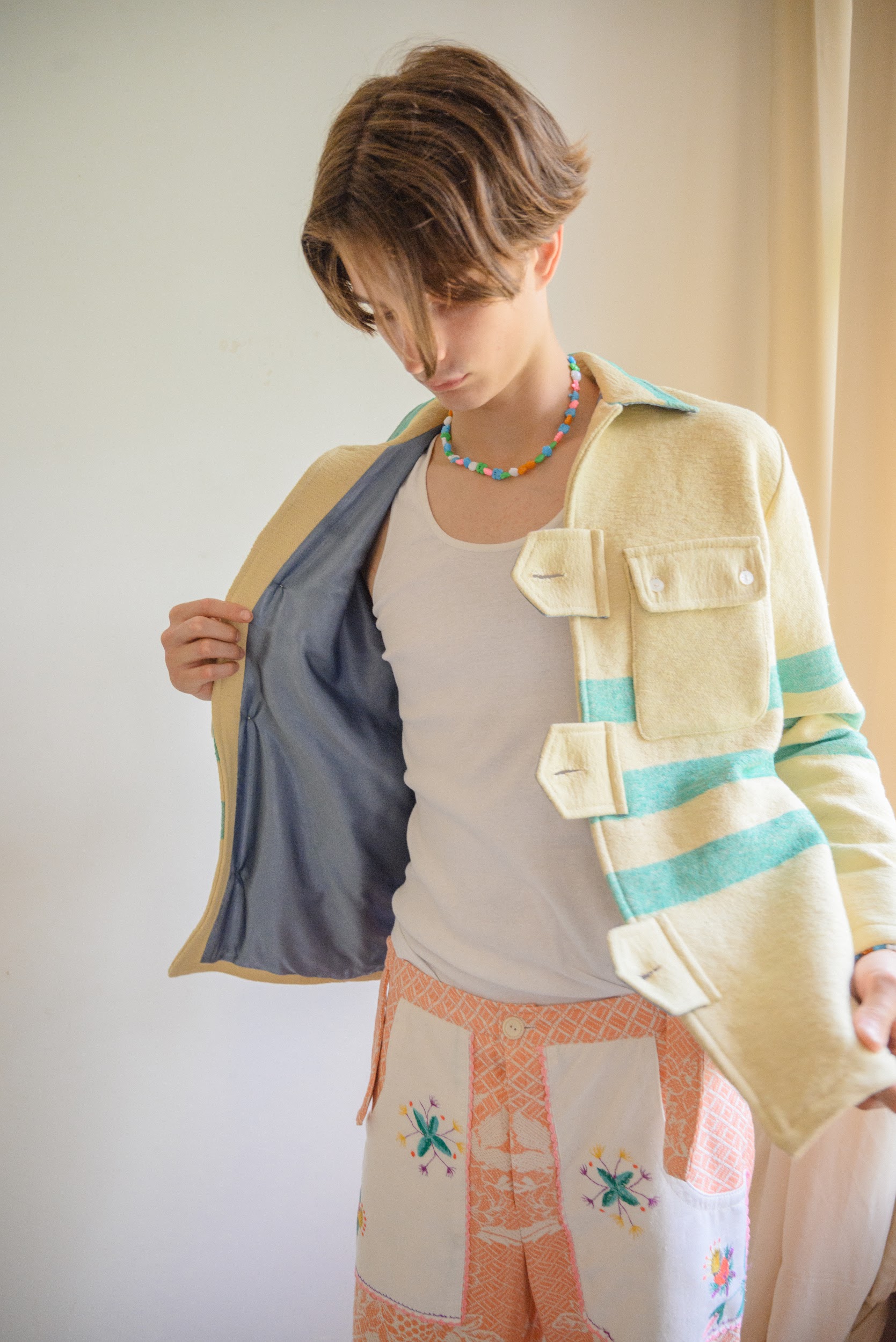 Пиджак сшит из антикварного хлопкового одеяла, периода 1960х годов. Одеяло было украшено тремя зелеными полосами.
