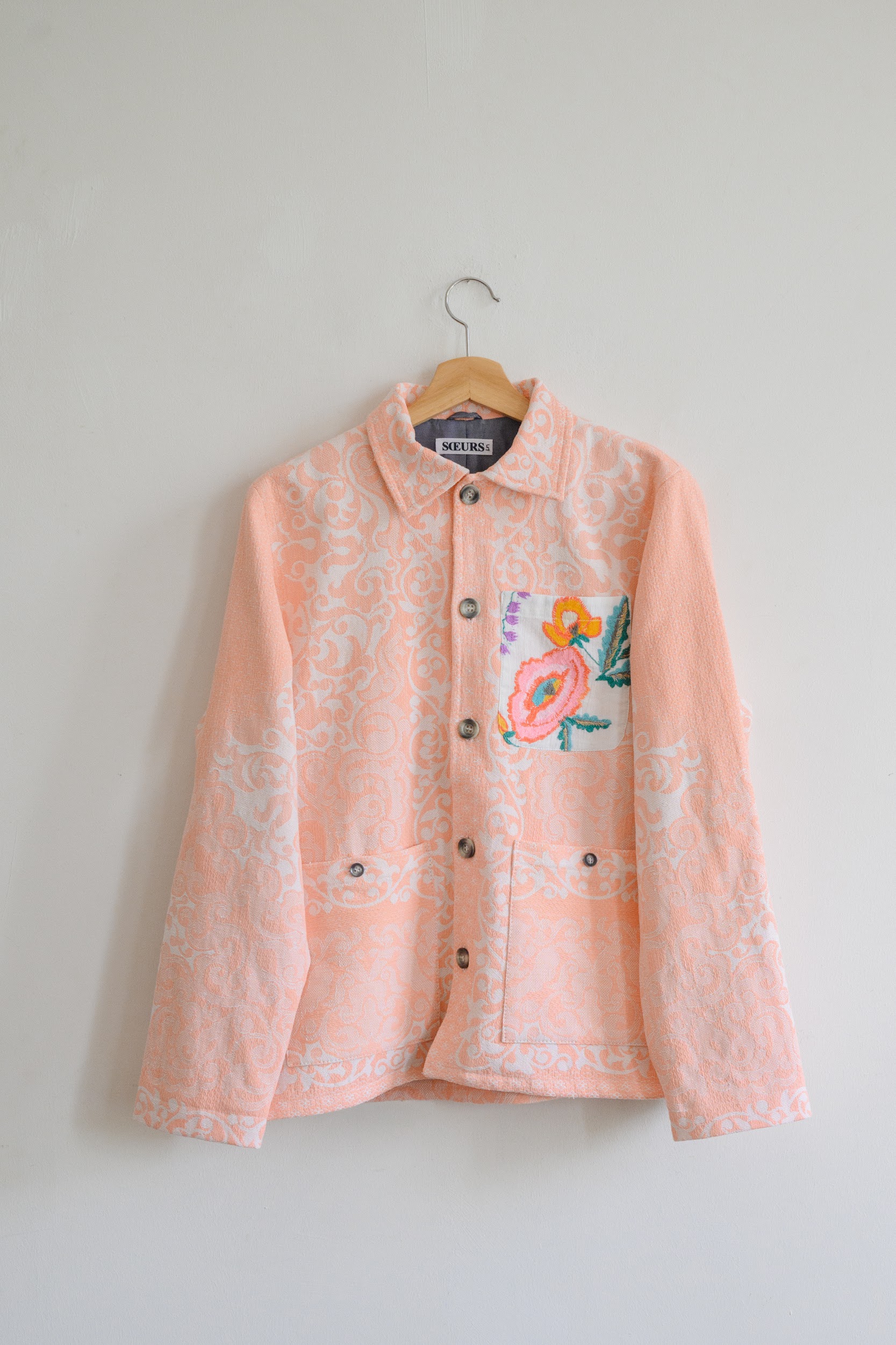 This one-of-a-kind Jacket is made from a cotton coverlet, circa 1970s. Coverlet woven with a floral pattern.