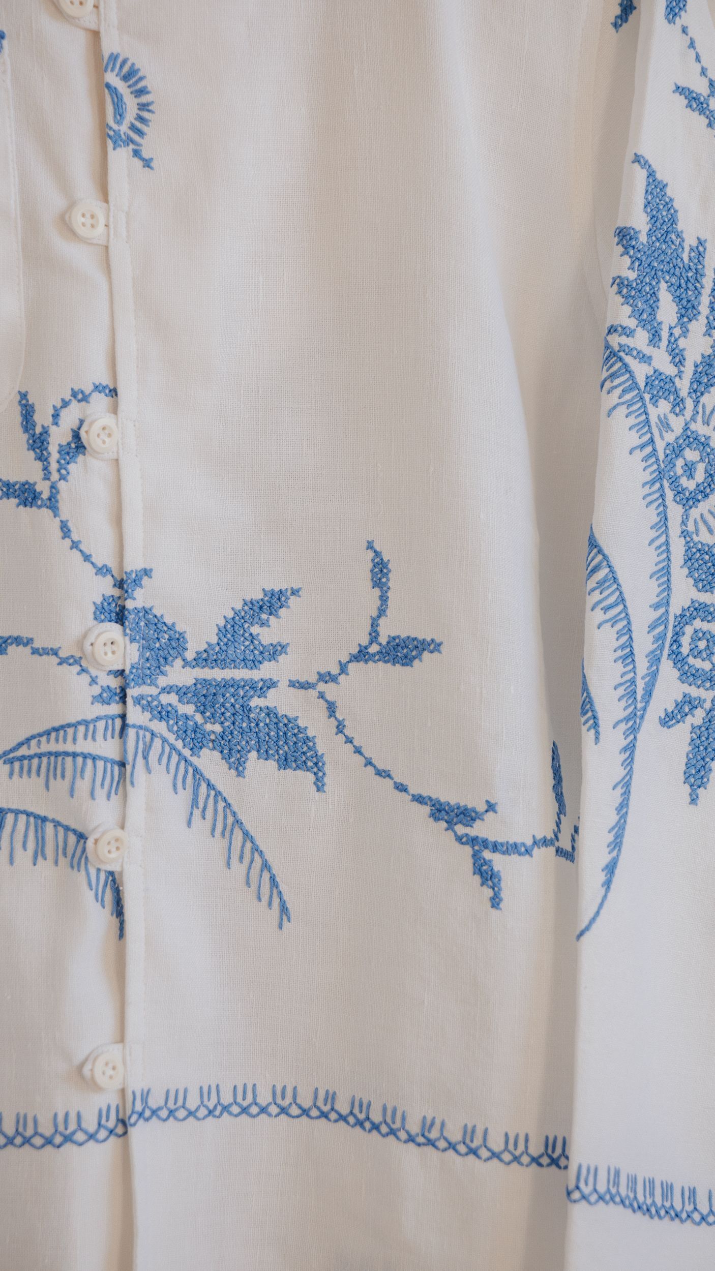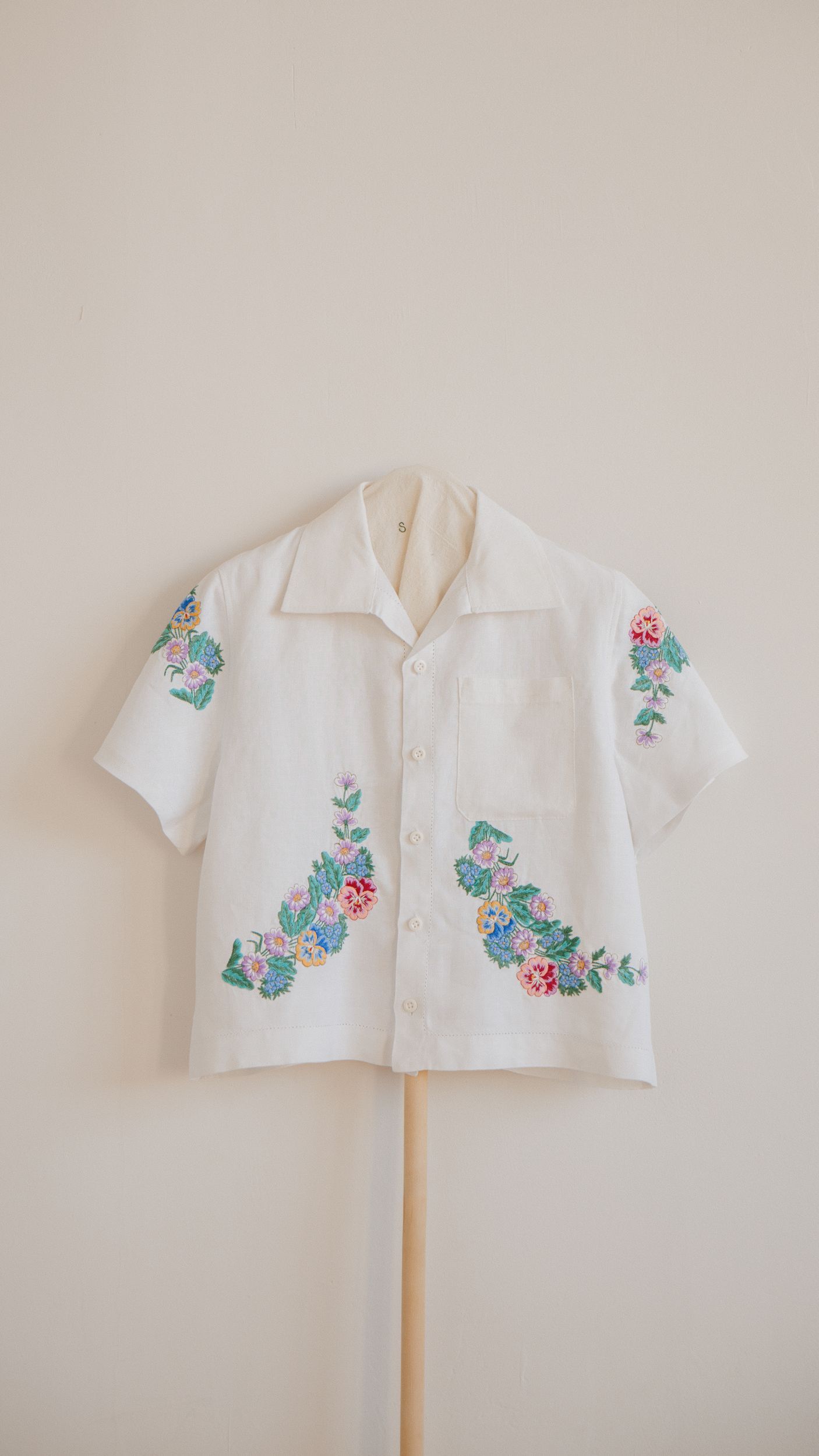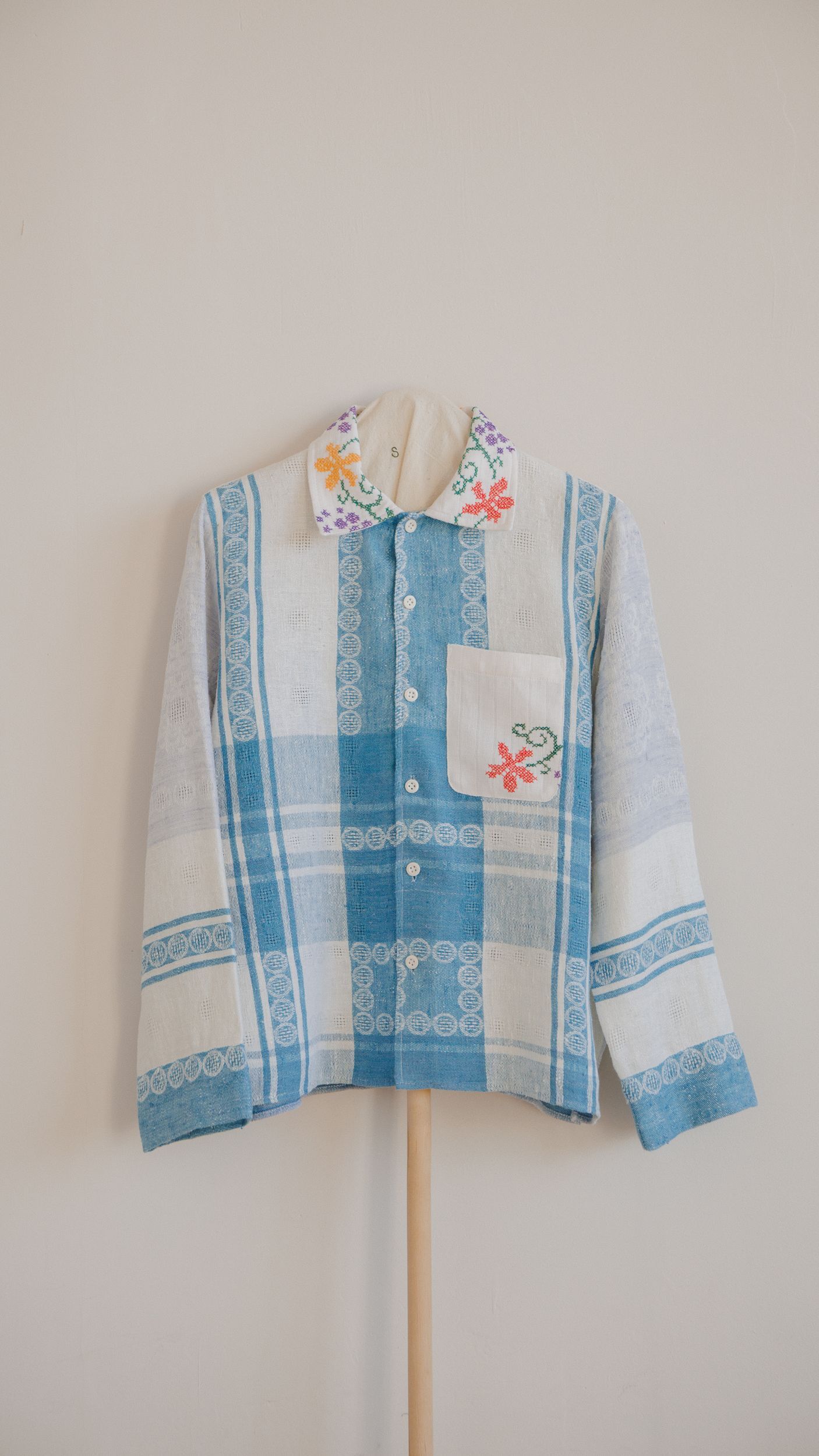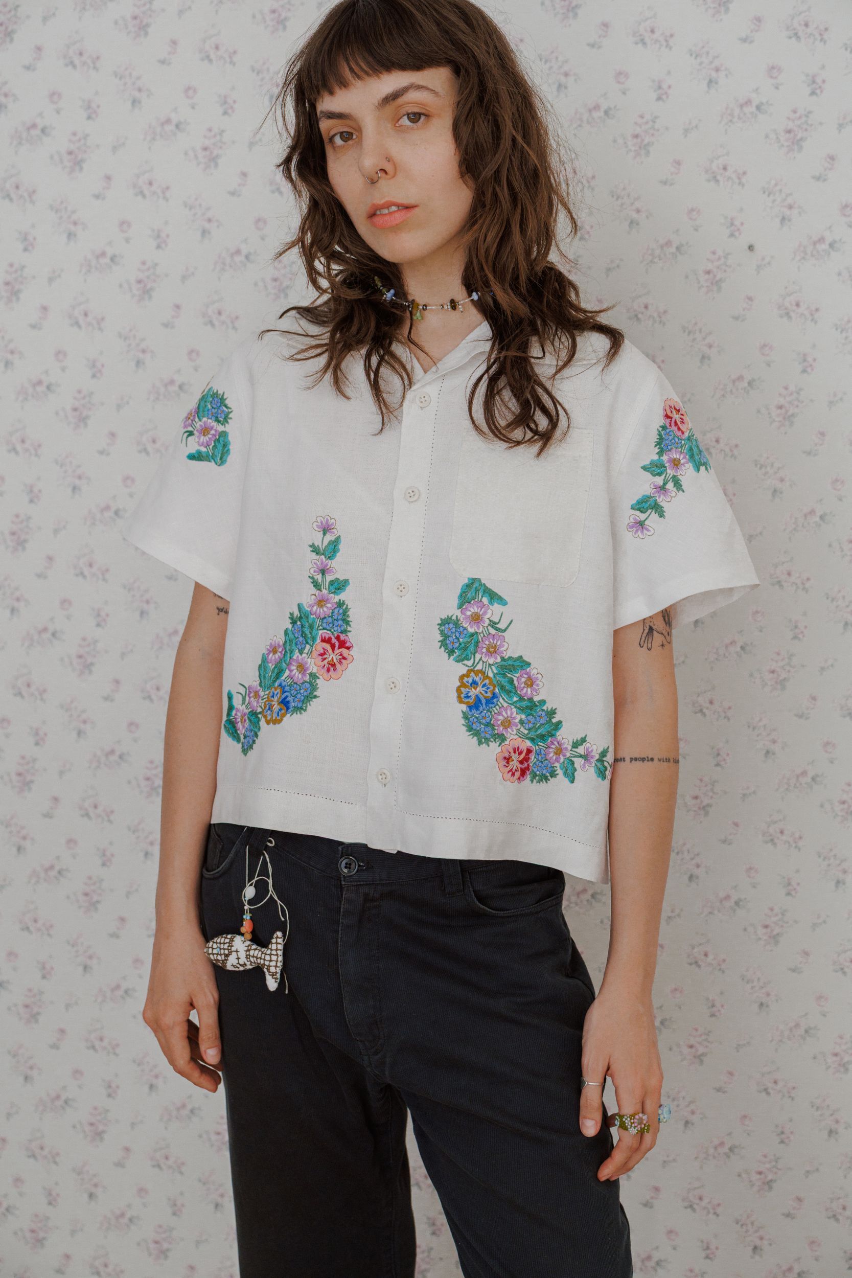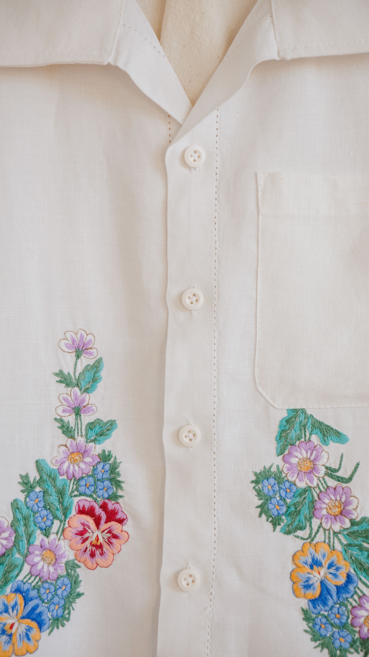 This one-of-a-kind long sleeve Shirt is made from a cotton tablecloth, circa 1960s. Tablecloth was featured with a handmade floral embroidery.