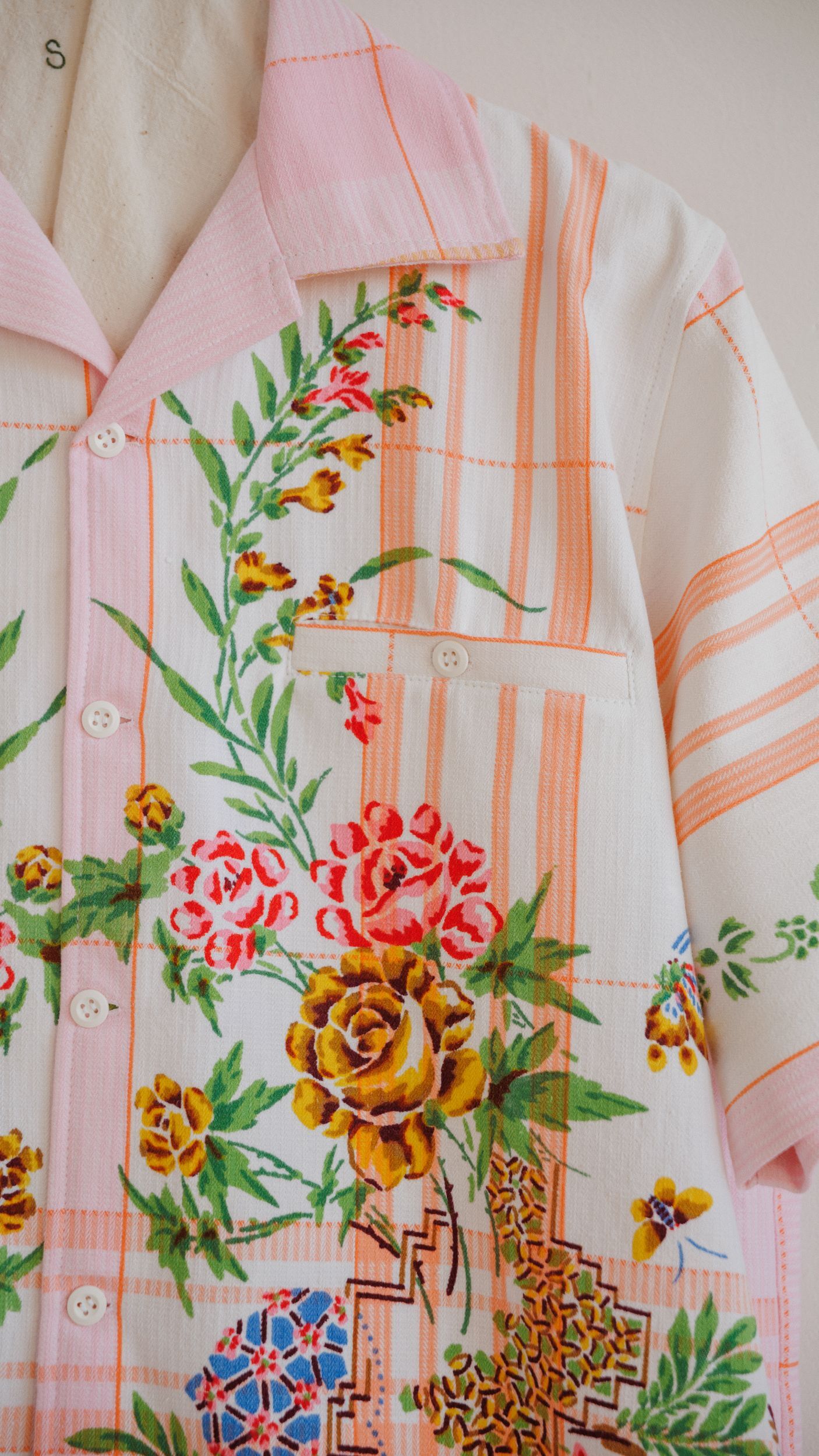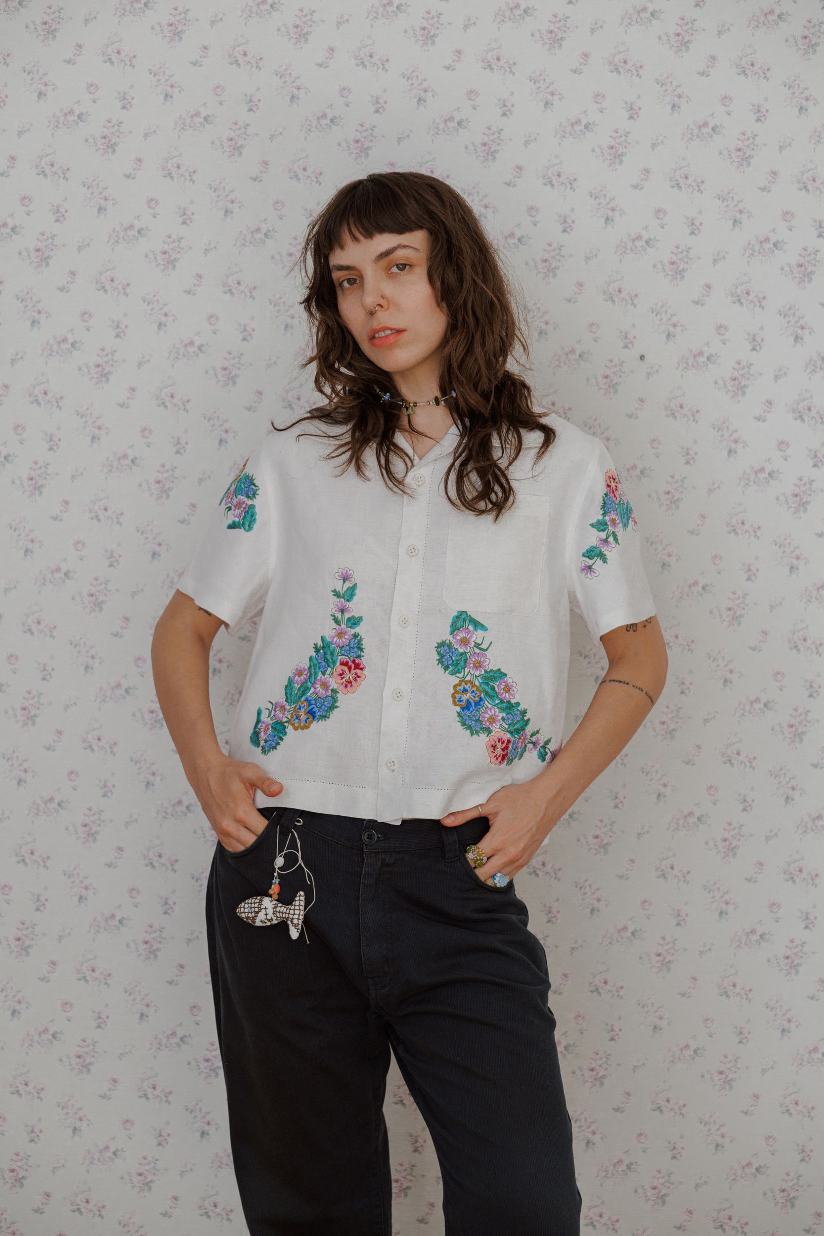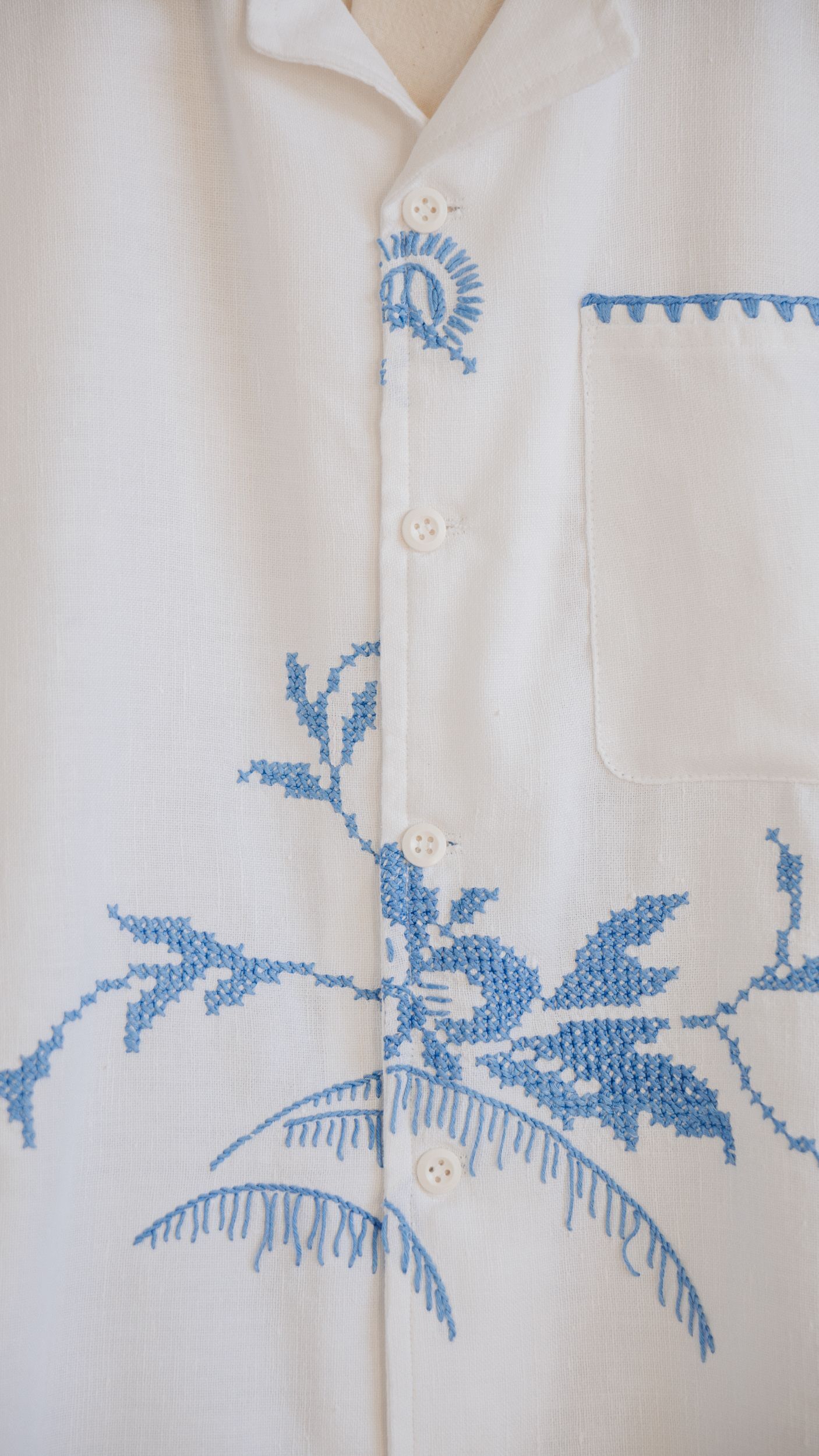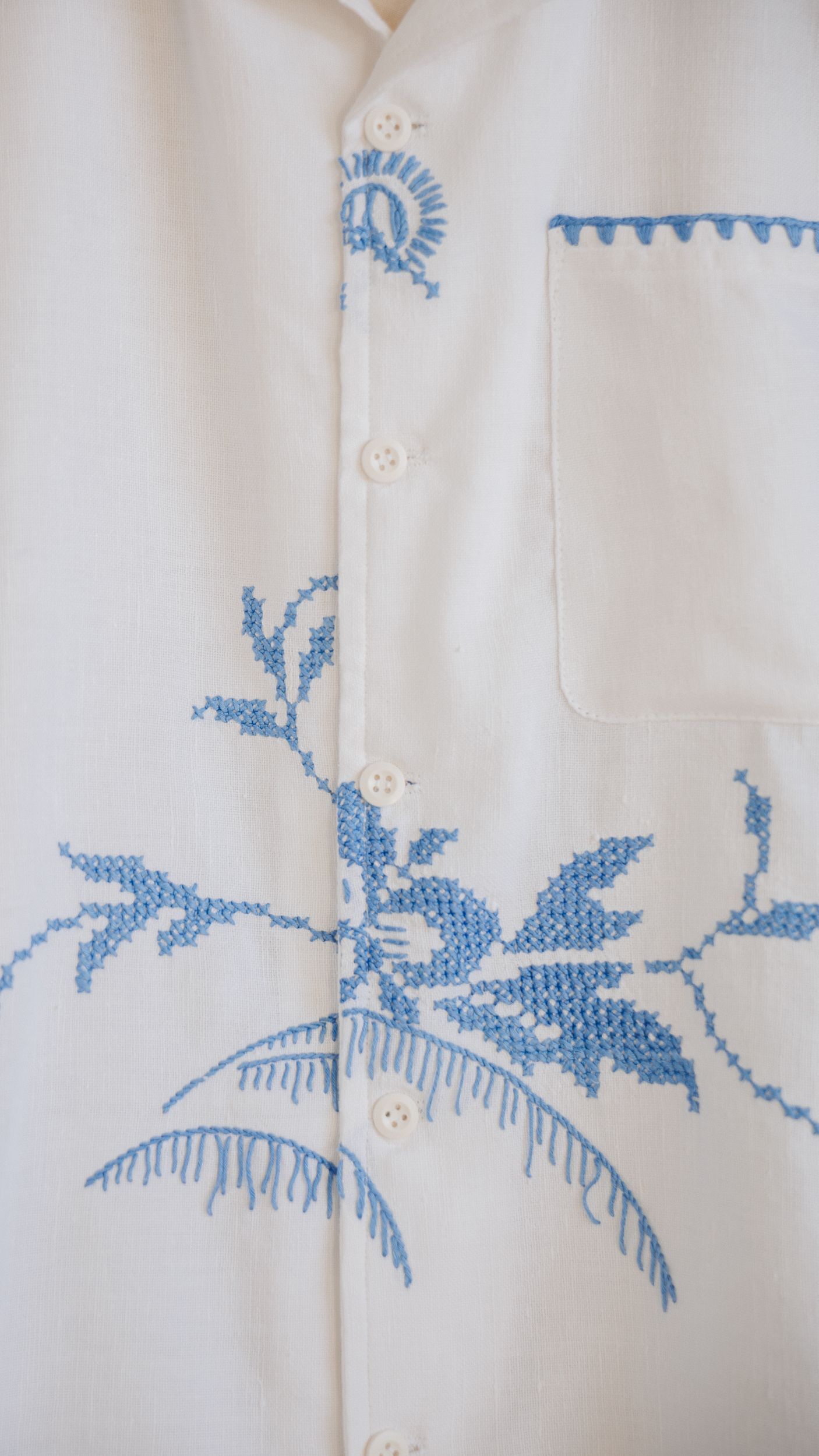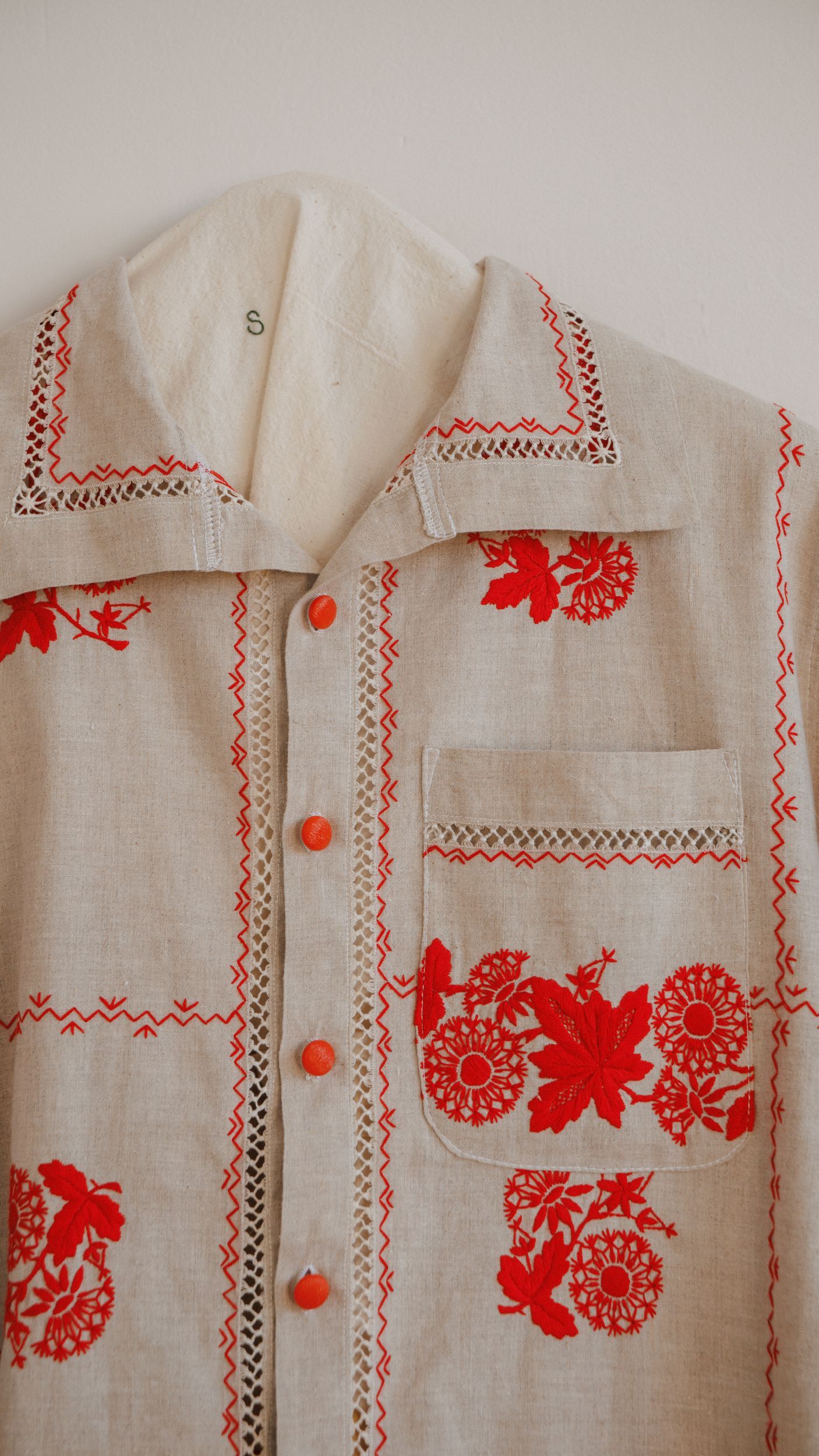 This one-of-a-kind long sleeve Shirt is made from a cotton tablecloth, circa 1960s. Tablecloth was featured with a handmade floral embroidery.