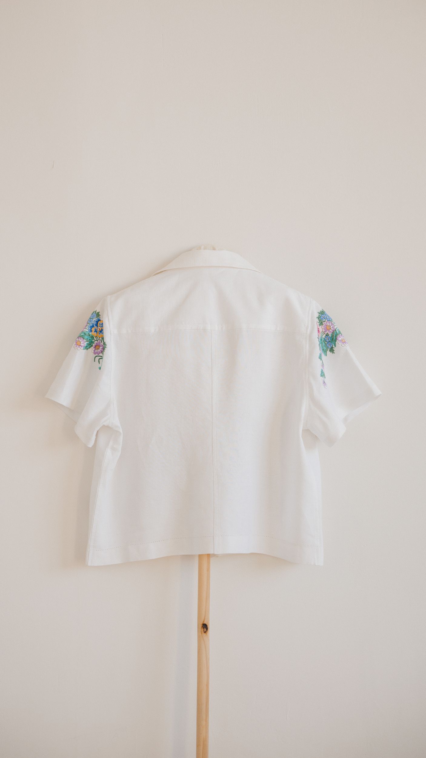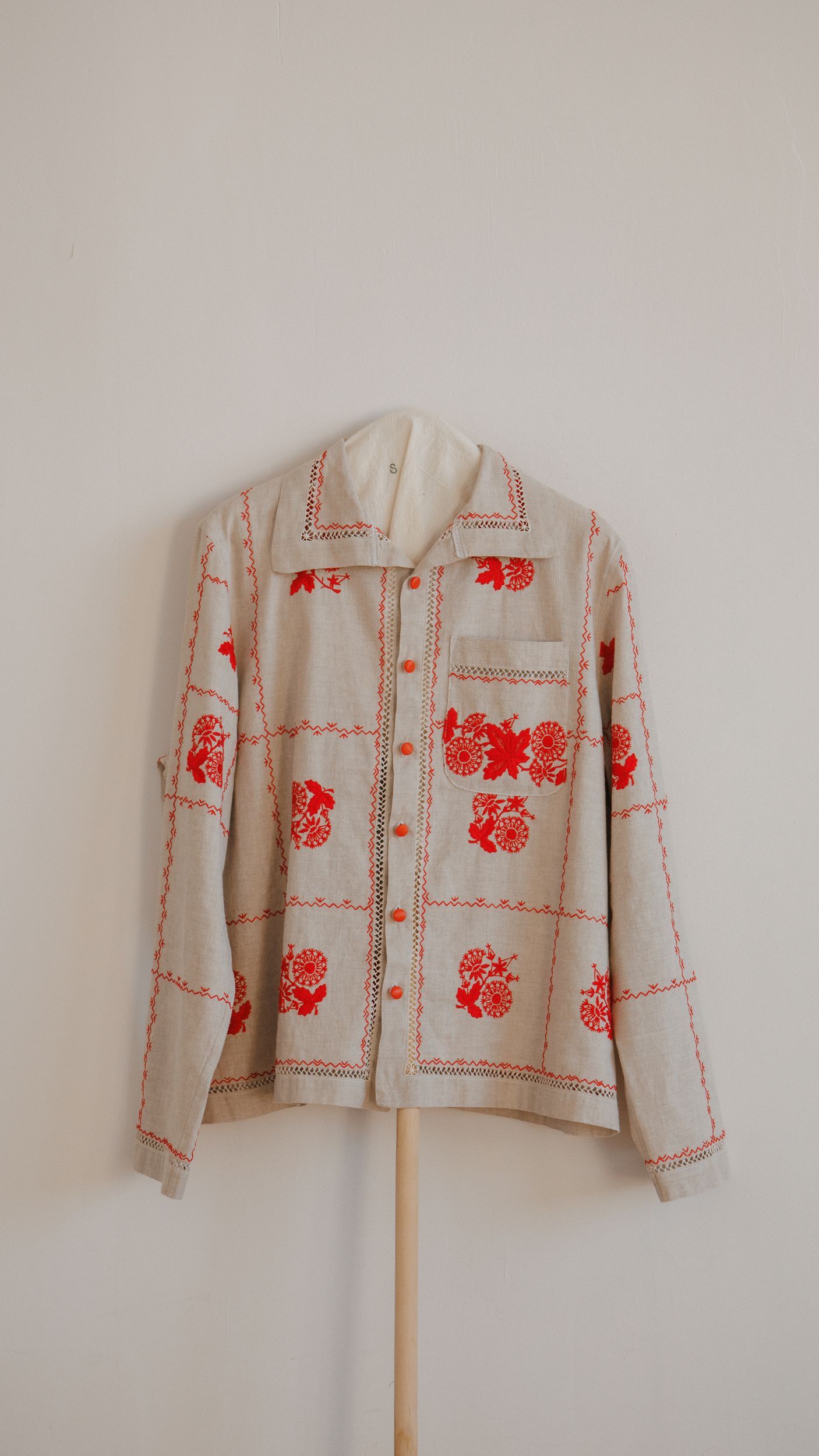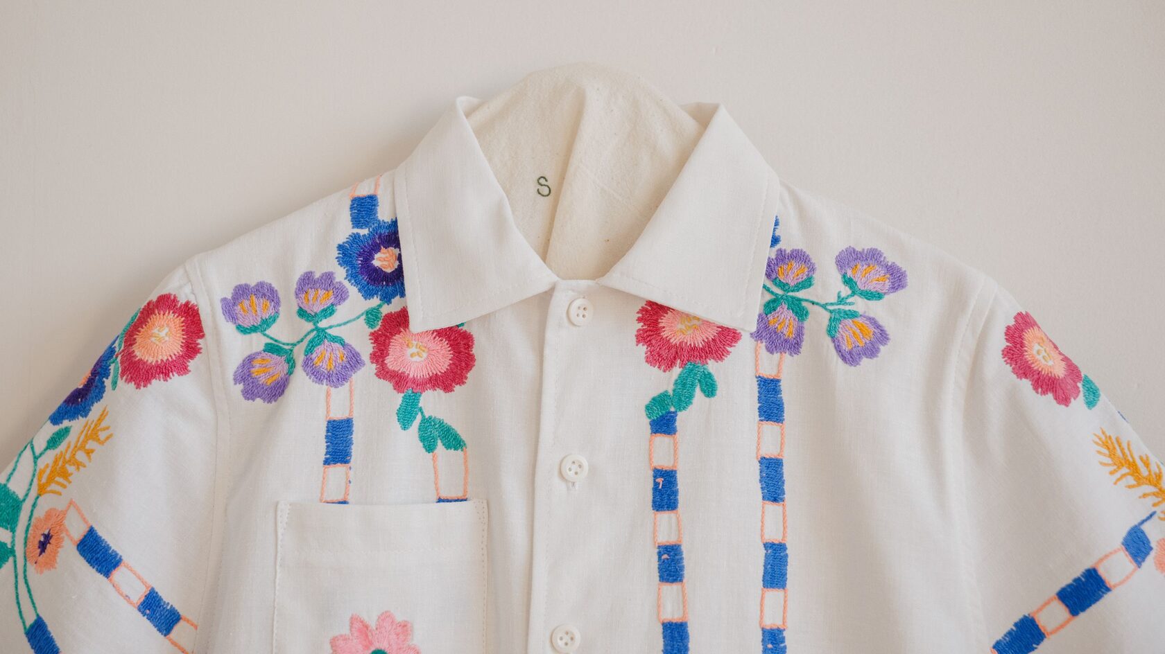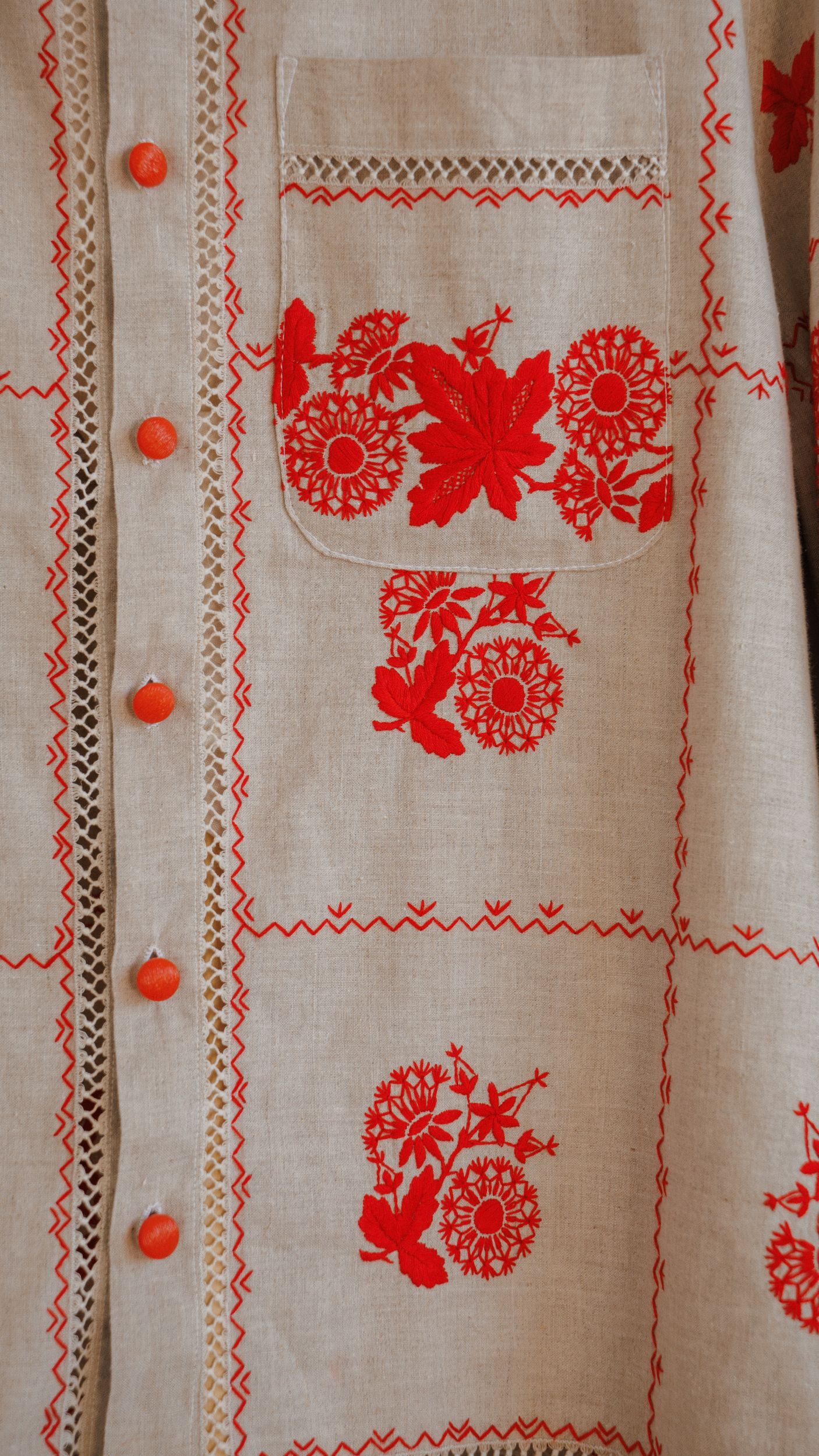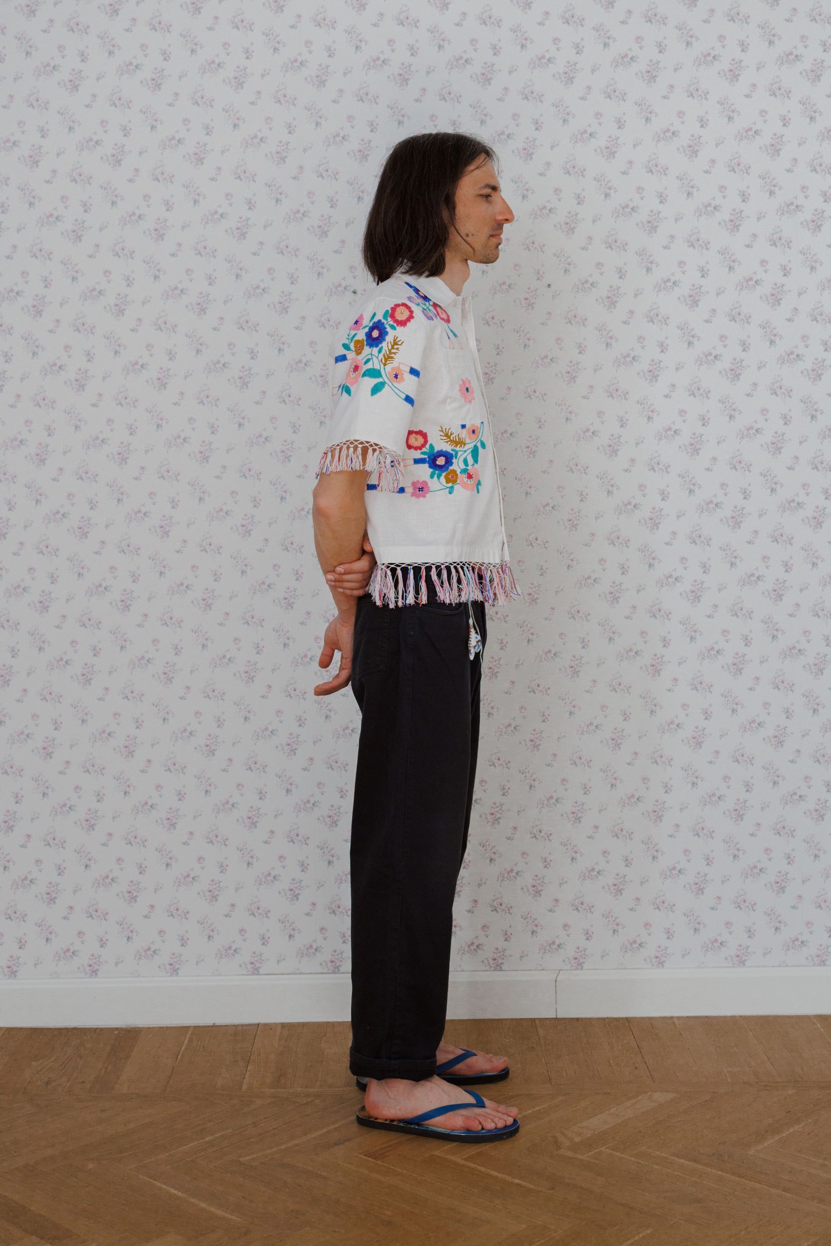 This one-of-a-kind long sleeve Shirt is made from a cotton tablecloth, circa 1960s. Tablecloth was featured with a handmade floral embroidery.