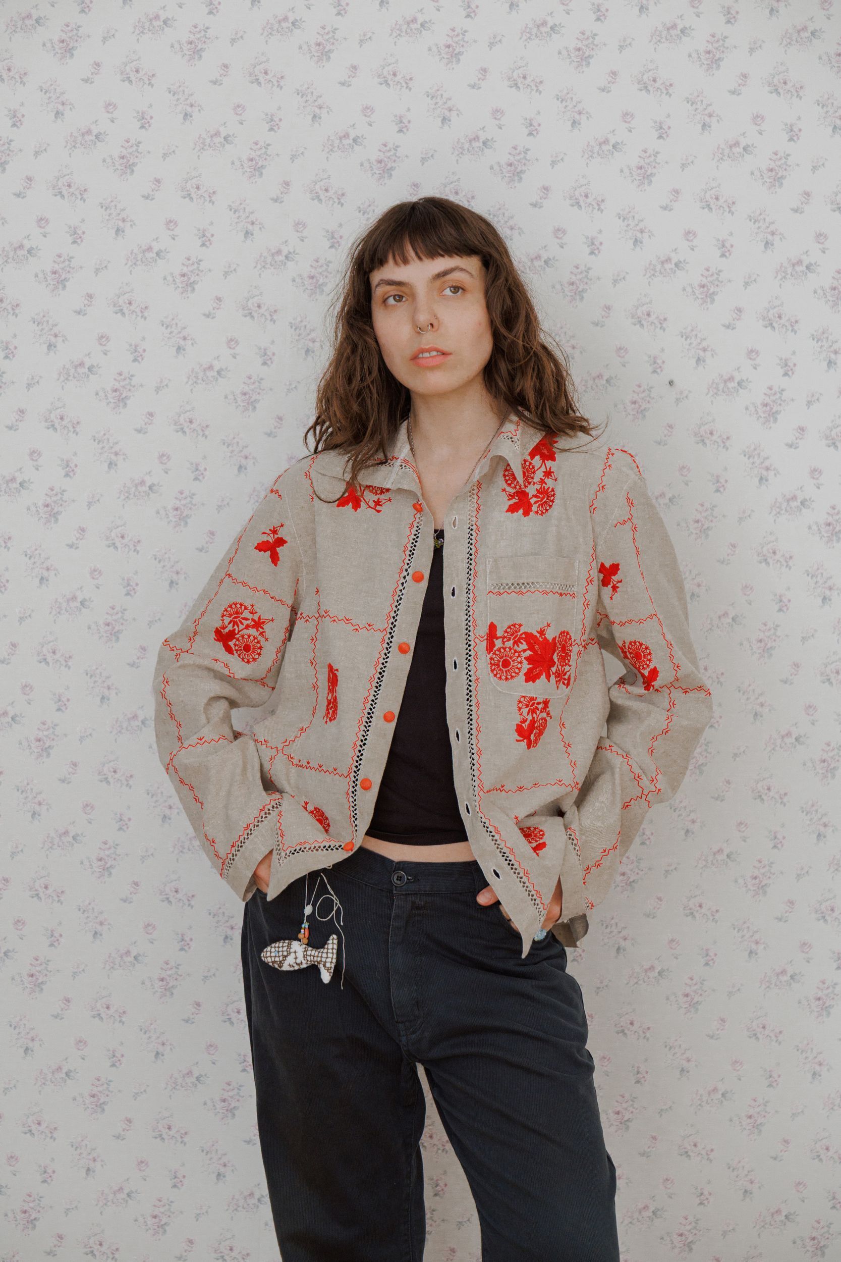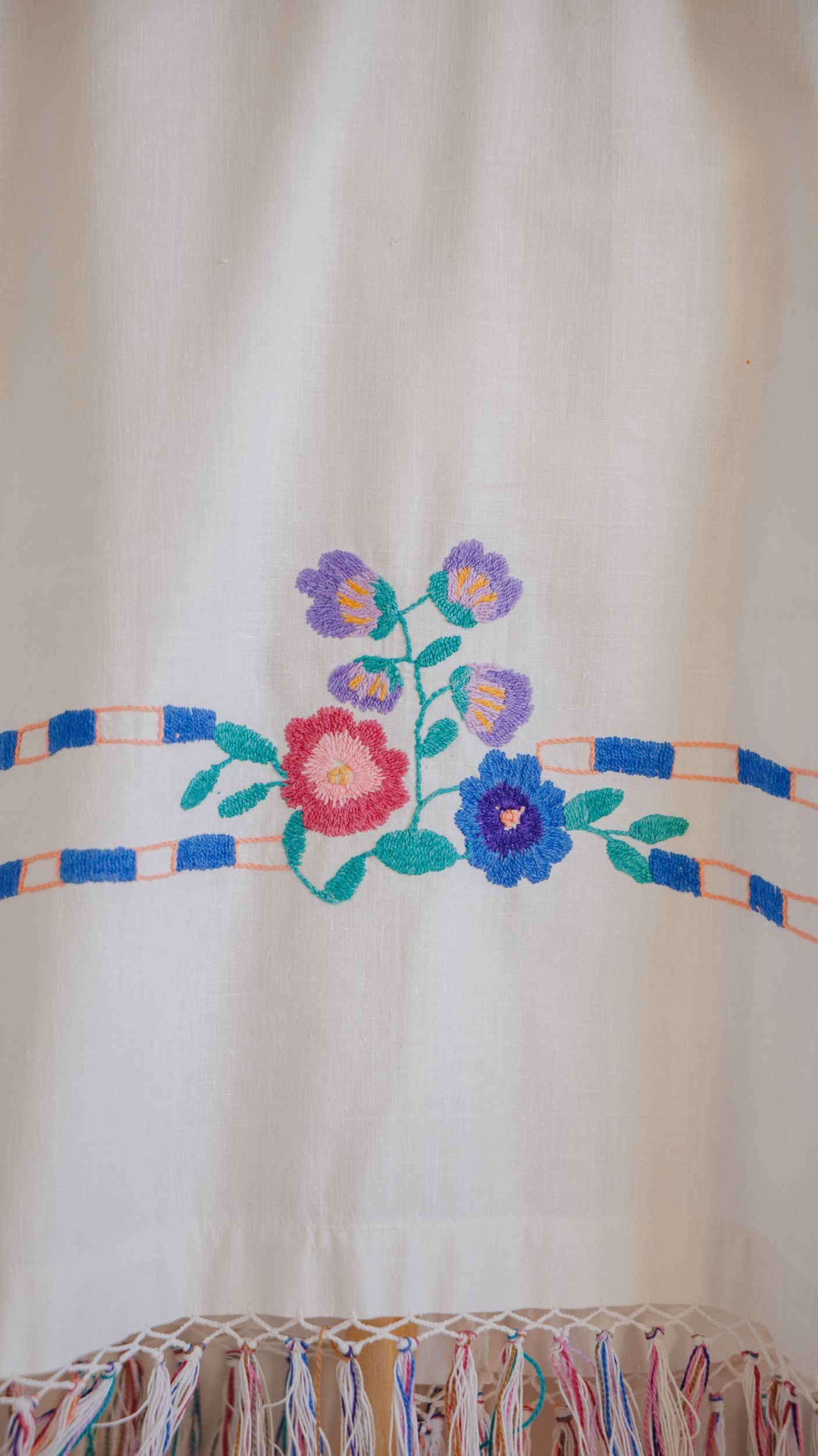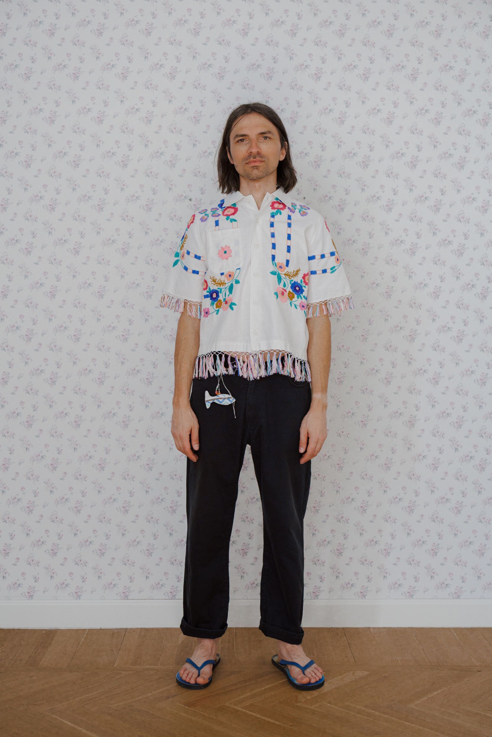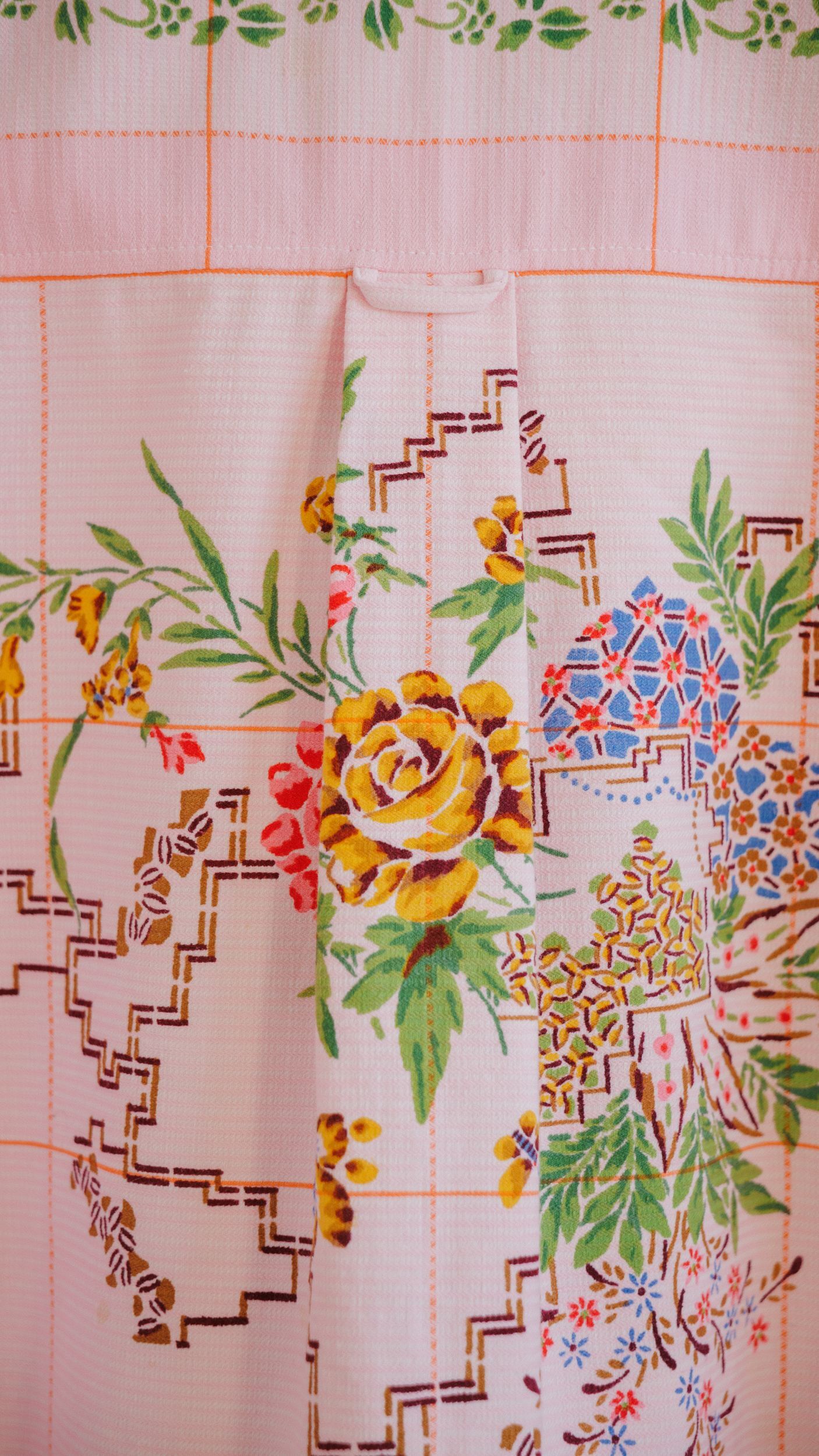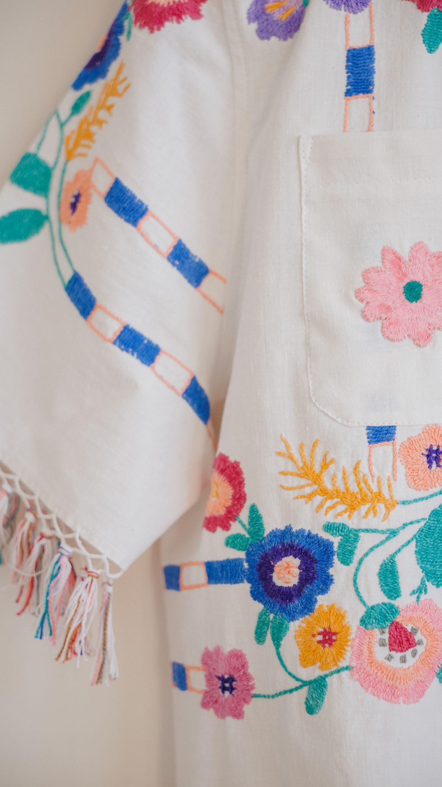 This one-of-a-kind long sleeve Shirt is made from a cotton tablecloth, circa 1960s. Tablecloth was featured with a handmade floral embroidery.