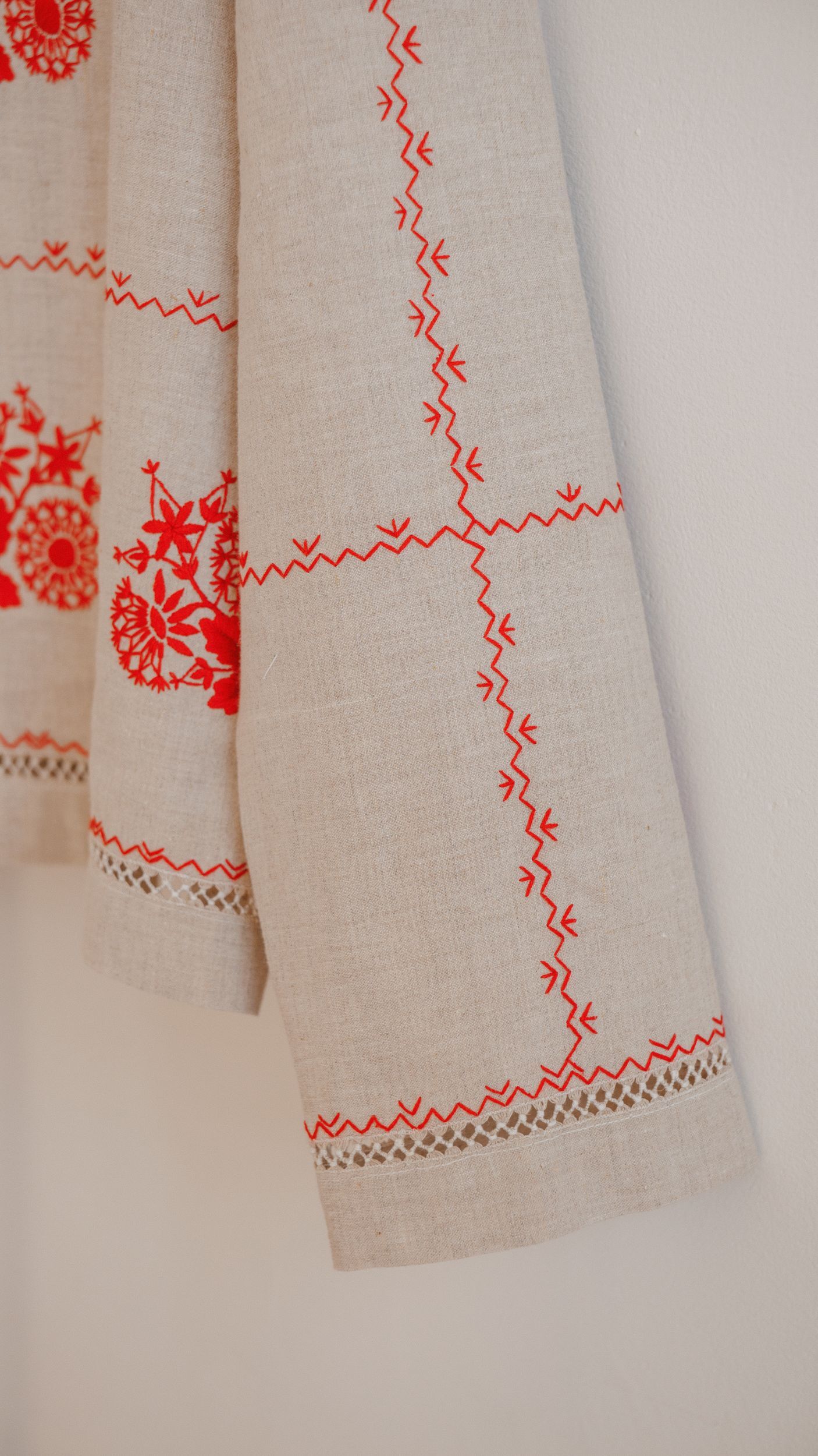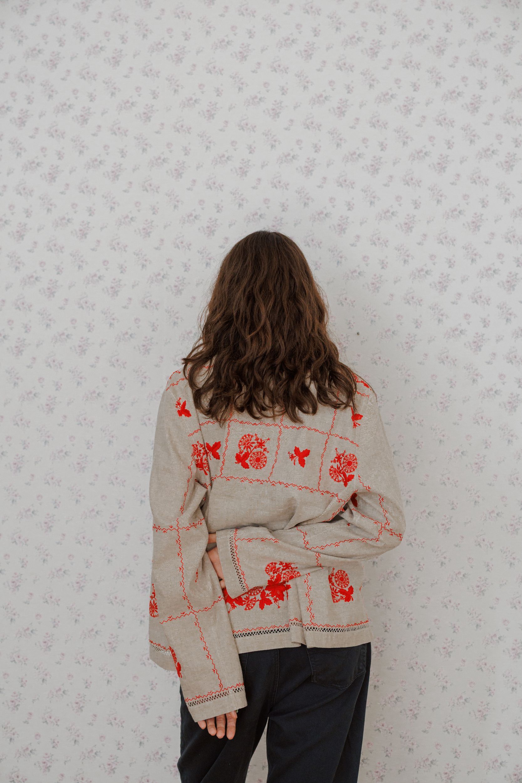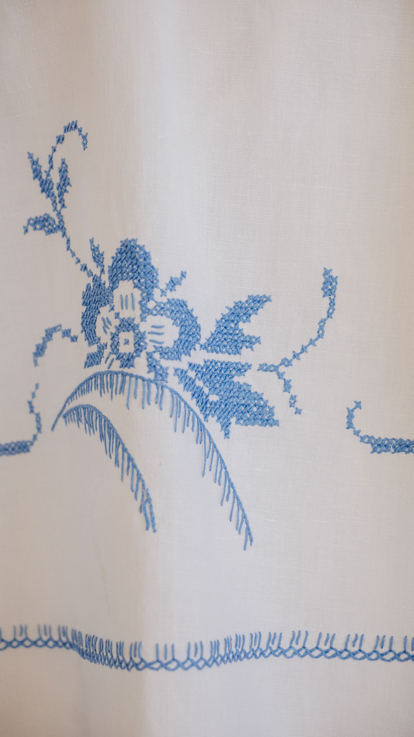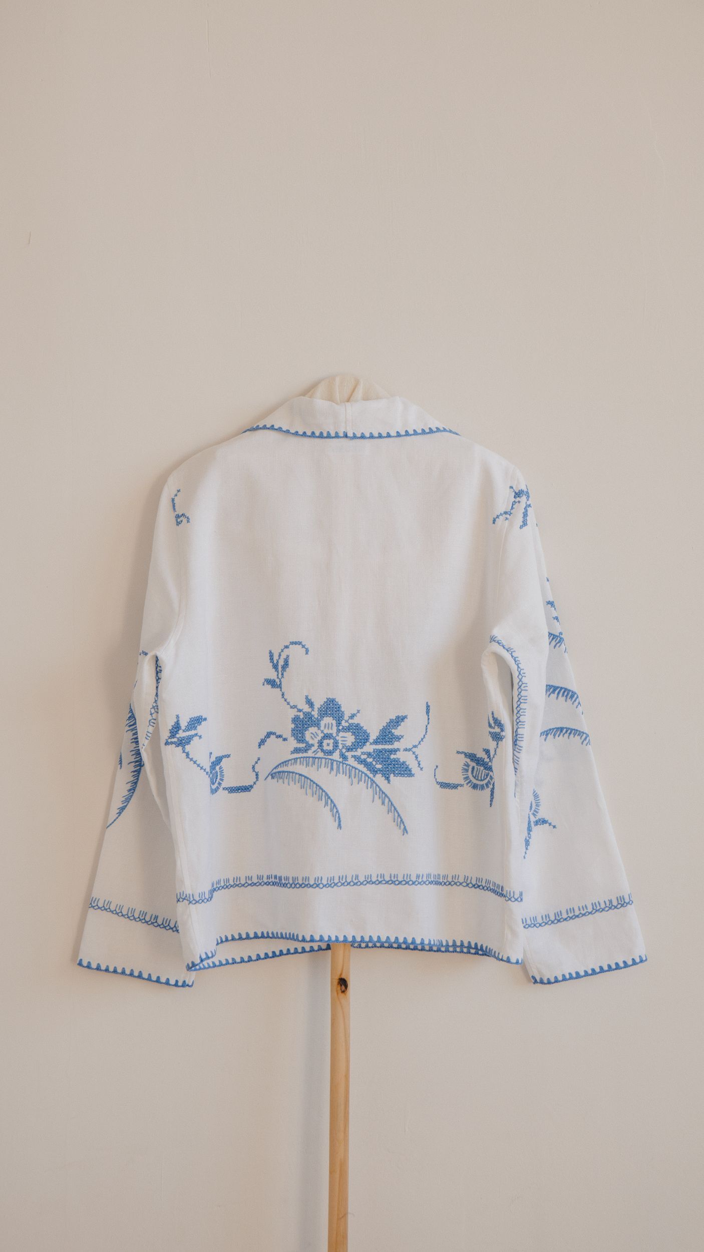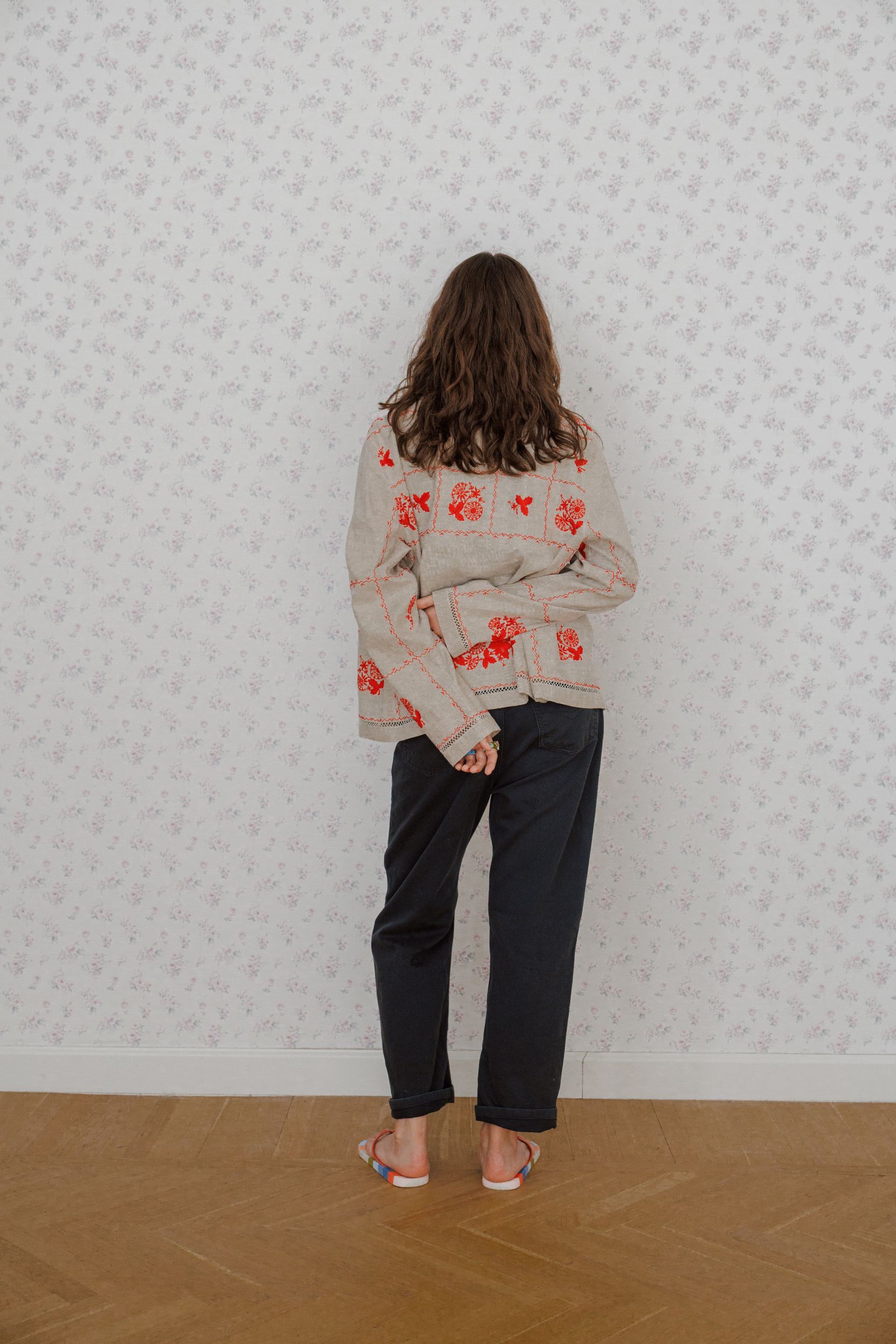 This one-of-a-kind long sleeve Shirt is made from a cotton tablecloth, circa 1960s. Tablecloth was featured with a handmade floral embroidery.