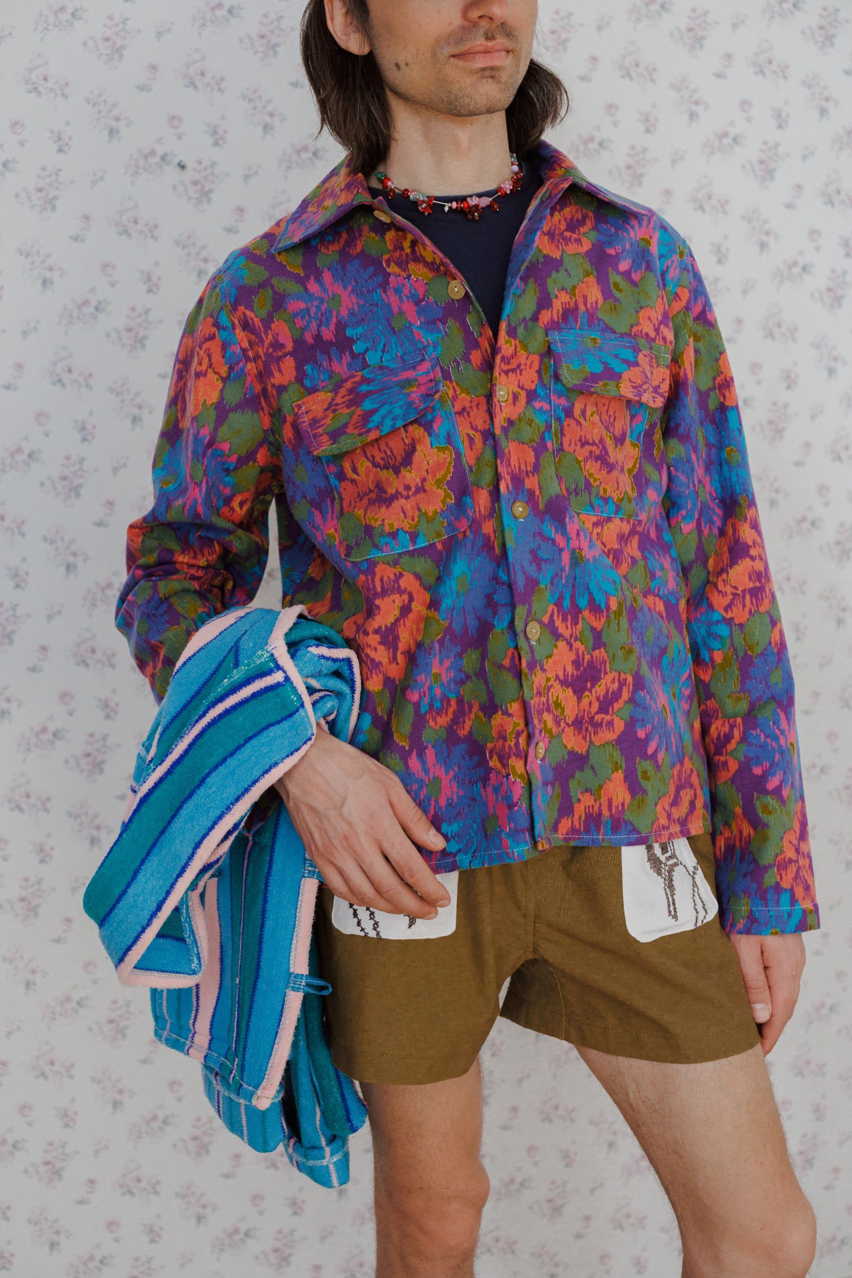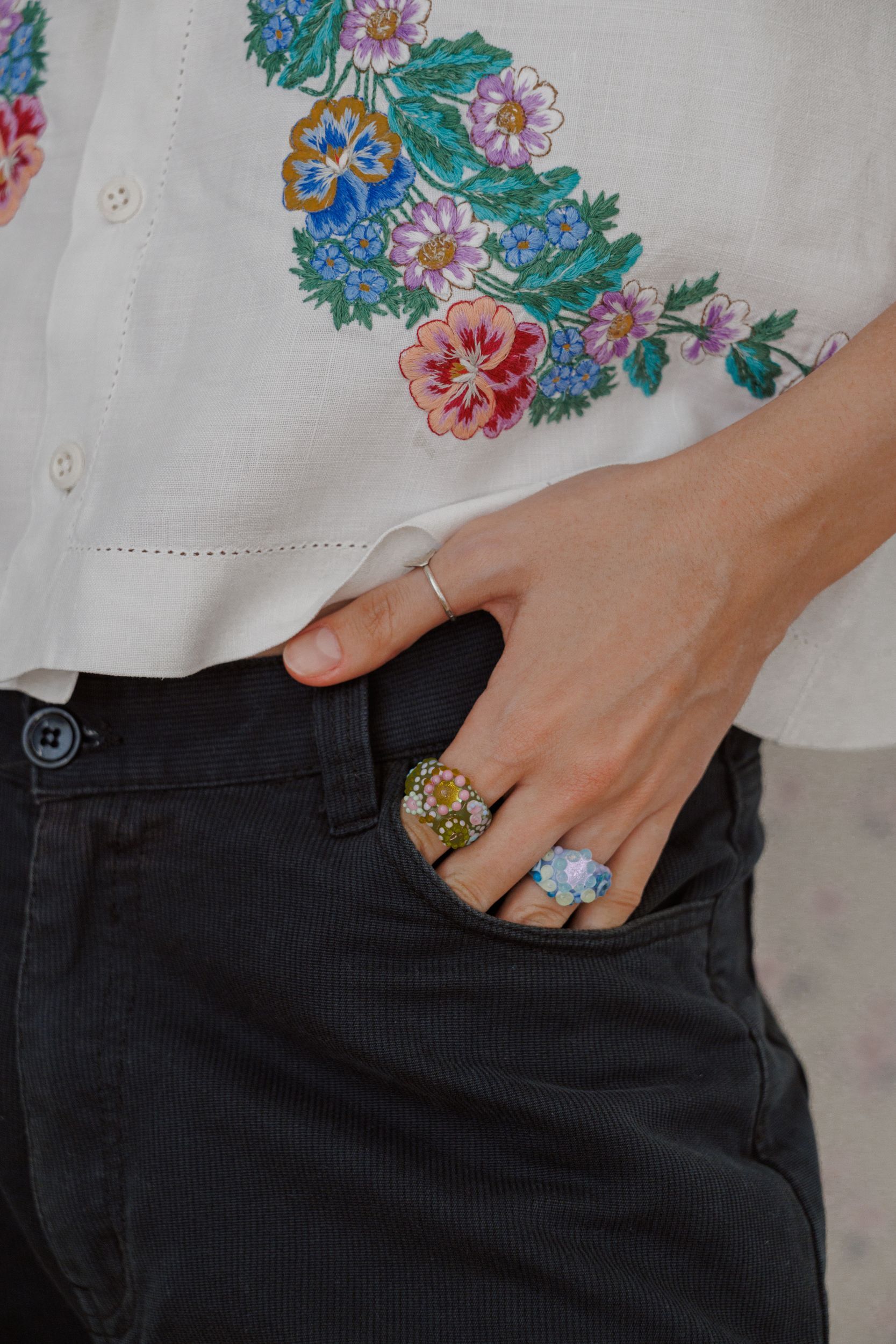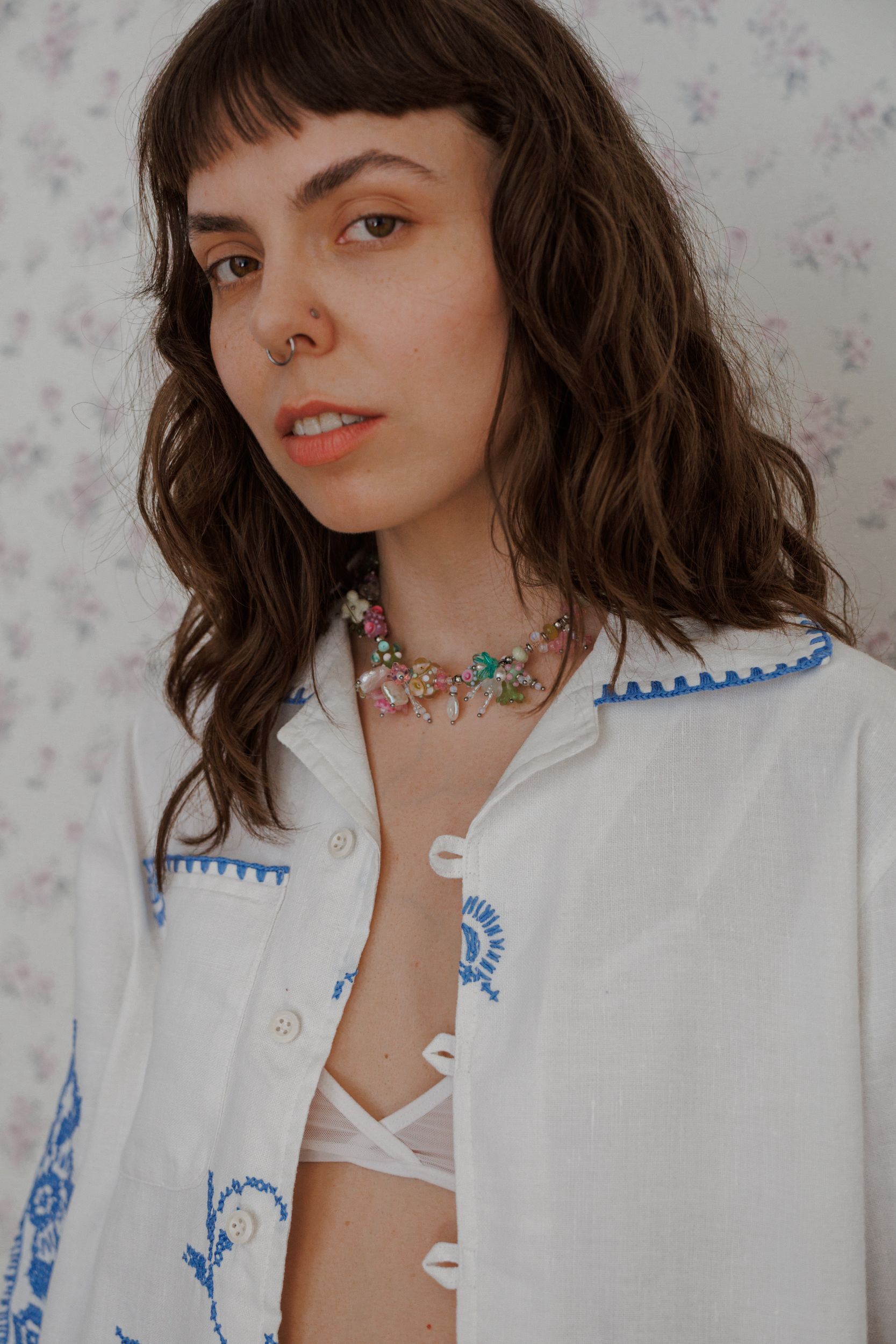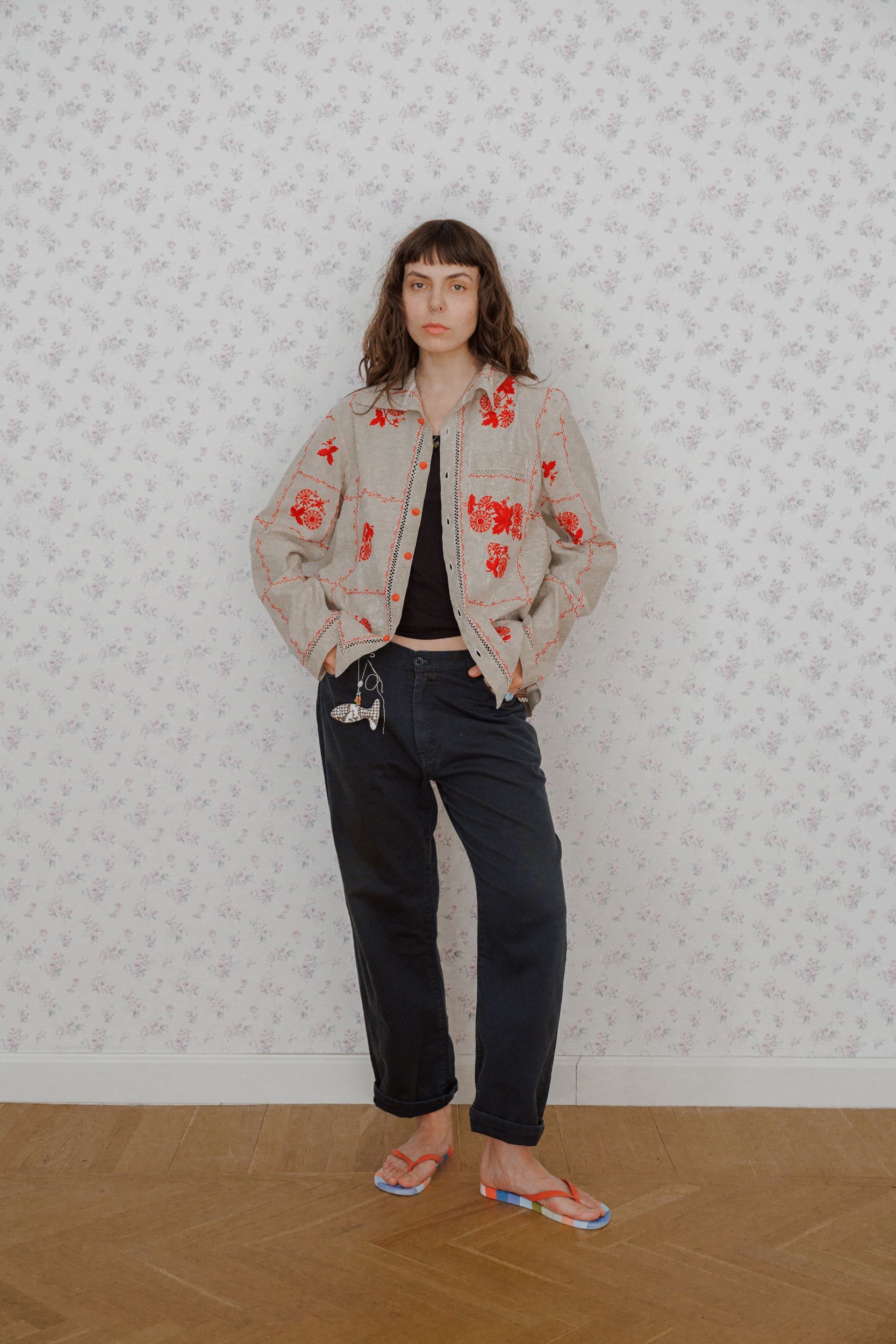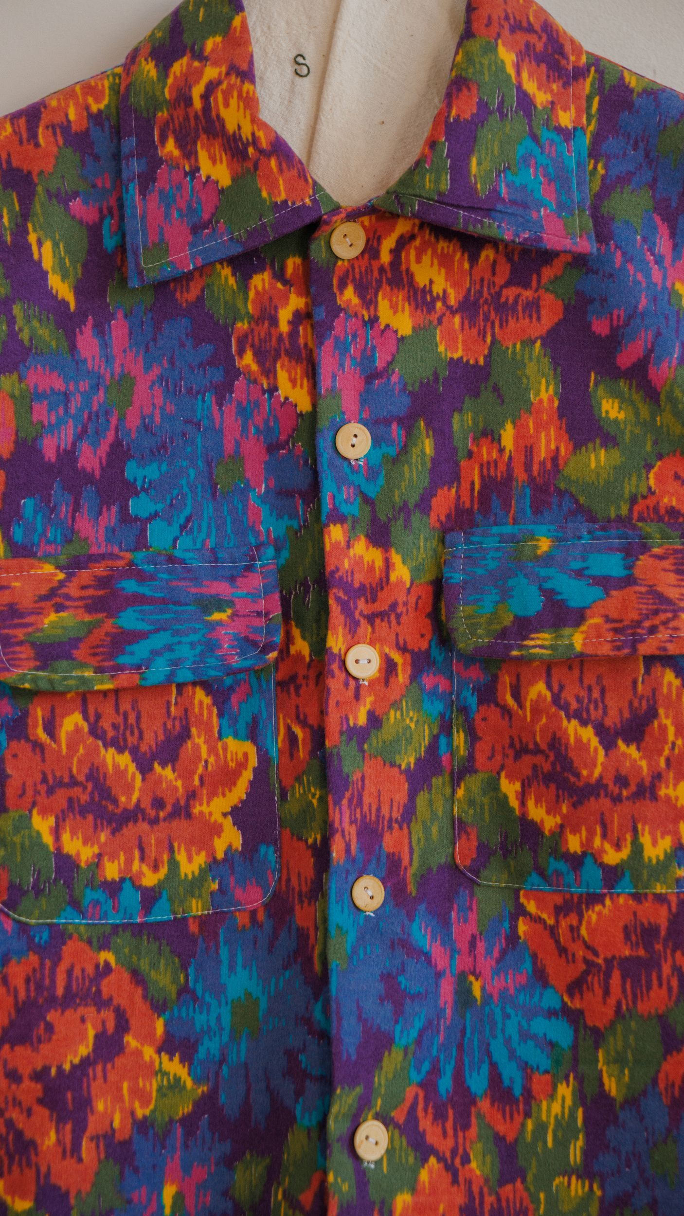 This one-of-a-kind long sleeve Shirt is made from a cotton tablecloth, circa 1960s. Tablecloth was featured with a handmade floral embroidery.