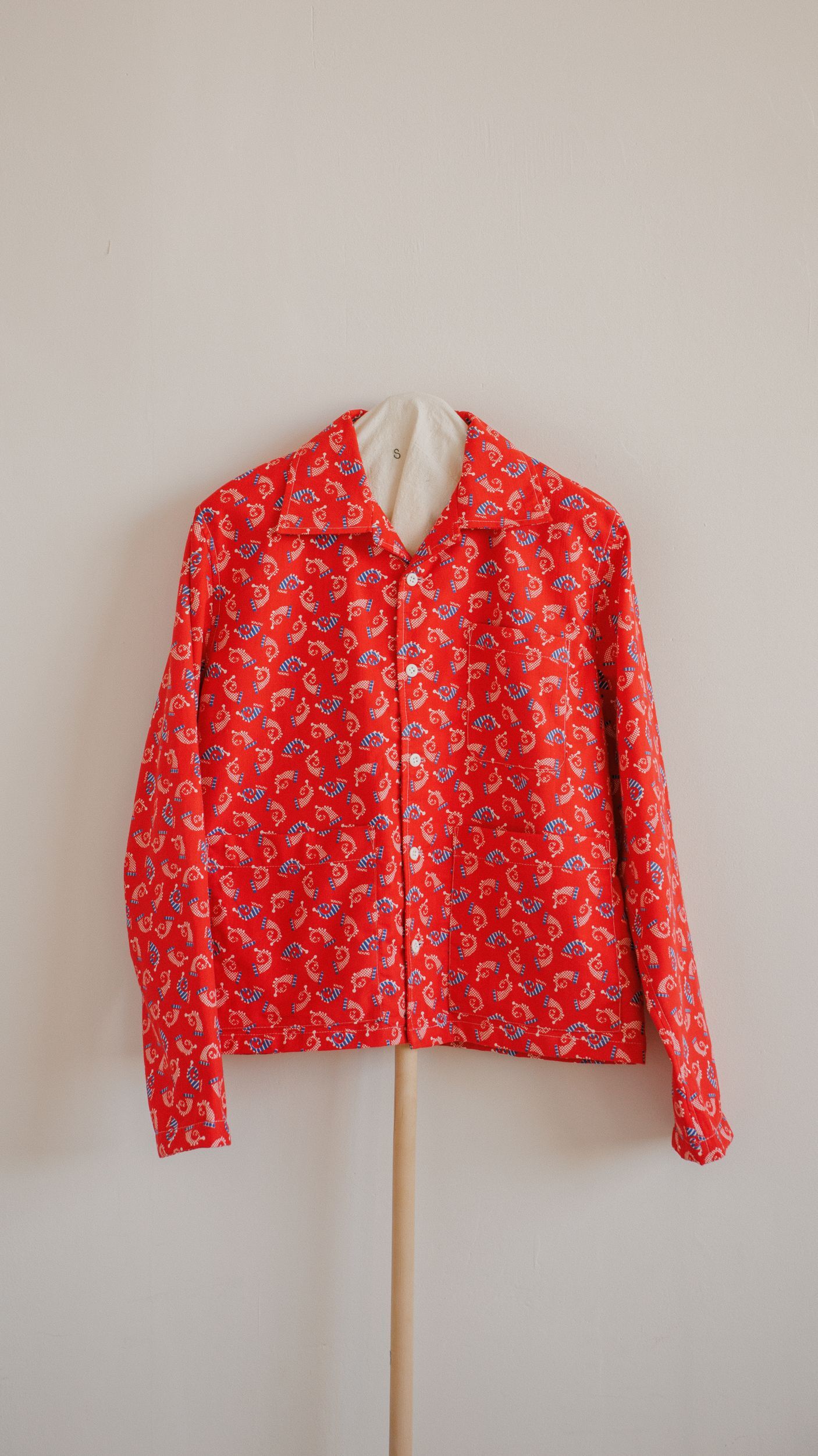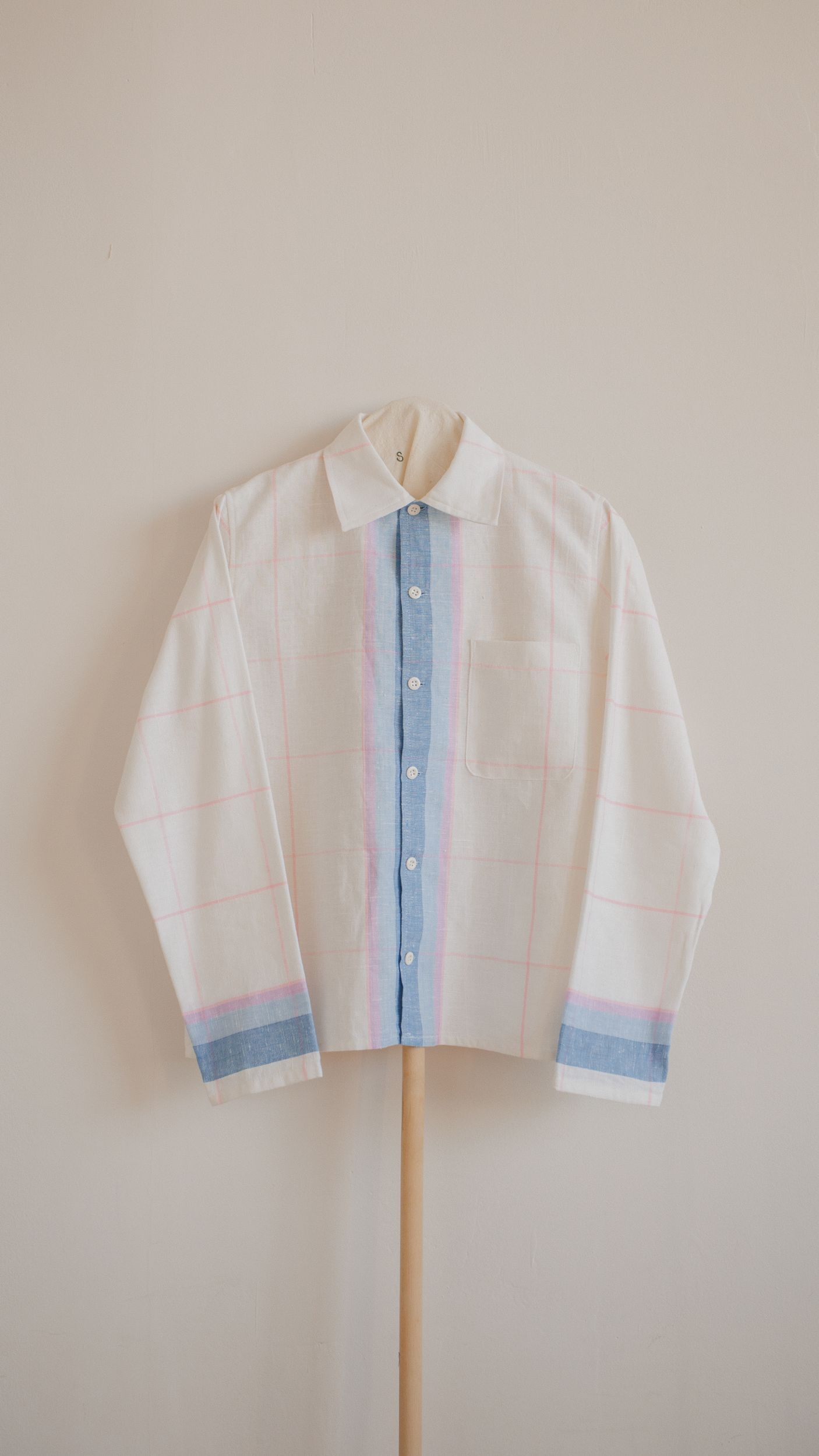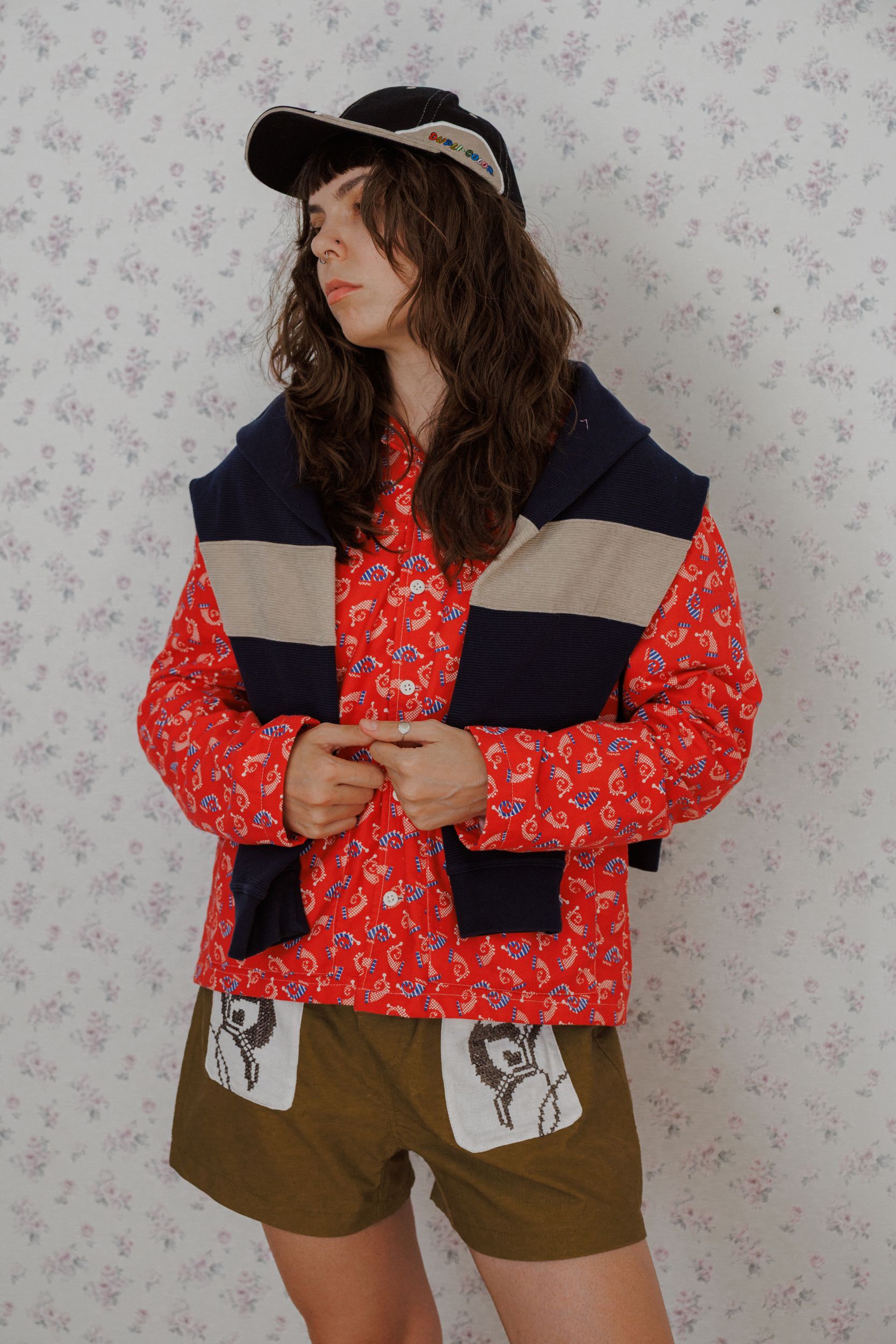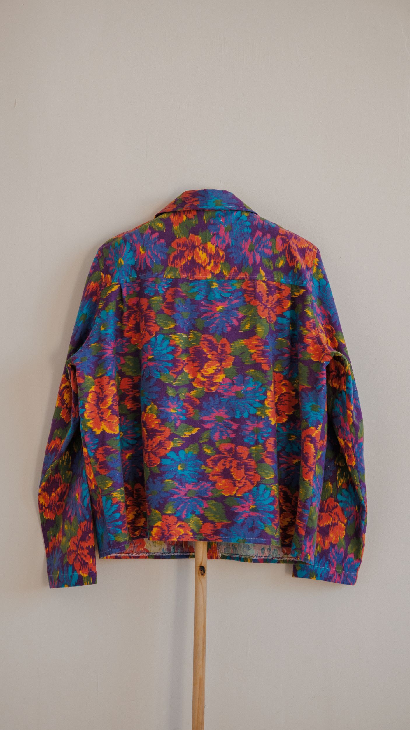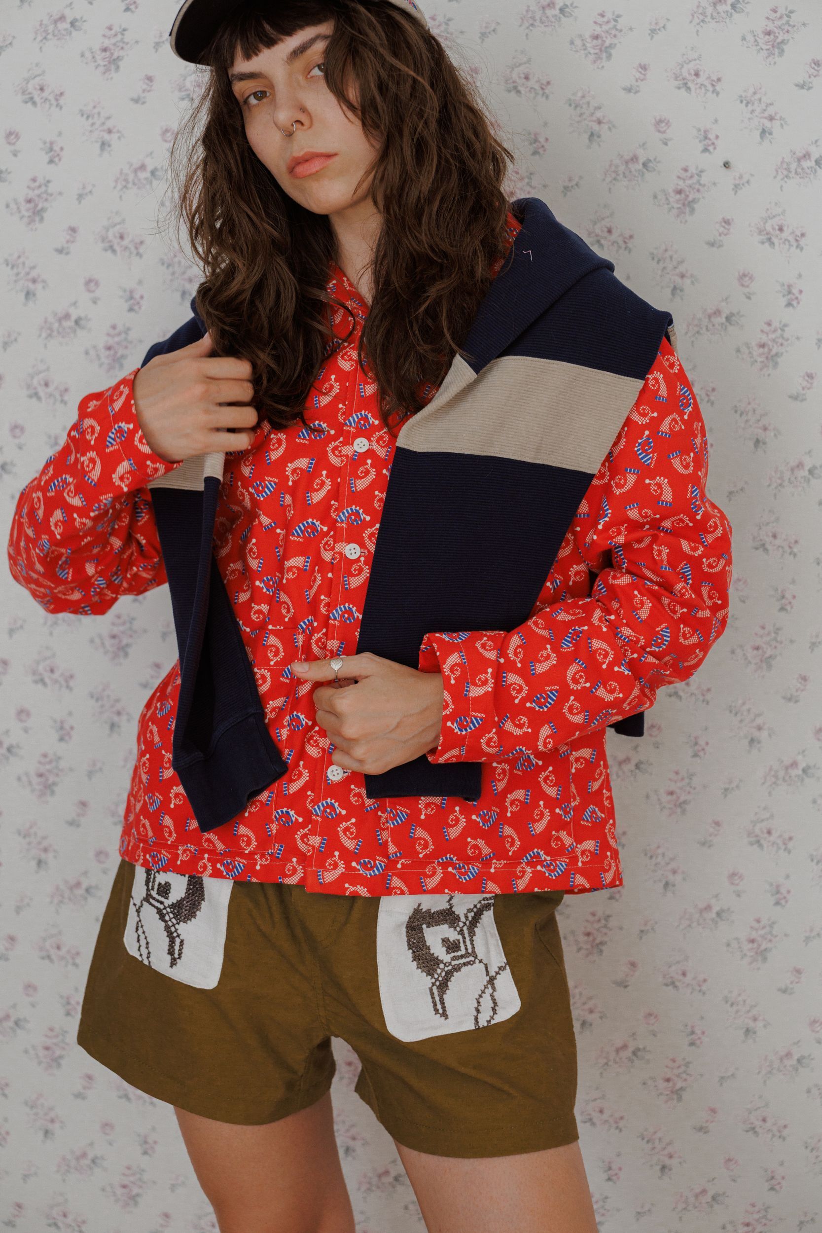 This one-of-a-kind long sleeve Shirt is made from a cotton tablecloth, circa 1960s. Tablecloth was featured with a handmade floral embroidery.