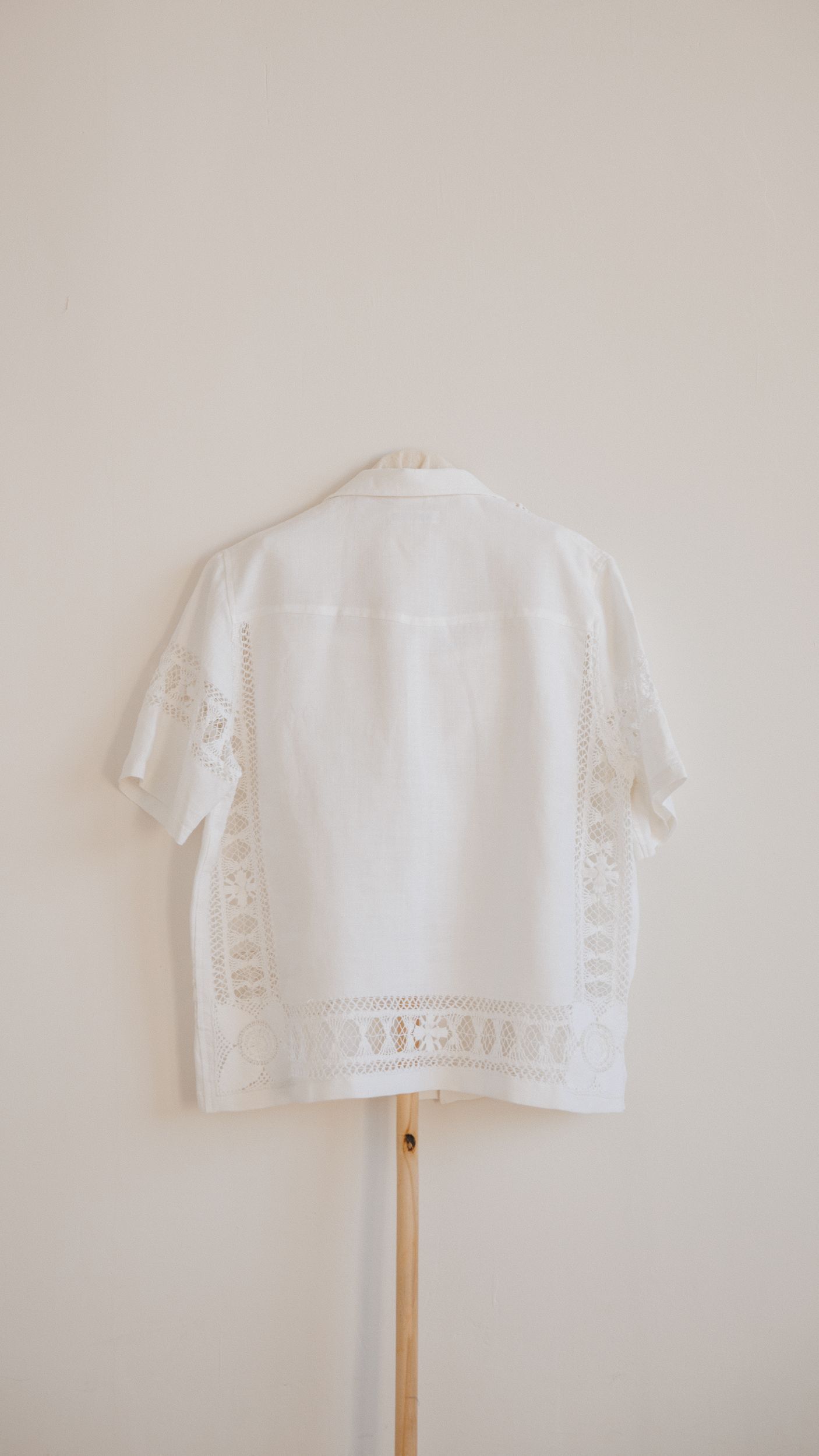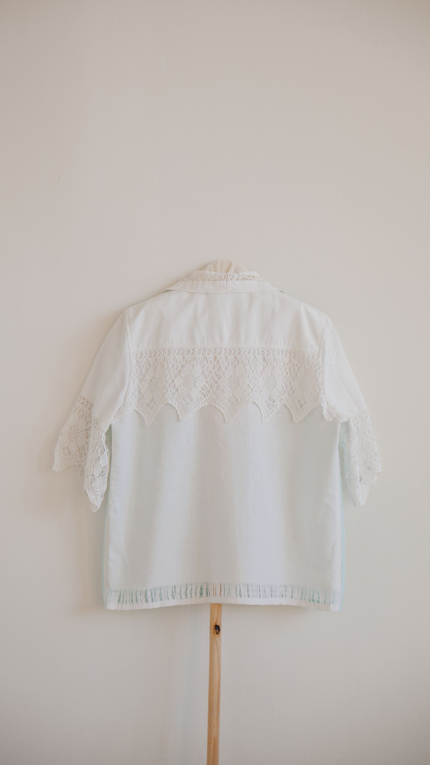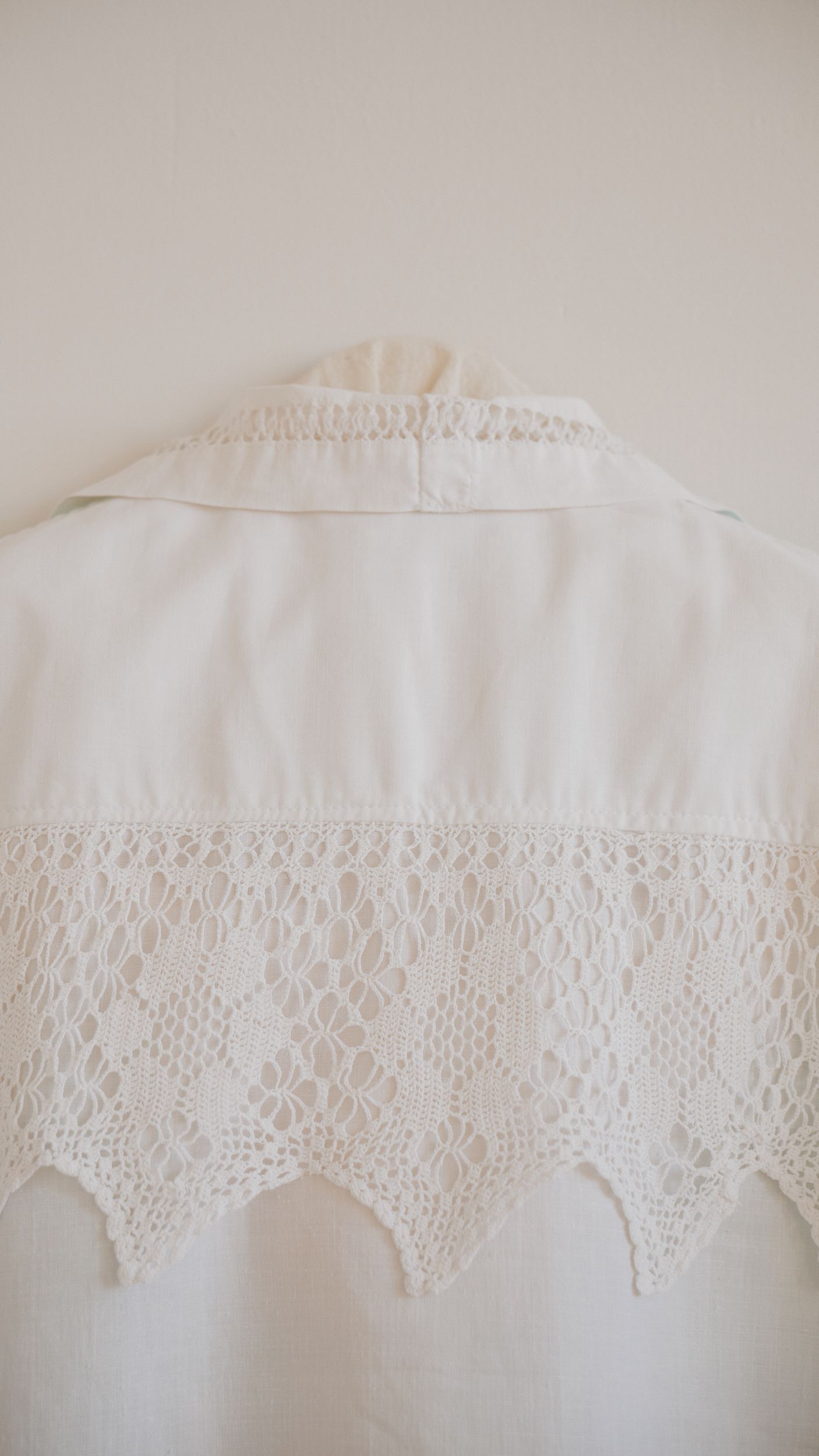 This one-of-a-kind short sleeve Shirt is made from a cotton tablecloth, circa 1980s. Tablecloth was featured with a cotton lace and satin ribbons embroidery.