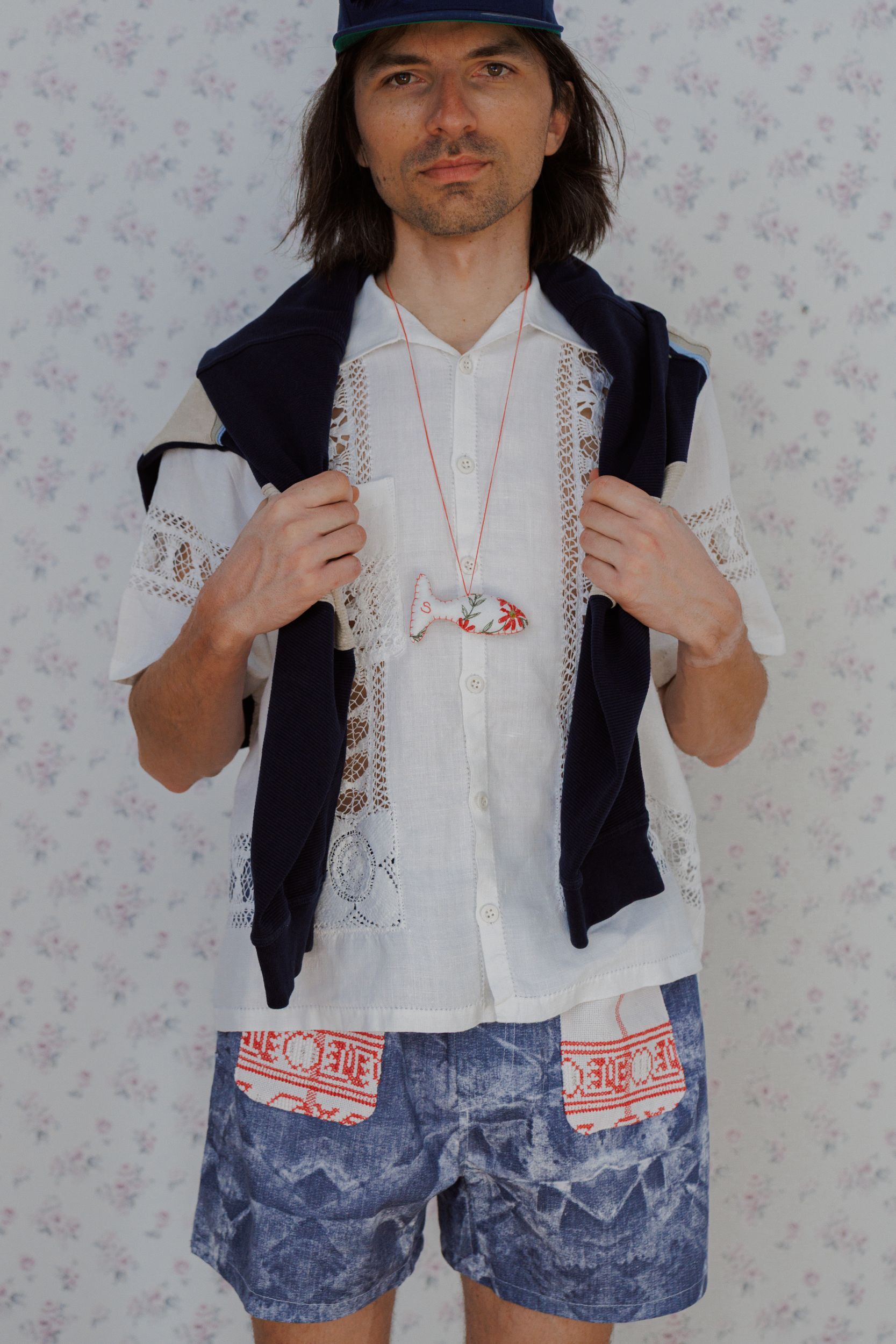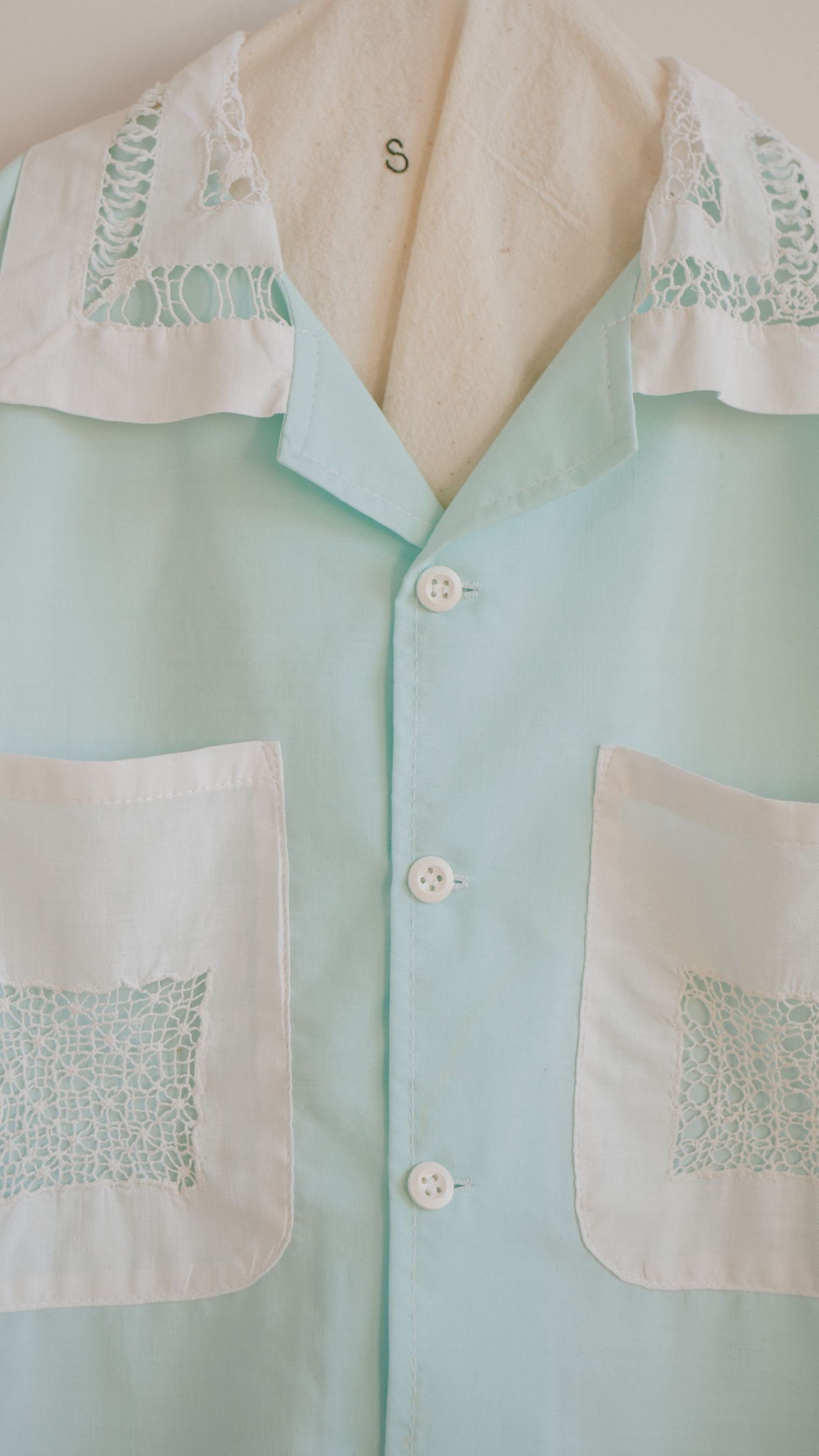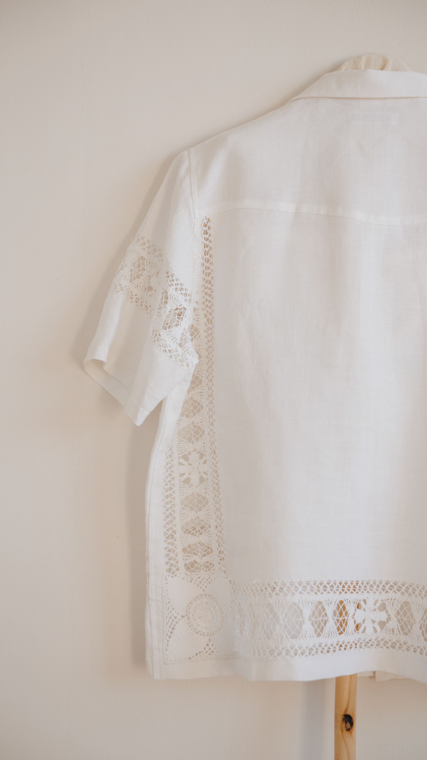 This one-of-a-kind short sleeve Shirt is made from a cotton tablecloth, circa 1980s. Tablecloth was featured with a cotton lace and satin ribbons embroidery.