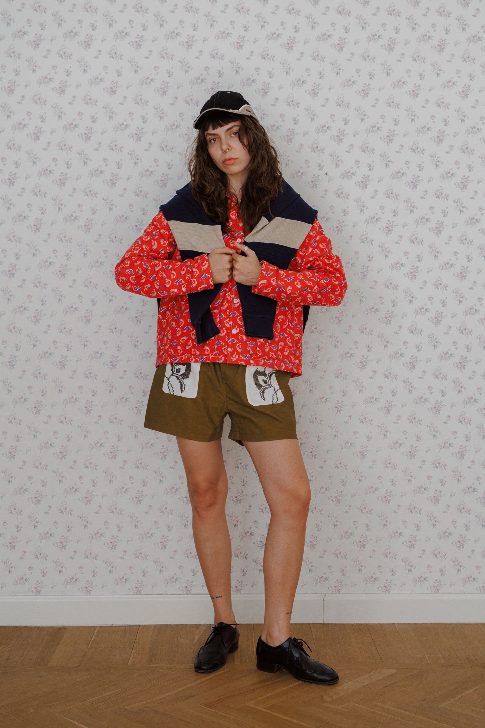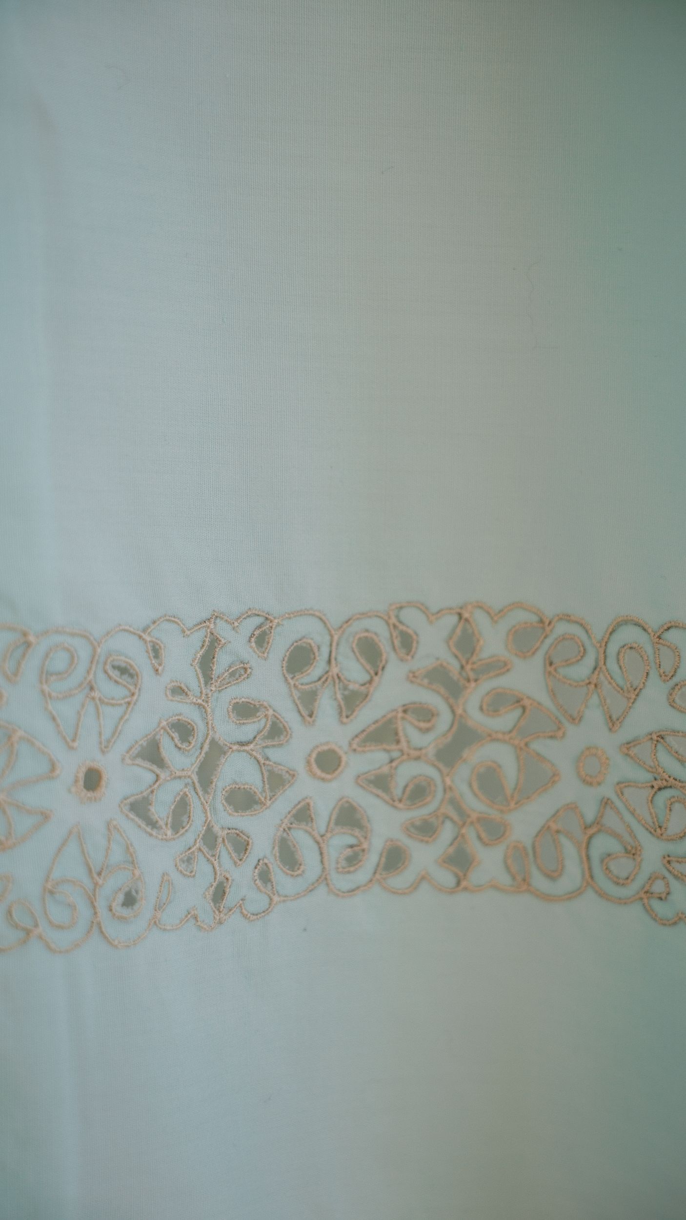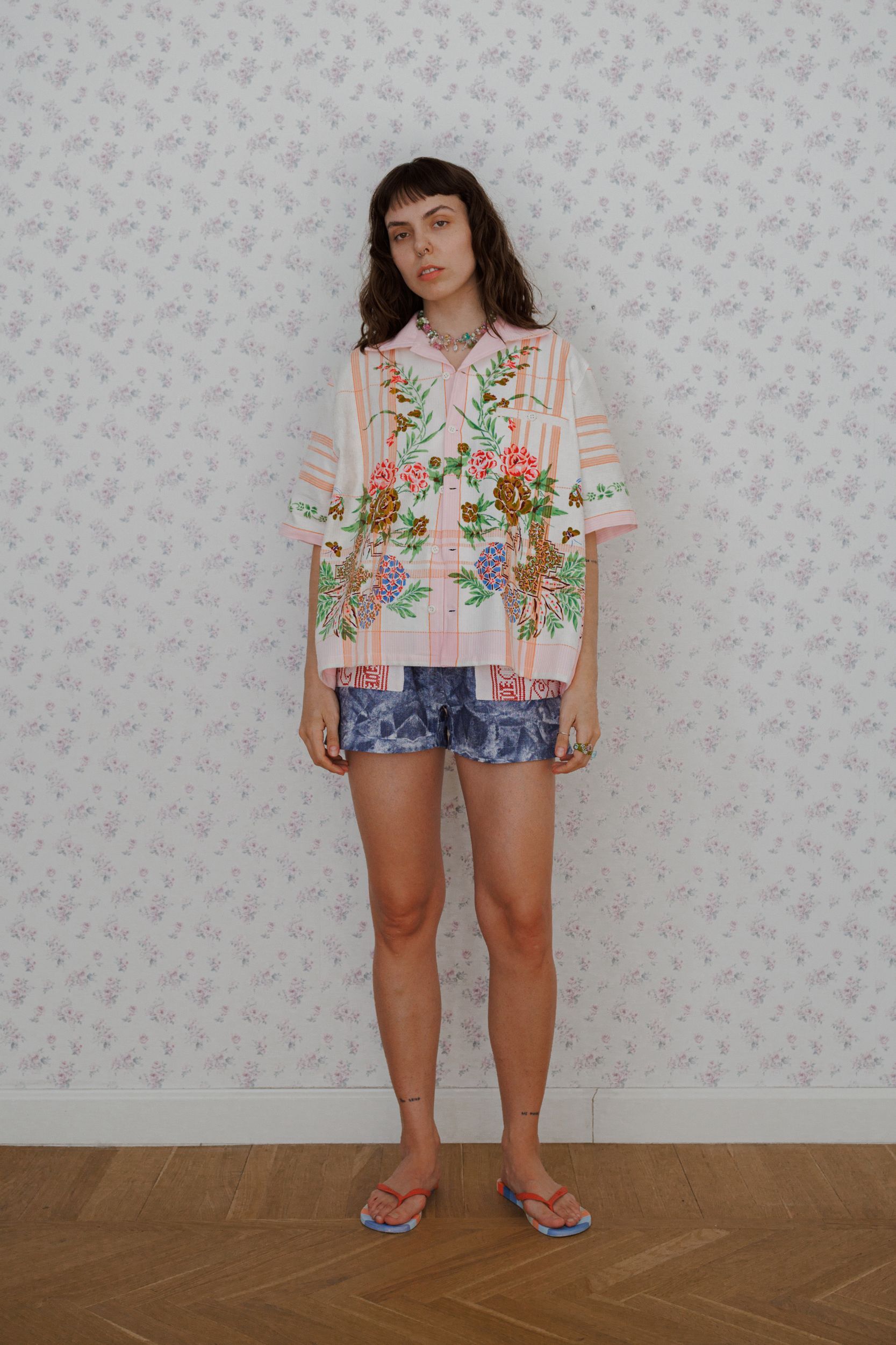 Рубашка с короткими рукавами сшита в одном экземпляре из хлопковой скатерти (хлопок 100%), периода 1980х годов. Скатерть выполнена из плетеного крупного кружева и хлопка расшитого цветами из атласных лент.