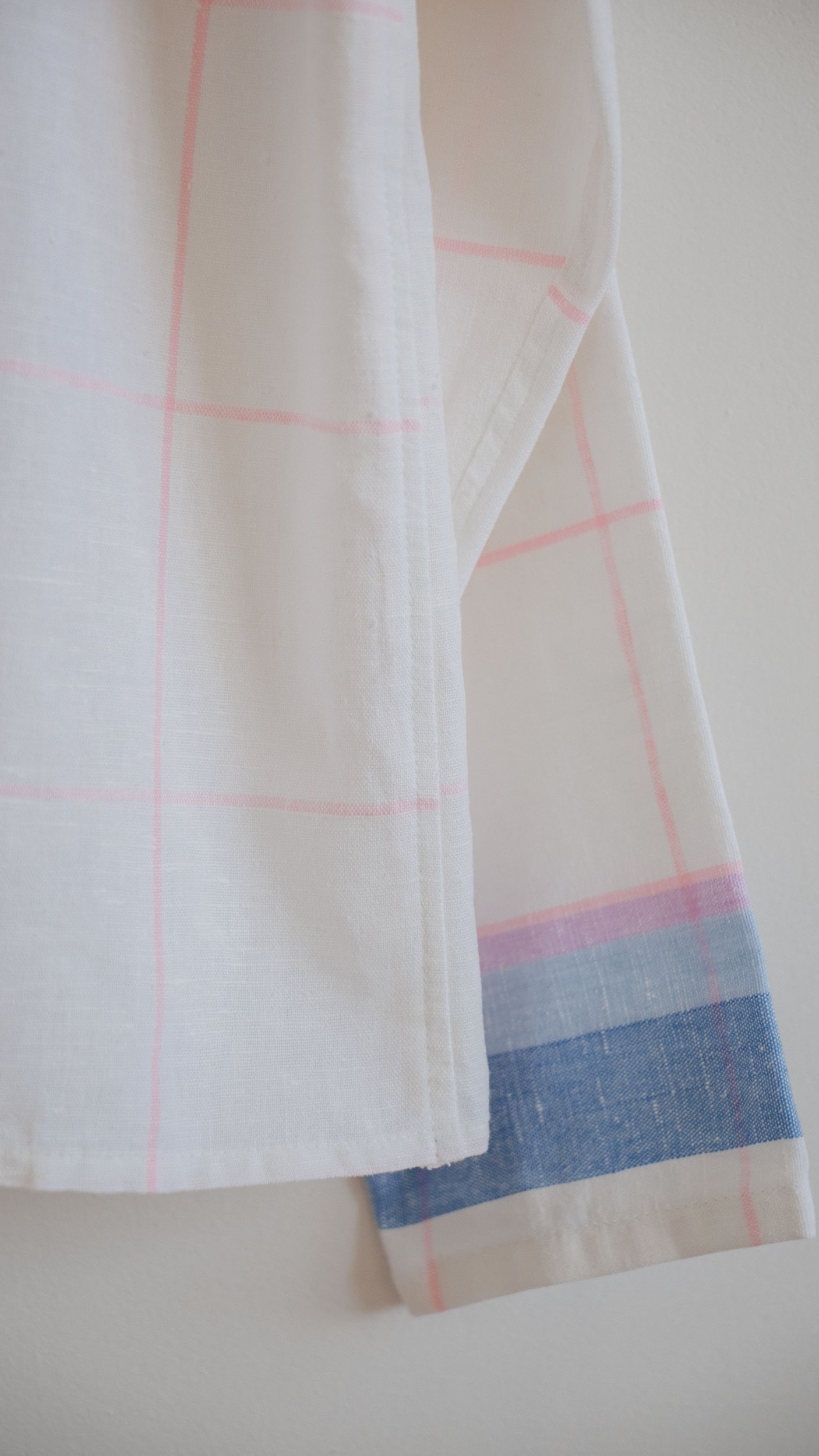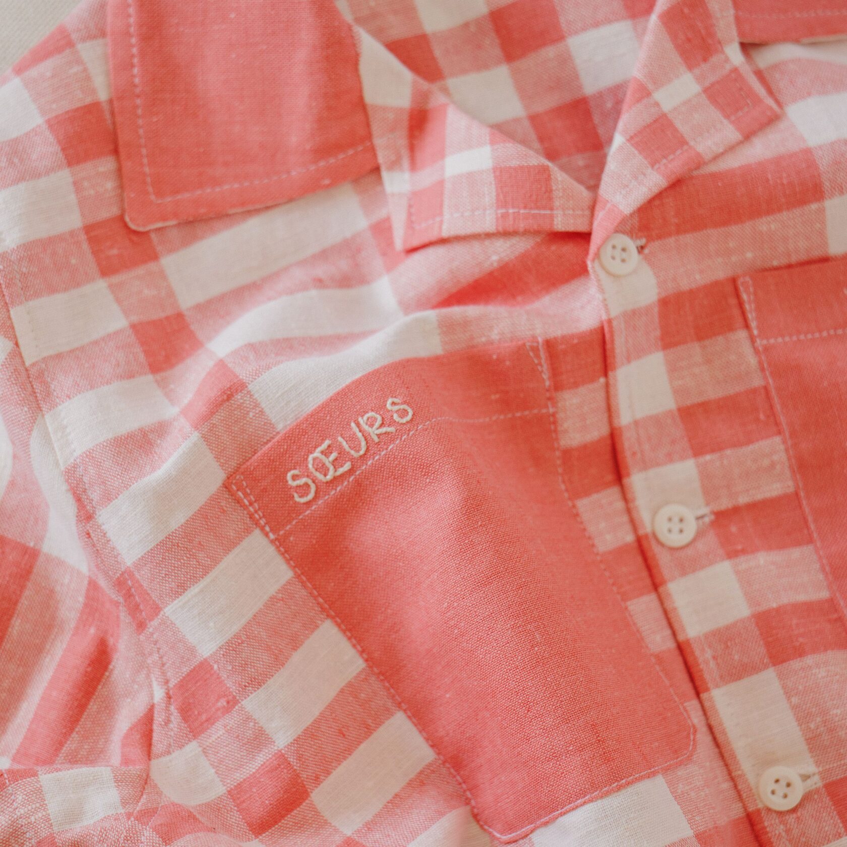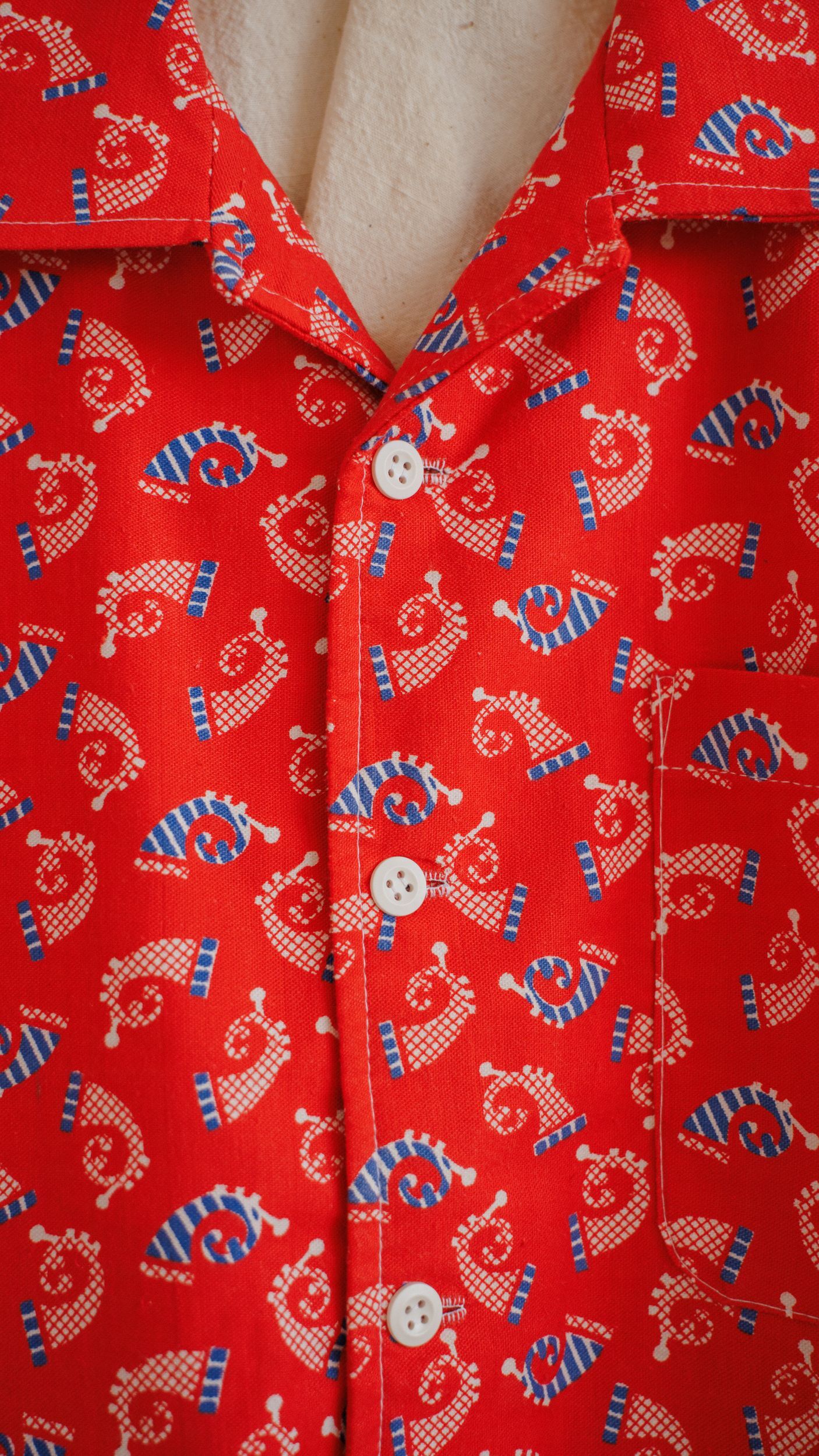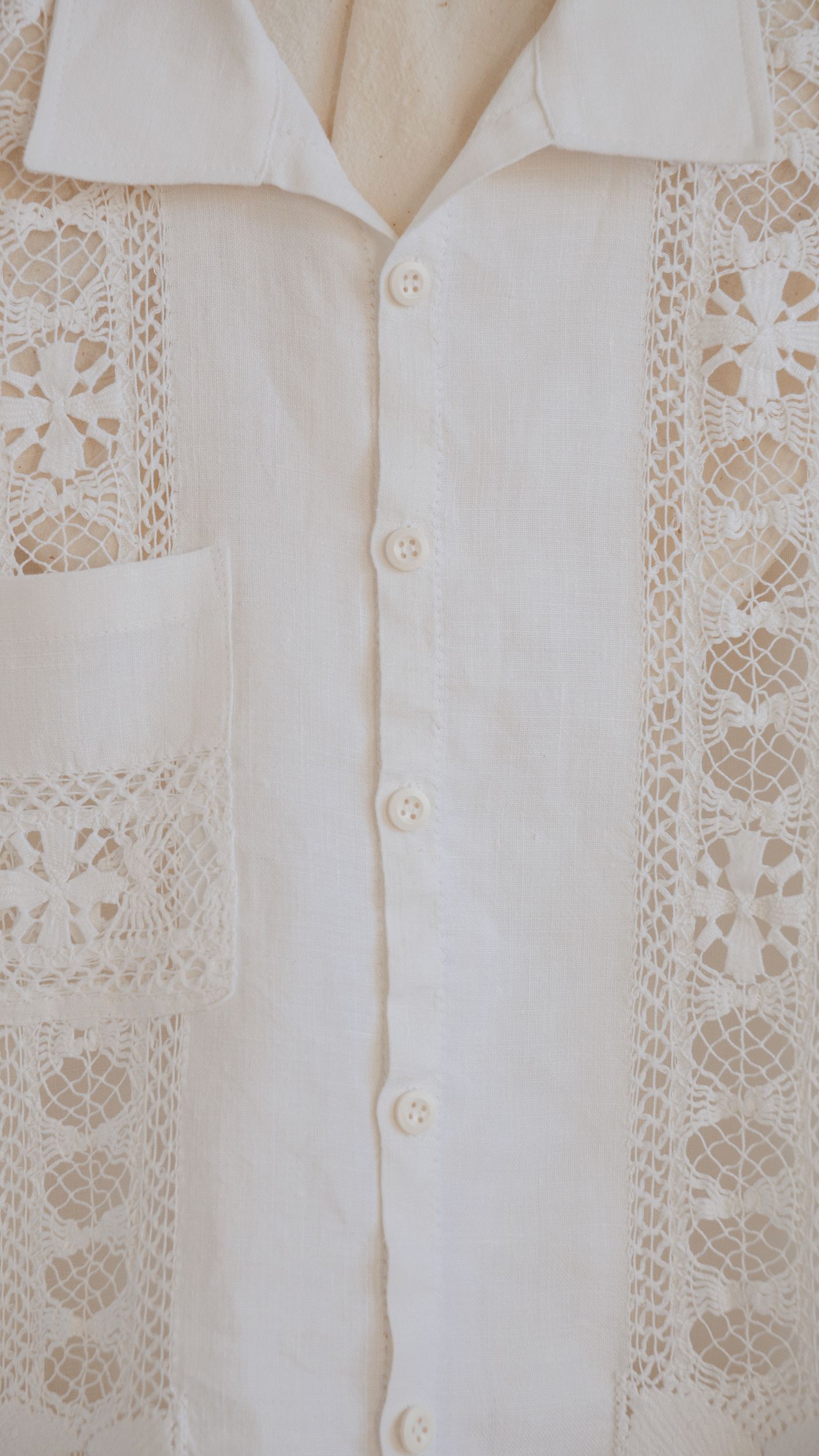 This one-of-a-kind short sleeve Shirt is made from a light cotton tablecloth, circa 1970s. Tablecloth was featured with a large floral criss-cross embroidery.