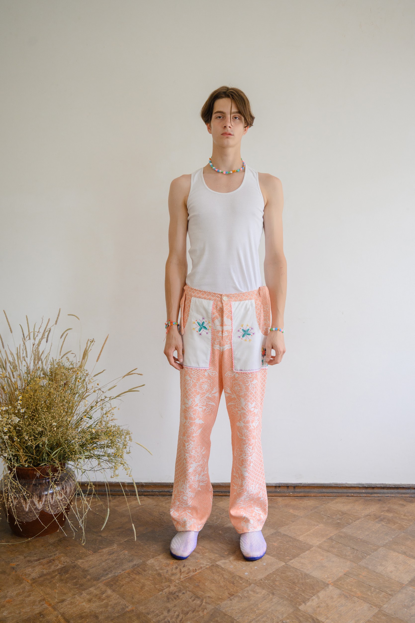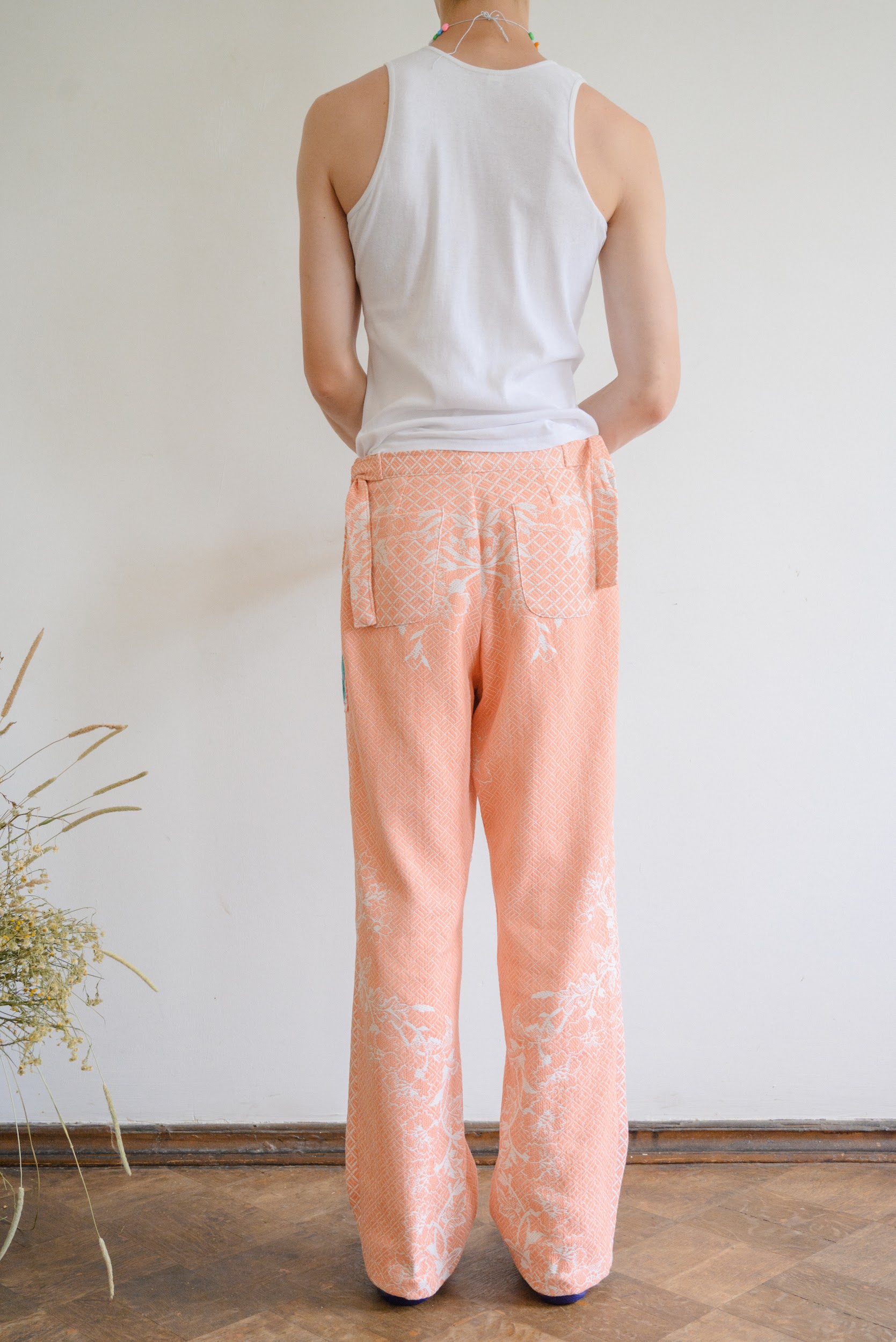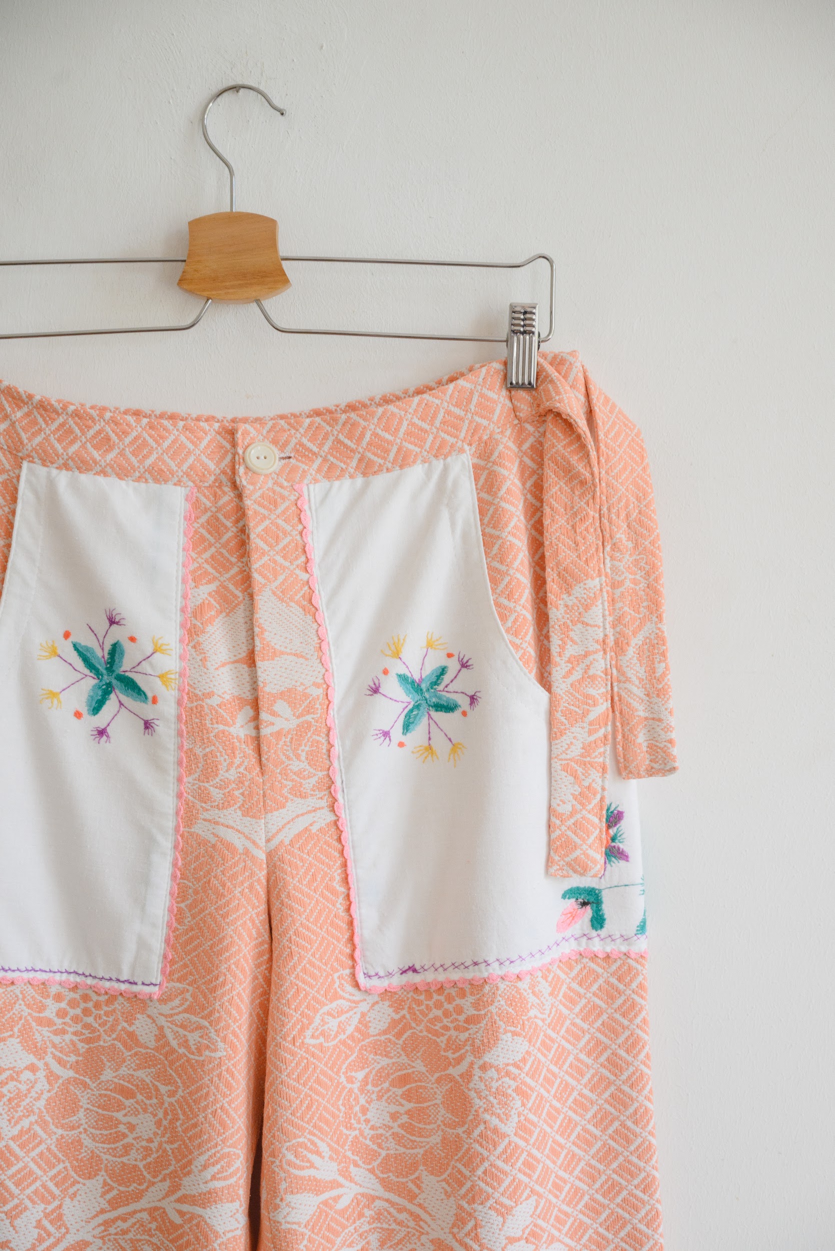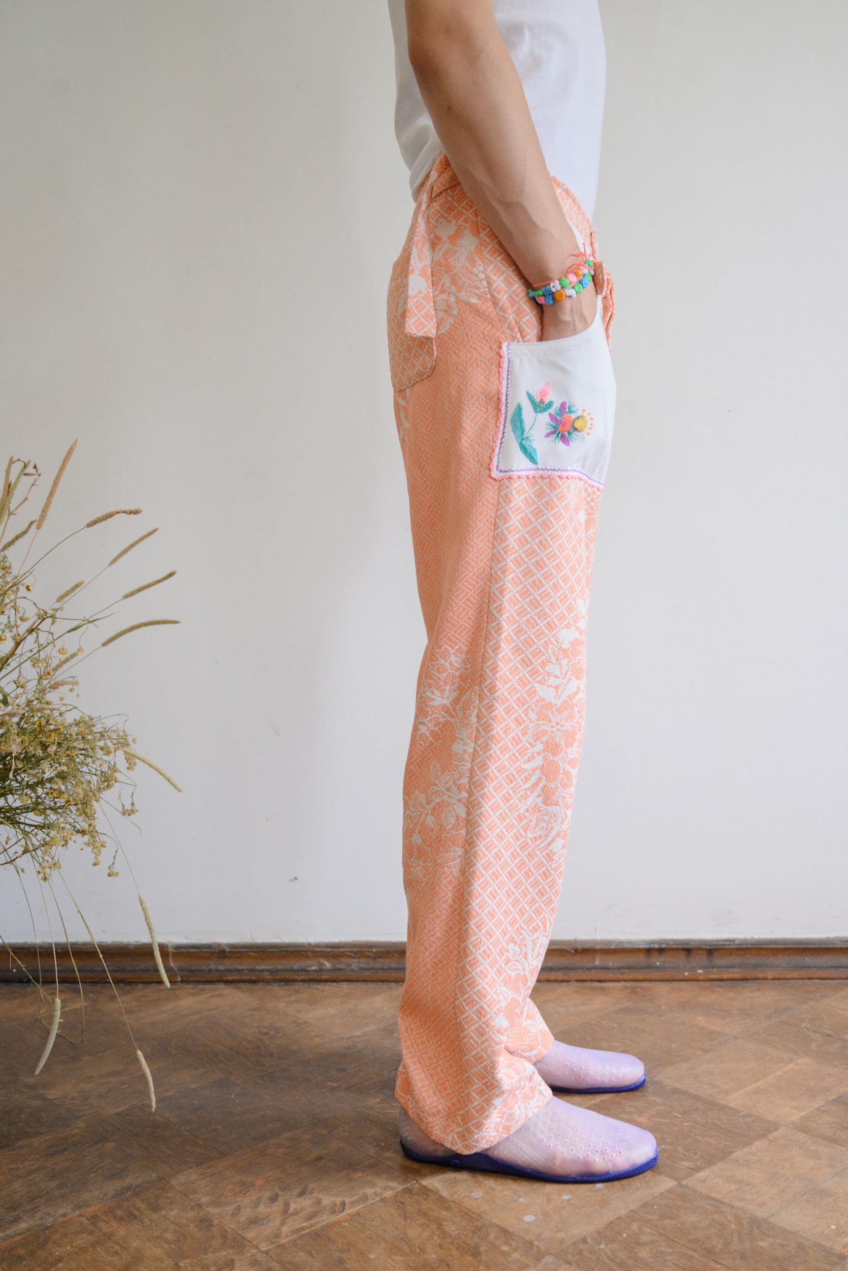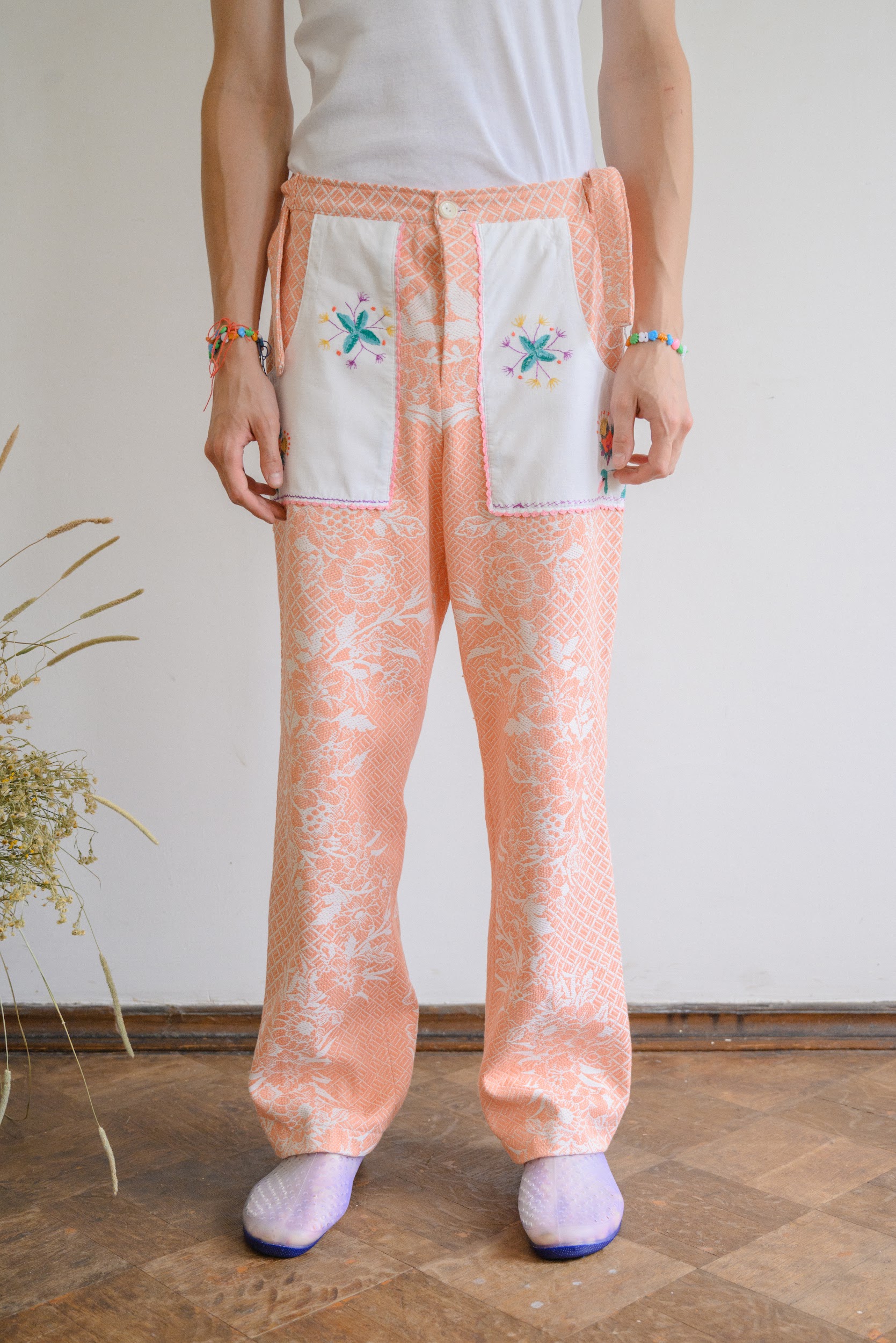Брюки сшиты из хлопкового покрывала с изображением цветов, периода 1960 годов. Карманы выполнены из салфеток украшенных ручной вышивкой гладью.