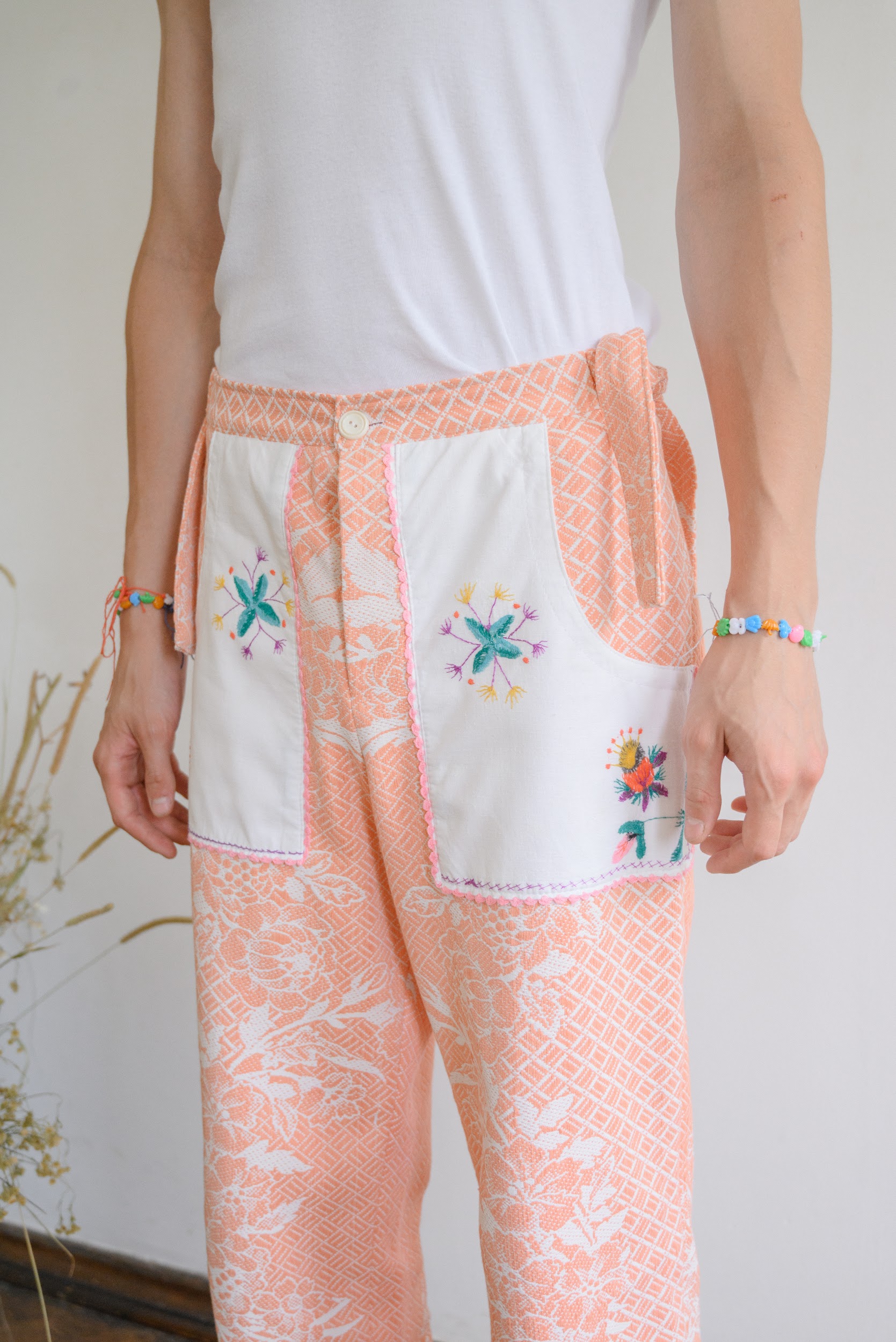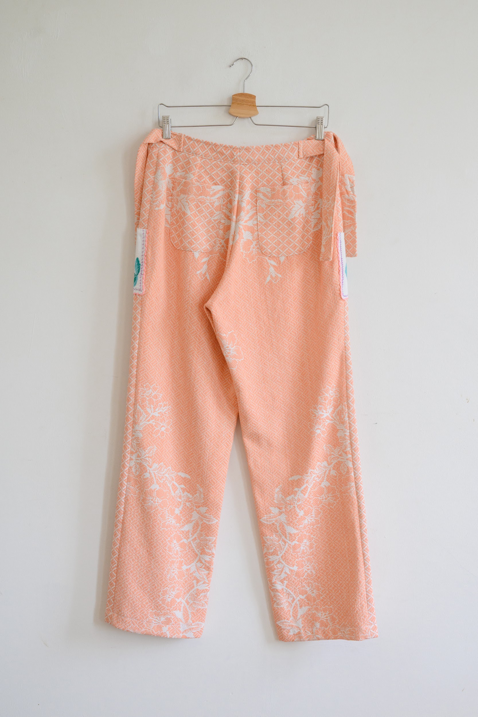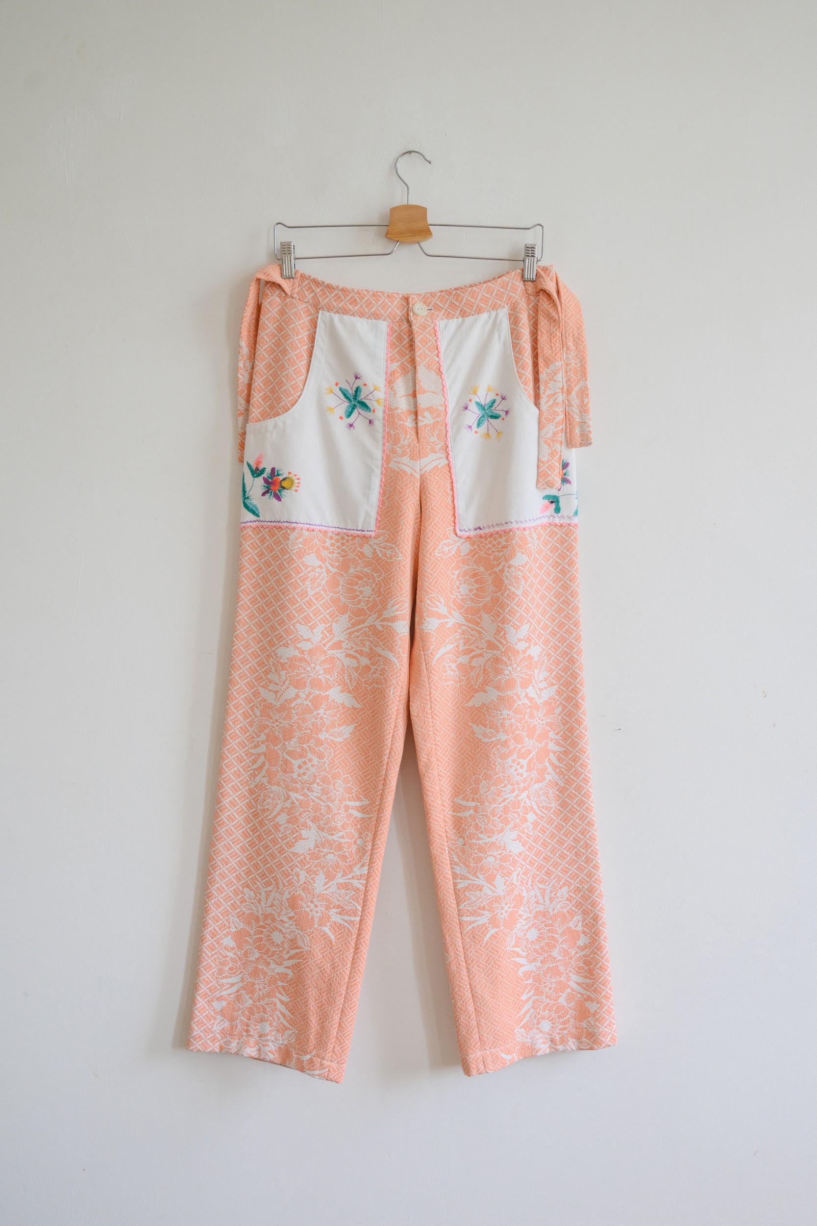 This one-of-a-kind Trousers are made from a cotton coverlet, circa 1960s. Coverlet woven with a floral pattern. Pockets are made from embroidered napkins.